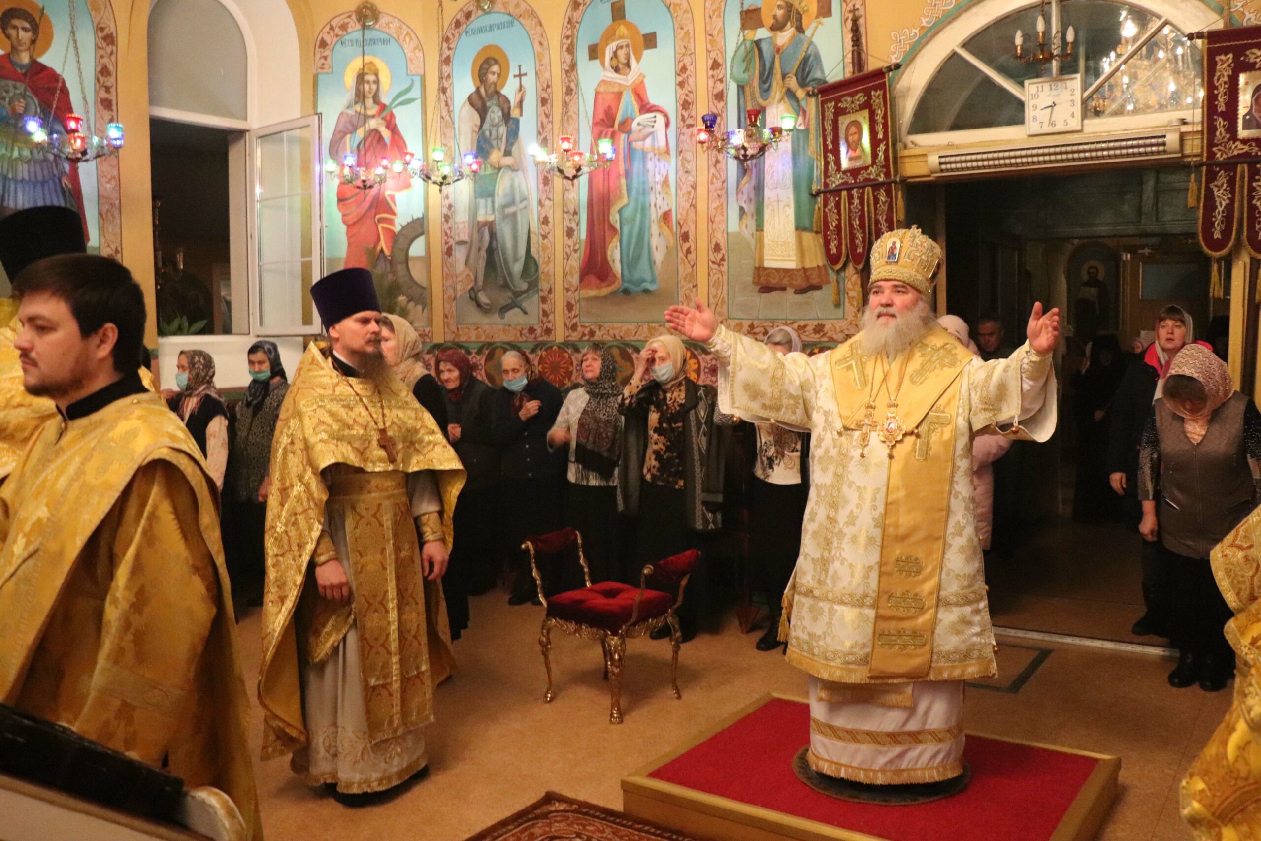 Бузулук. 5 января 2021 года, во вторник седмицы 31-й по Пятидесятнице, память мучеников, иже в Крите: Феодула, Саторнина, Евпора, Геласия, Евникиана, Зотика, Помпия, Агафопуса, Василида и Евареста (III); свт. Феоктиста, архиеп. Новгородского (1310); прп. Нифонта, еп. Кипрского (IV); прп. Павла, еп. Неокесарийского (IV); сщмч. Василия Спасского пресвитера и прмчч. Макария Миронова и Ионы Смирнова (1938), епископ Бузулукский и Сорочинский Алексий совершил Божественную литургию в храме Всех святых Бузулукского Свято-Тихвинский Богородицкого женского монастыря.