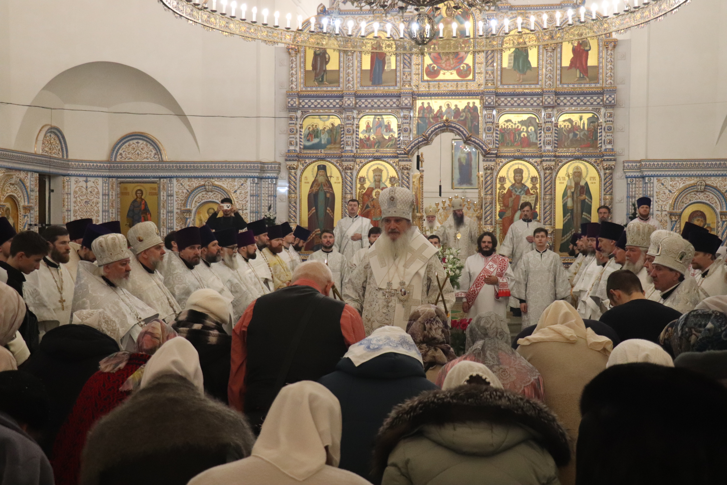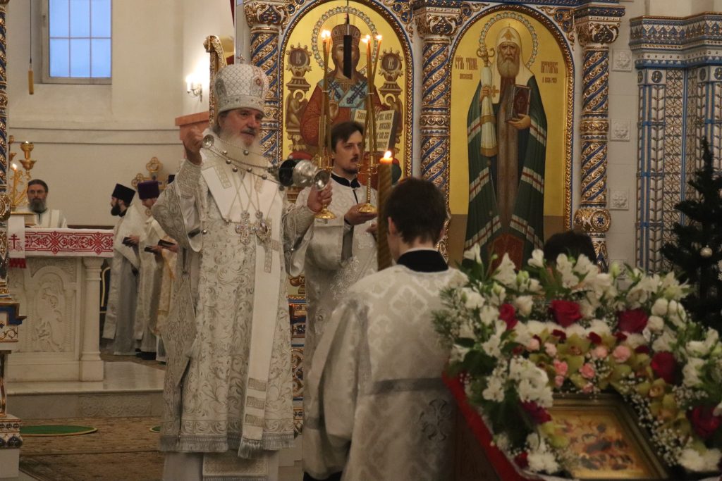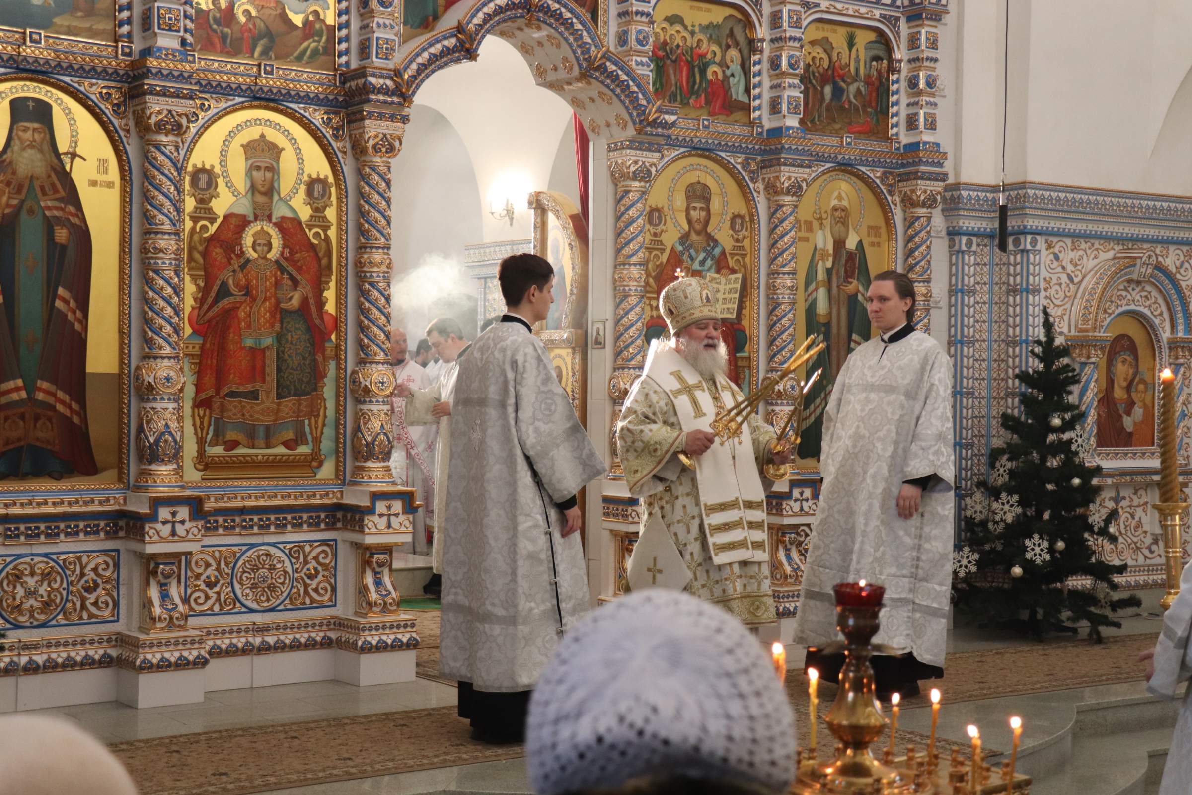 По заамвонной молитве было совершено славление празднику, архипастырь поздравили молящихся с великим праздником Рождества Христова.