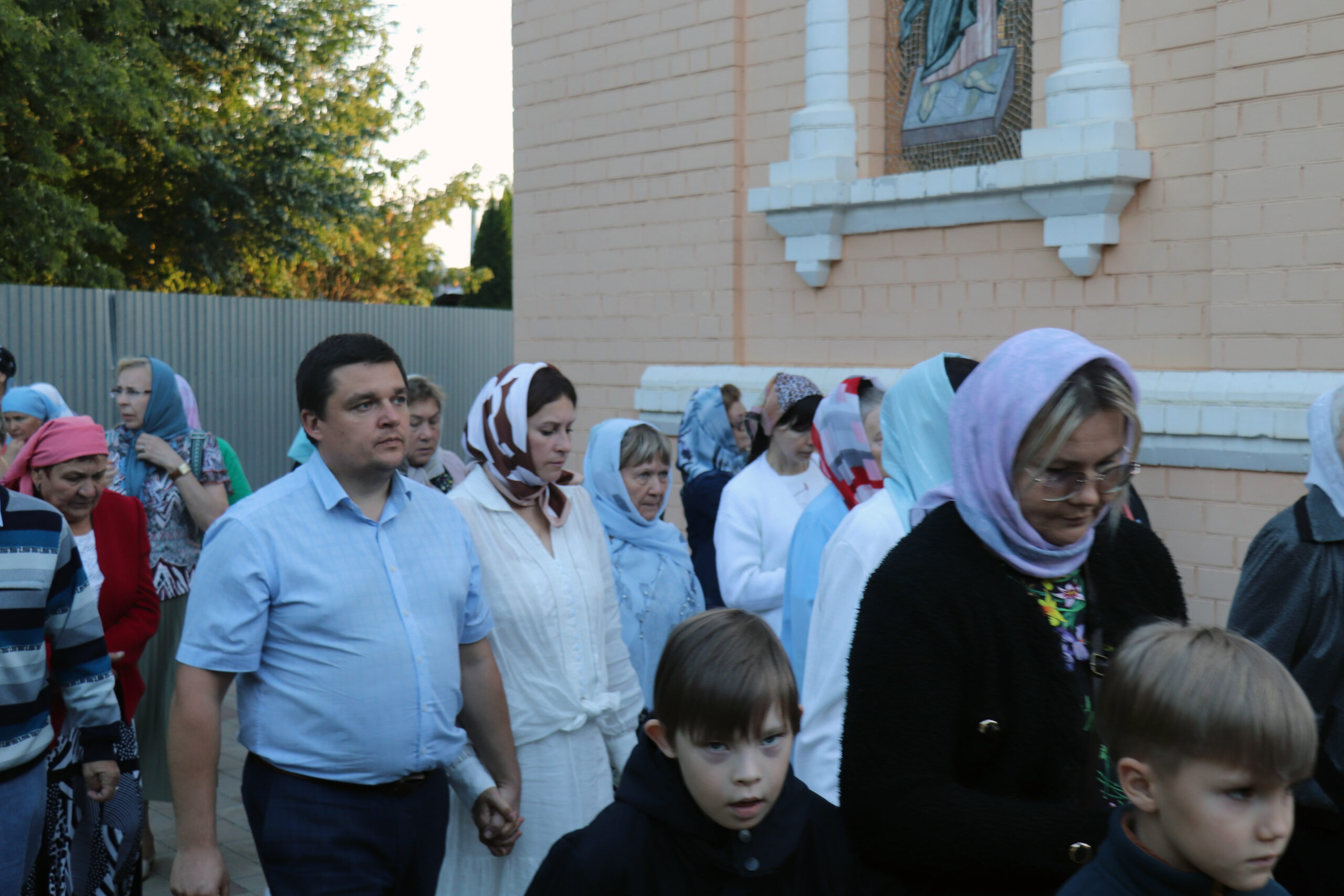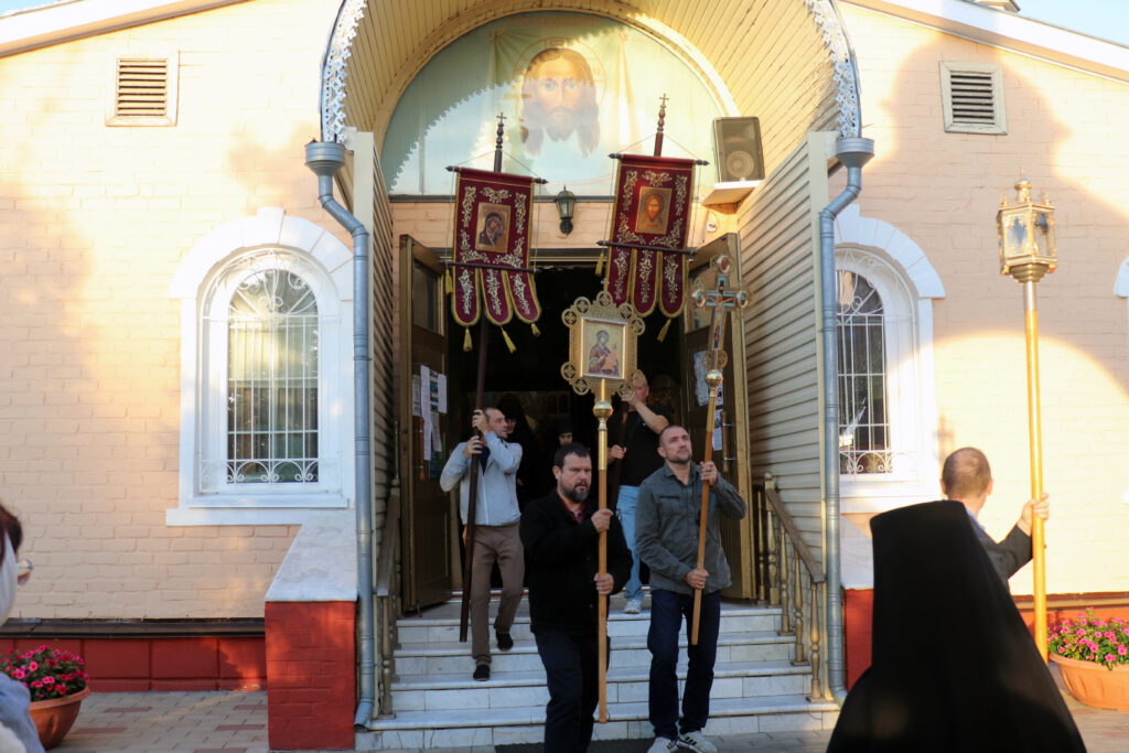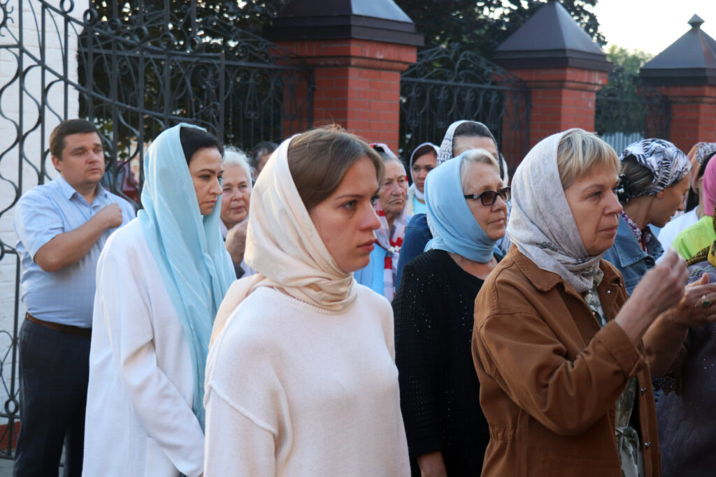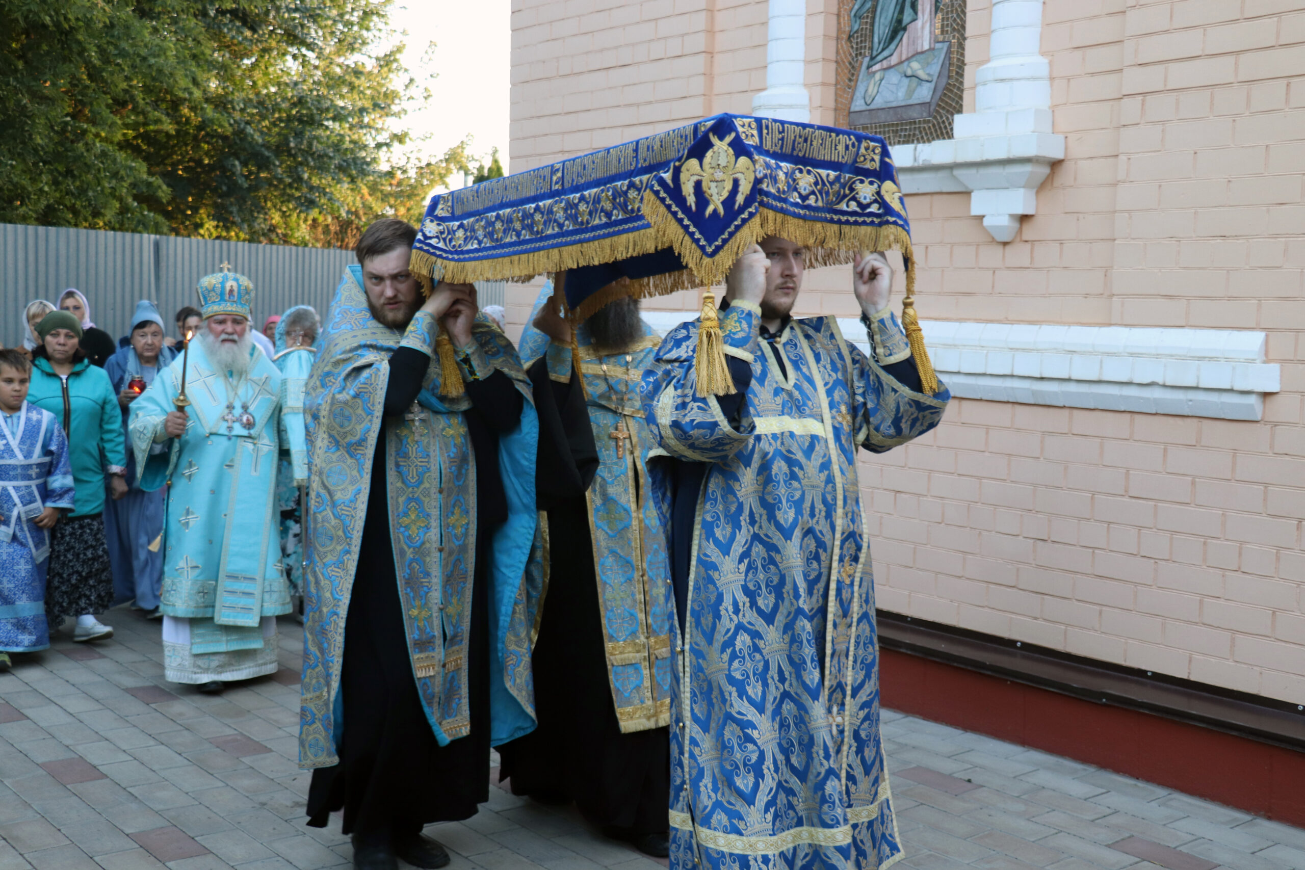 На всенощном бдении после великого славословия Плащаница с изображением Богородицы была пронесена крестным ходом вокруг храма.