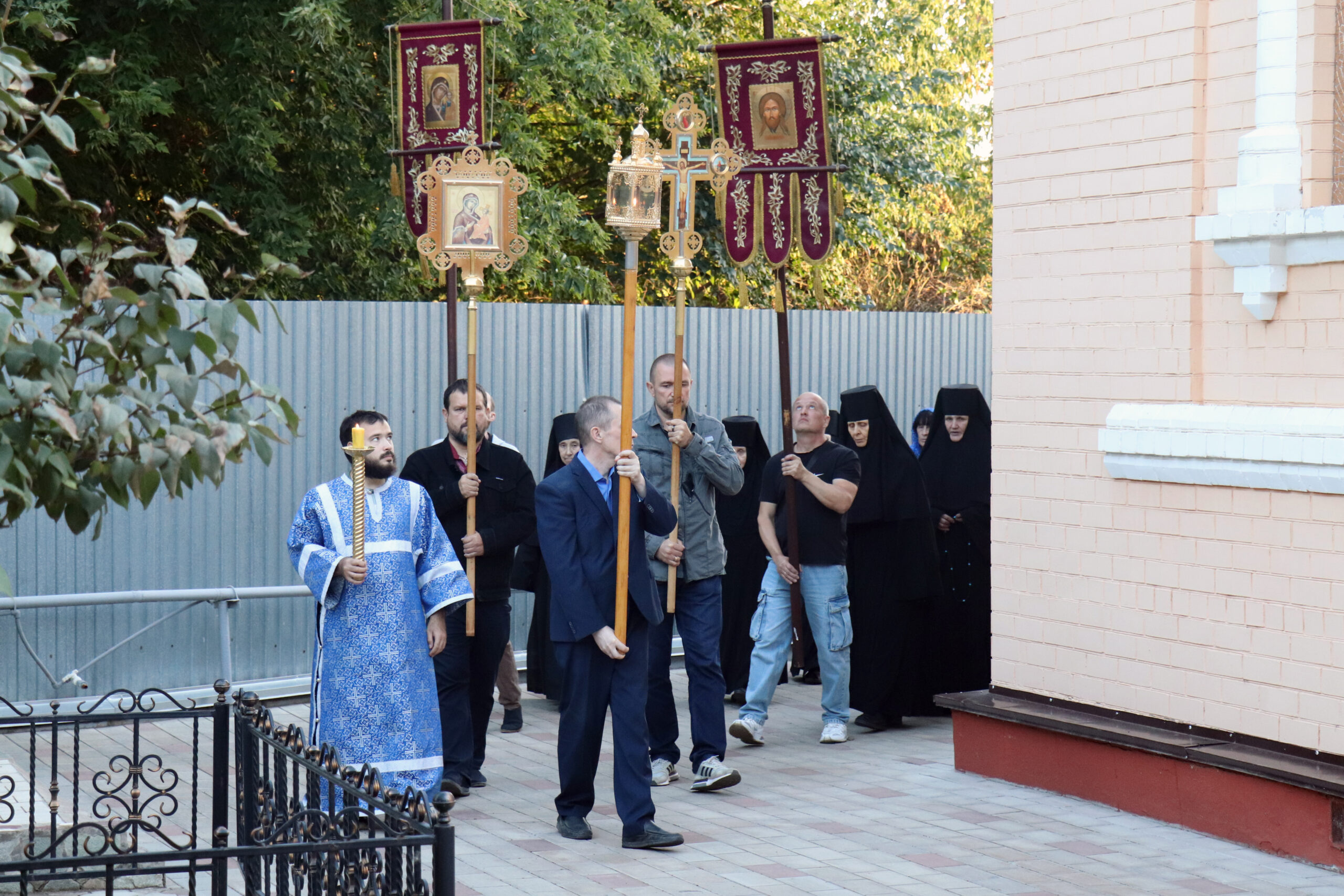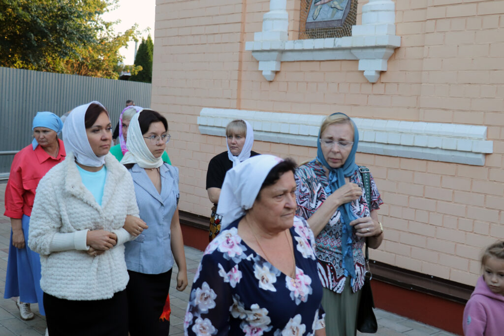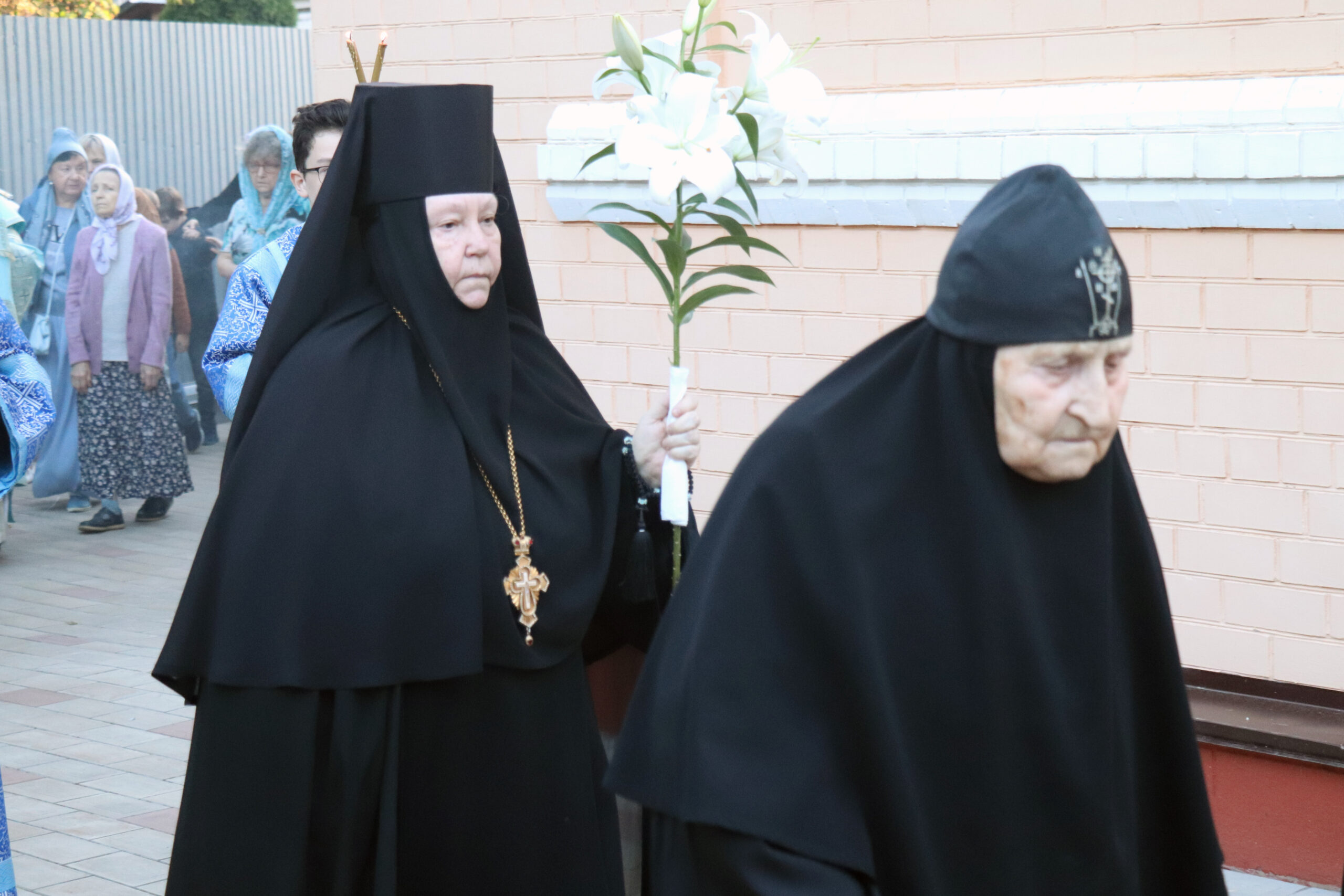 На всенощном бдении после великого славословия Плащаница с изображением Богородицы была пронесена крестным ходом вокруг храма.