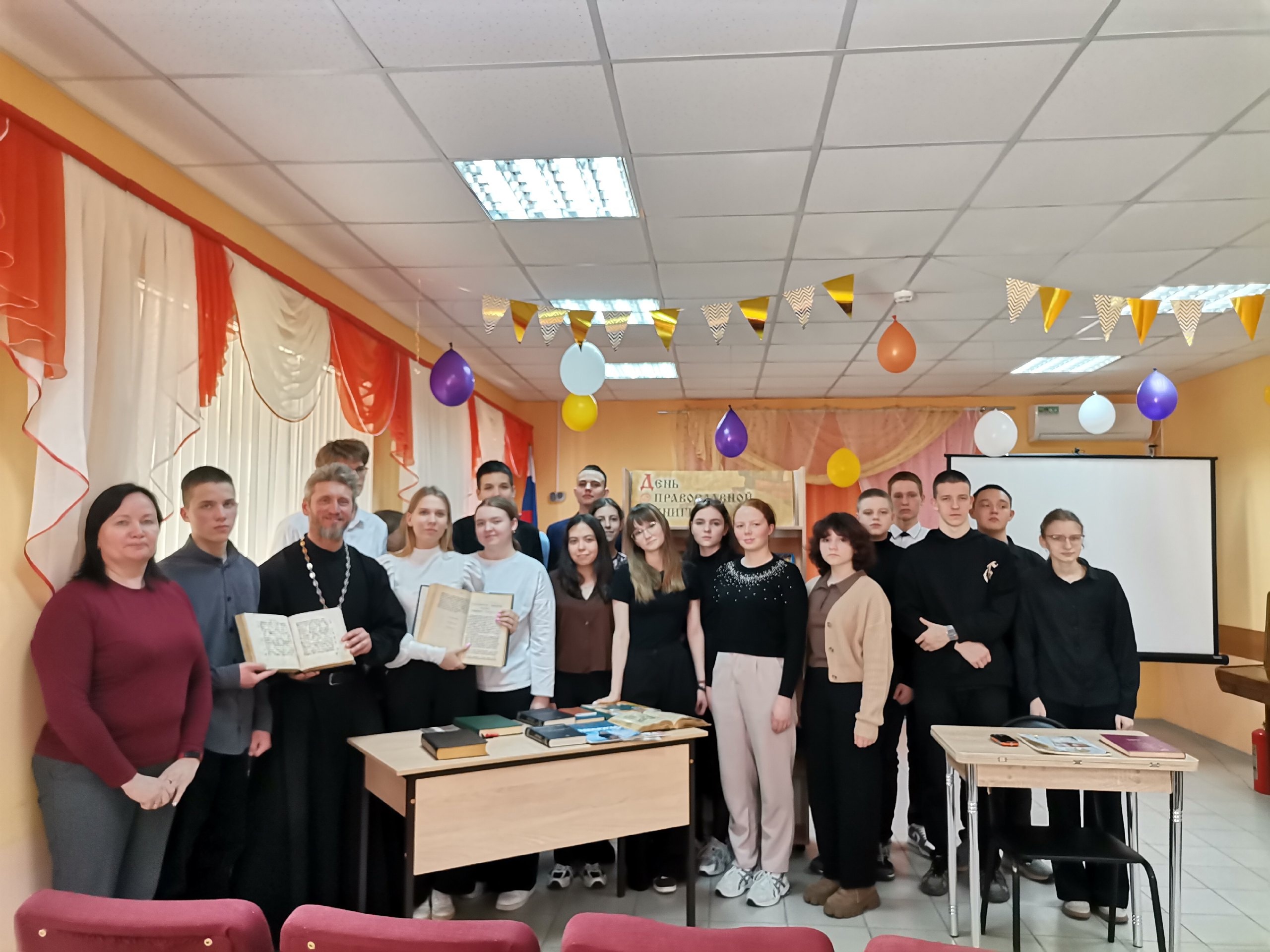 Учащиеся 9 «Б» класса, классный руководитель Елена Валерьевна Концевая, приняли активное участие, задавали вопросы. школьники смогли прикоснуться к древним источникам знаний — Псалтирь и Евангелие. С интересом рассматривали журнал «Фома», рукописные книги, молитвословы.