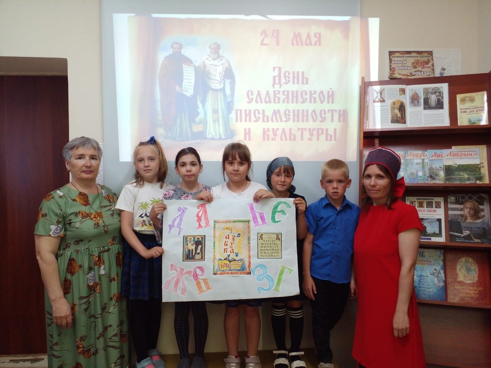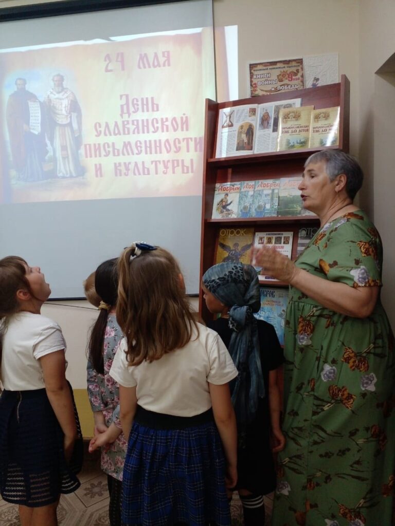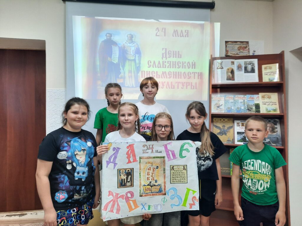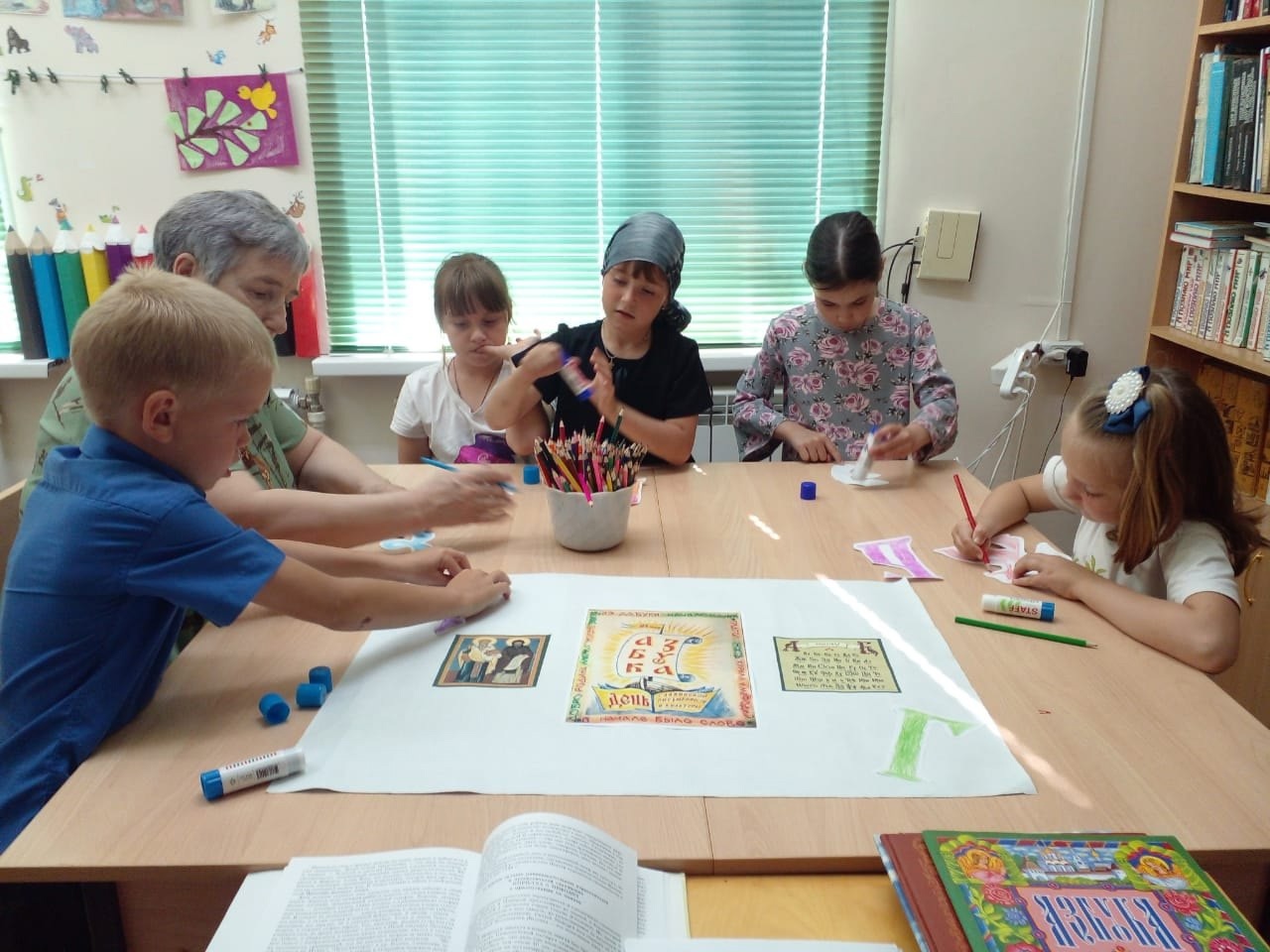 Юлия Михайловна рассказала о святых Кирилле и Мефодии, о том, как они создали азбуку. Ребята попробовали писать слова на церковнославянском языке, а Анна Сергеевна сделала с ними стенгазету, посвящённую Дню славянской письменности и культуры.