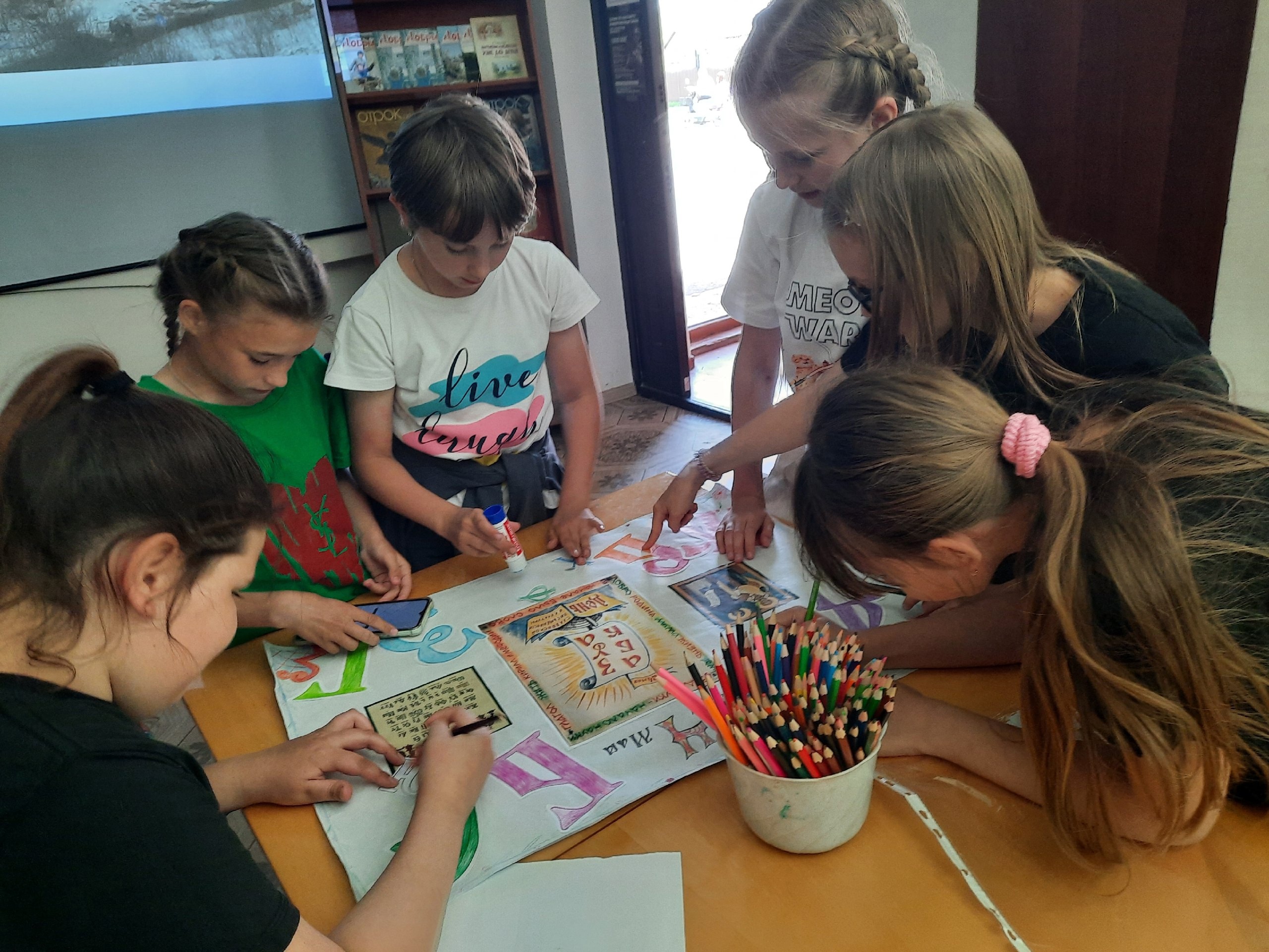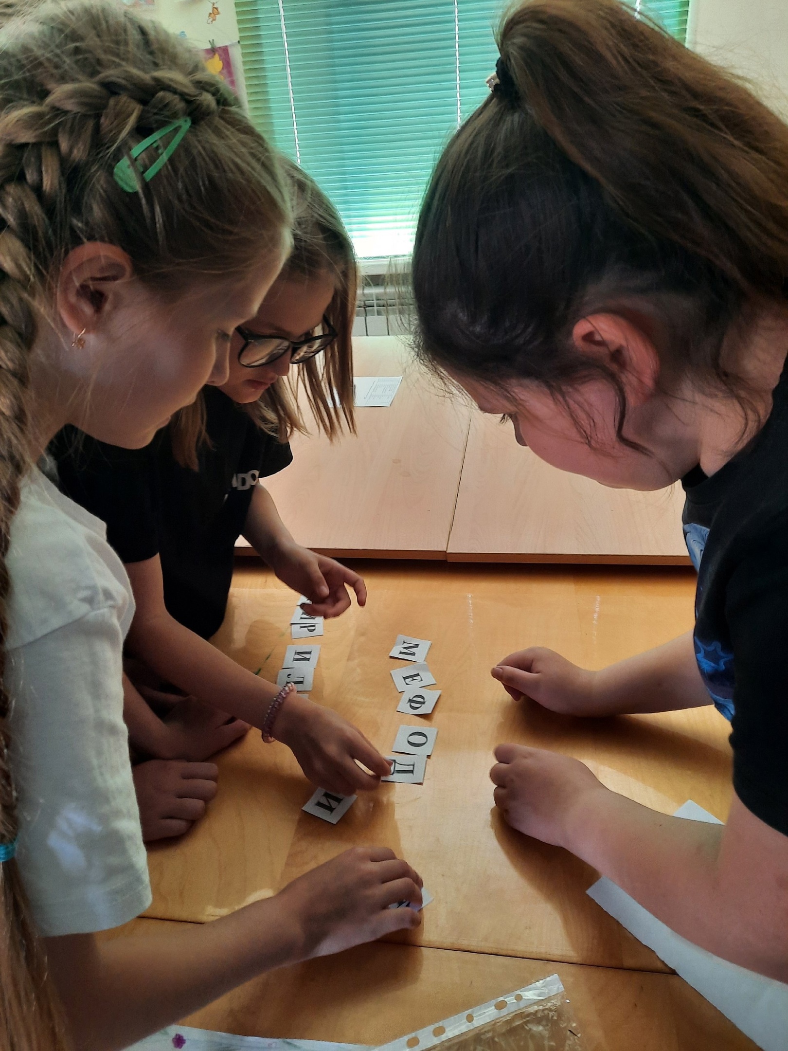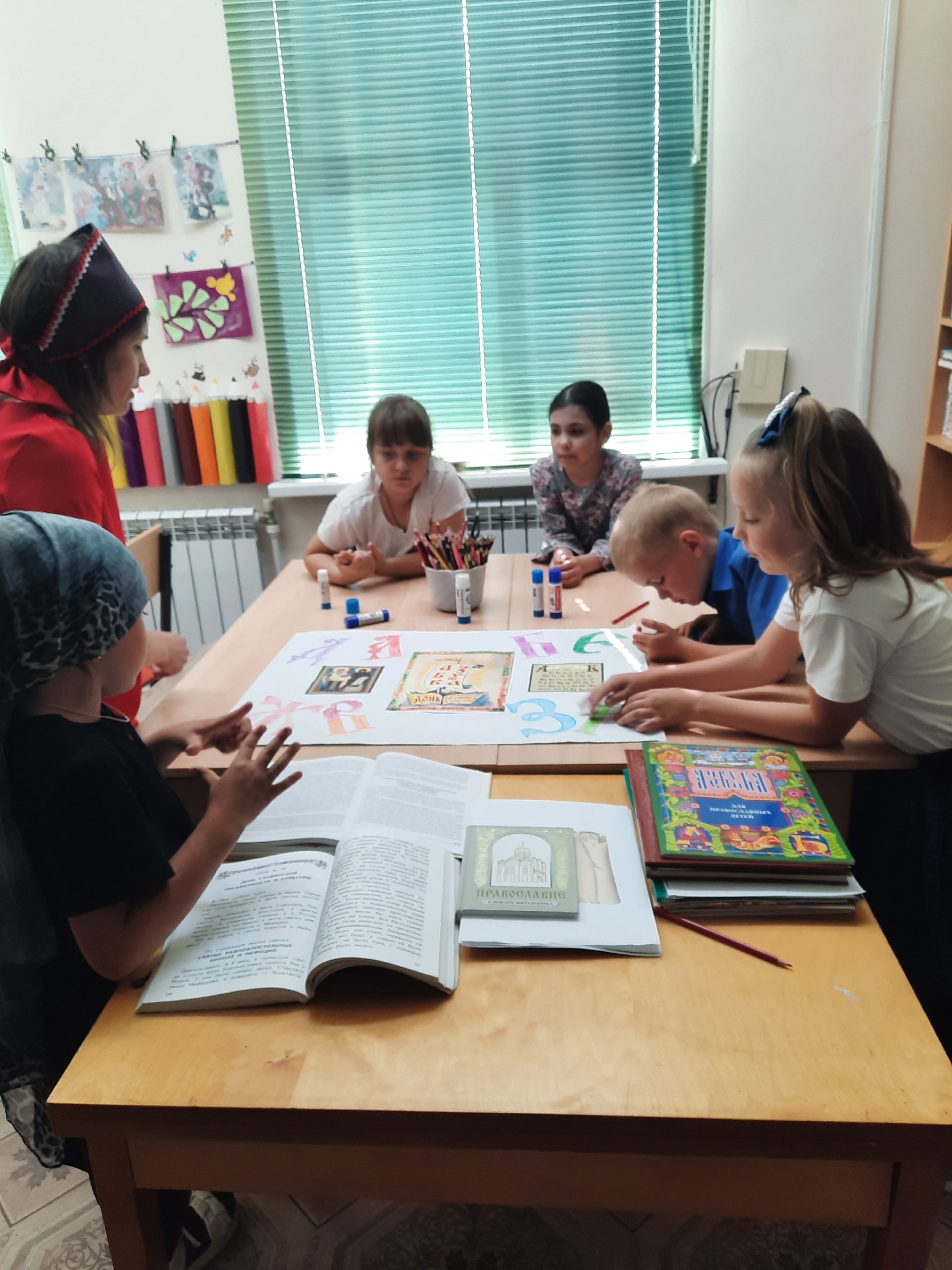 Юлия Михайловна рассказала о святых Кирилле и Мефодии, о том, как они создали азбуку. Ребята попробовали писать слова на церковнославянском языке, а Анна Сергеевна сделала с ними стенгазету, посвящённую Дню славянской письменности и культуры.