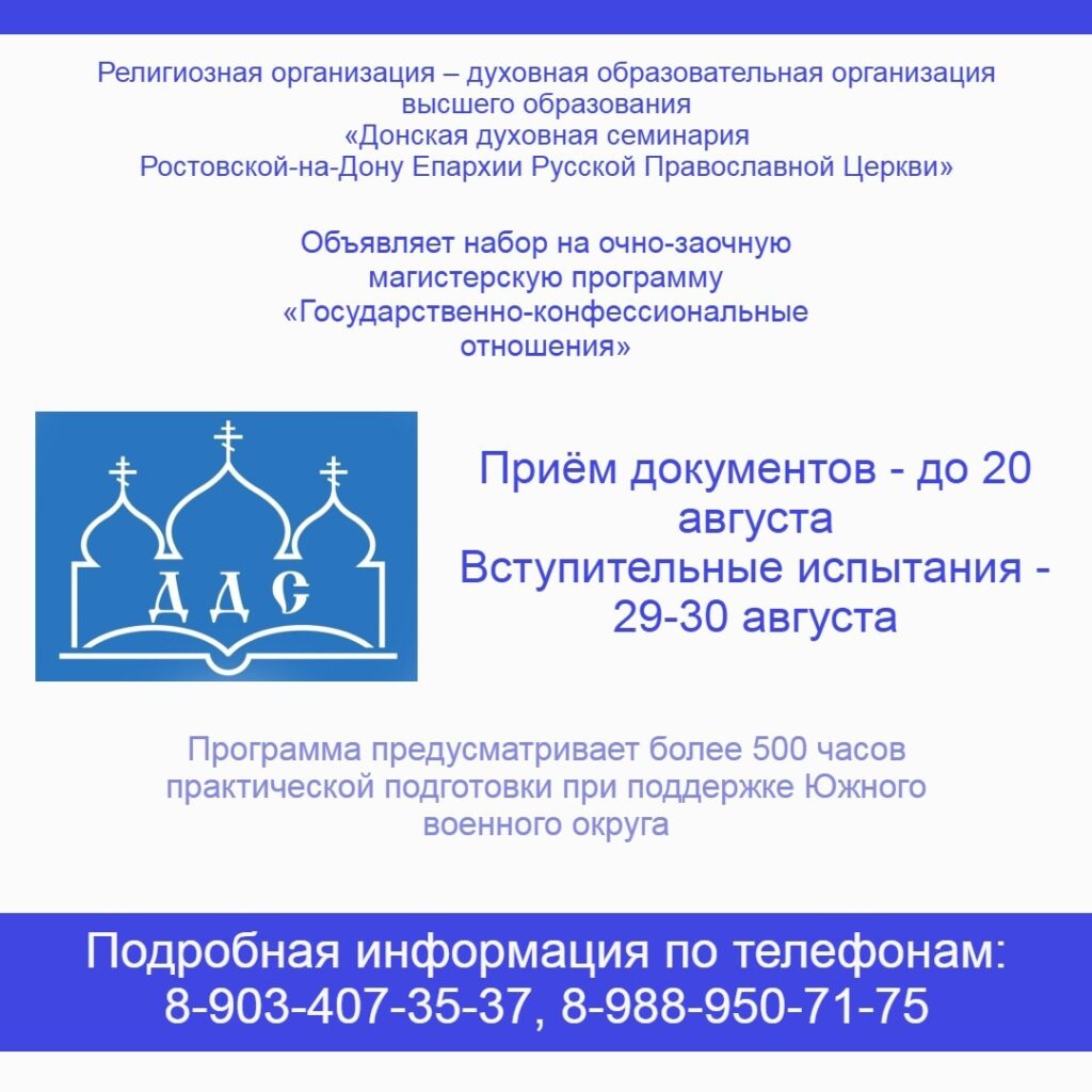 По благословению Святейшего Патриарха Московского и всея Руси КИРИЛЛА и во исполнение решений Архиерейского Совещания Русской Православной Церкви от 19 июля 2023 года Донская духовная семинария открывает набор на магистерскую программу «Государственно-конфессиональные отношения» с дополнительным модулем военно-пастырской направленности.