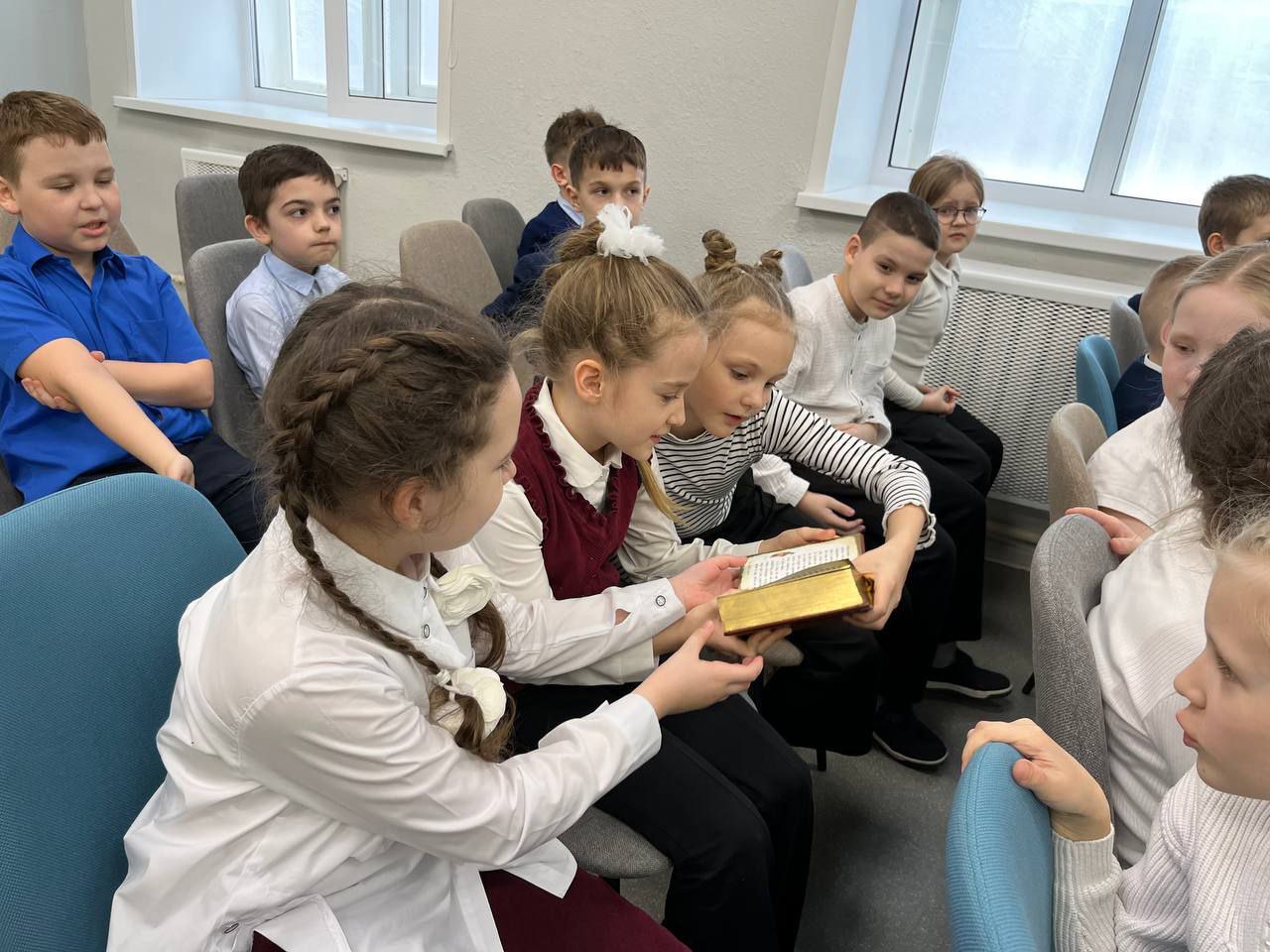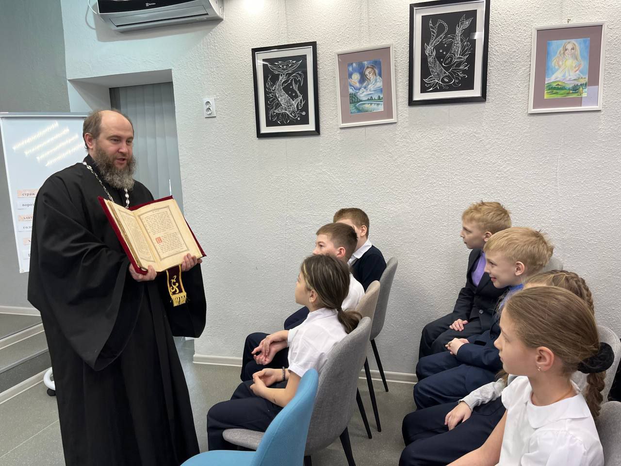 Иерей Максим Заико рассказал о значении православной книги в духовно-нравственном воспитании человека, о том, какой след в душе человека может оставить печатное духовное слово, какой неисчерпаемый источник мудрости и благодати представляет собой православная книга. Ребята с интересом разглядывали старинную книгу «Евангелие», принесенную из храма, отвечали на вопросы священника и задавали свои. Все желающие получили в подарок от отца Максима книгу «Святое Евангелие».