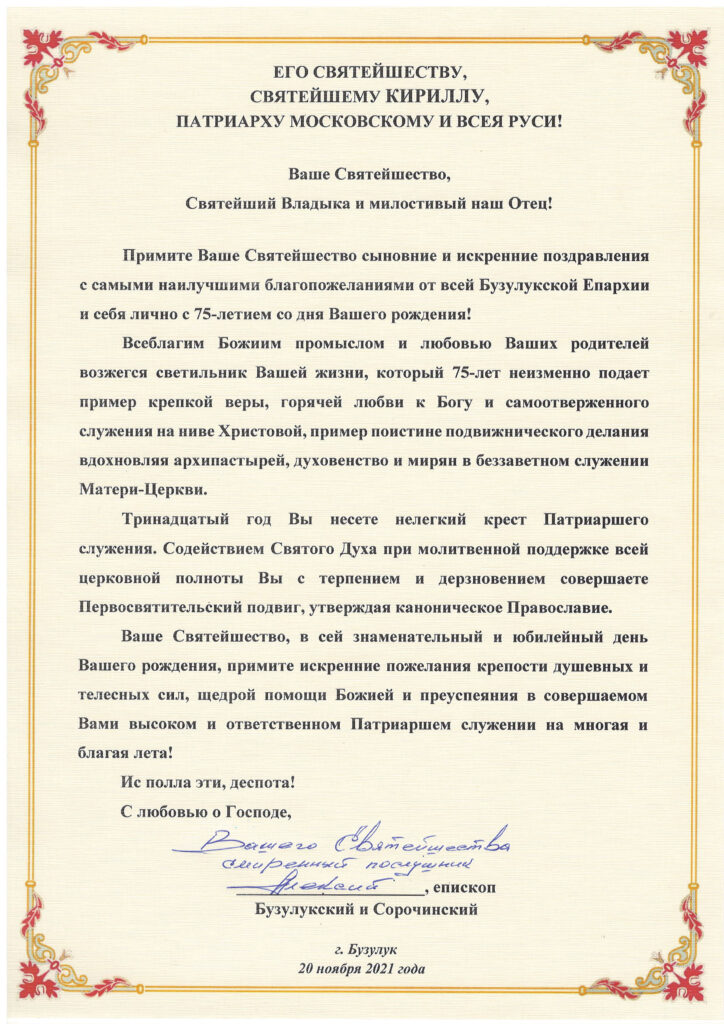 Примите, Ваше Святейшество, сыновние и искренние поздравления с самыми наилучшими благопожеланиями от всей Бузулукской епархии и смиренного послушника Вашего Святейшества с 75-летием со дня Вашего рождения!