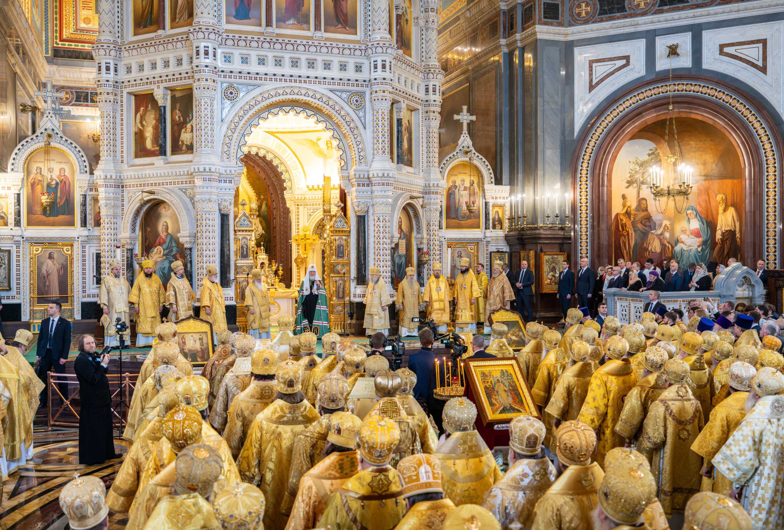 В этот знаменательный день Святейший Патриарх Кирилл совершил Божественную литургию в кафедральном соборном Храме Христа Спасителя в Москве в интронизационных облачениях и с копией жезла святителя Петра.