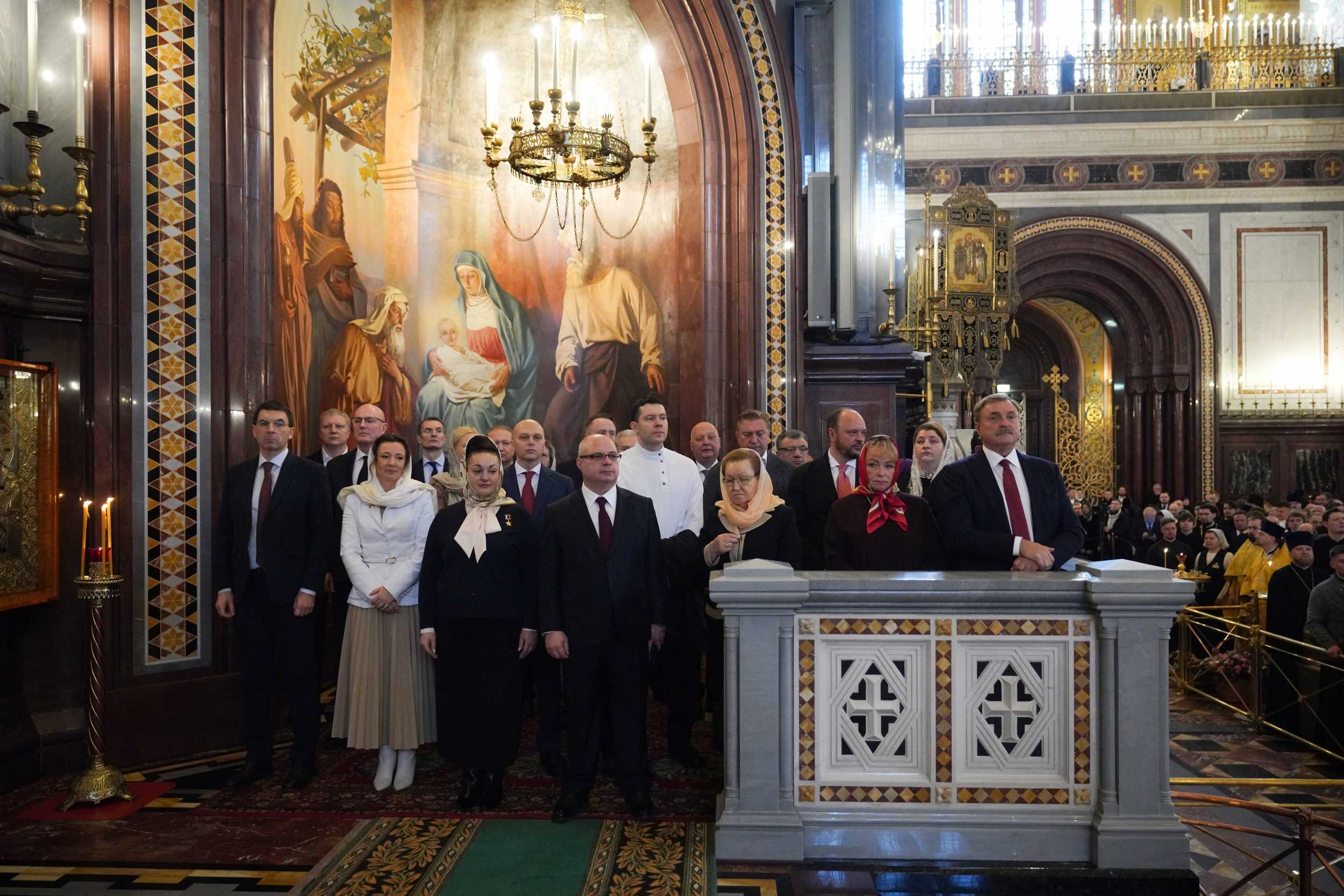 В галерее Храма Христа Спасителя Предстоятеля Русской Церкви поздравили участники движения «Патриаршие добровольцы».