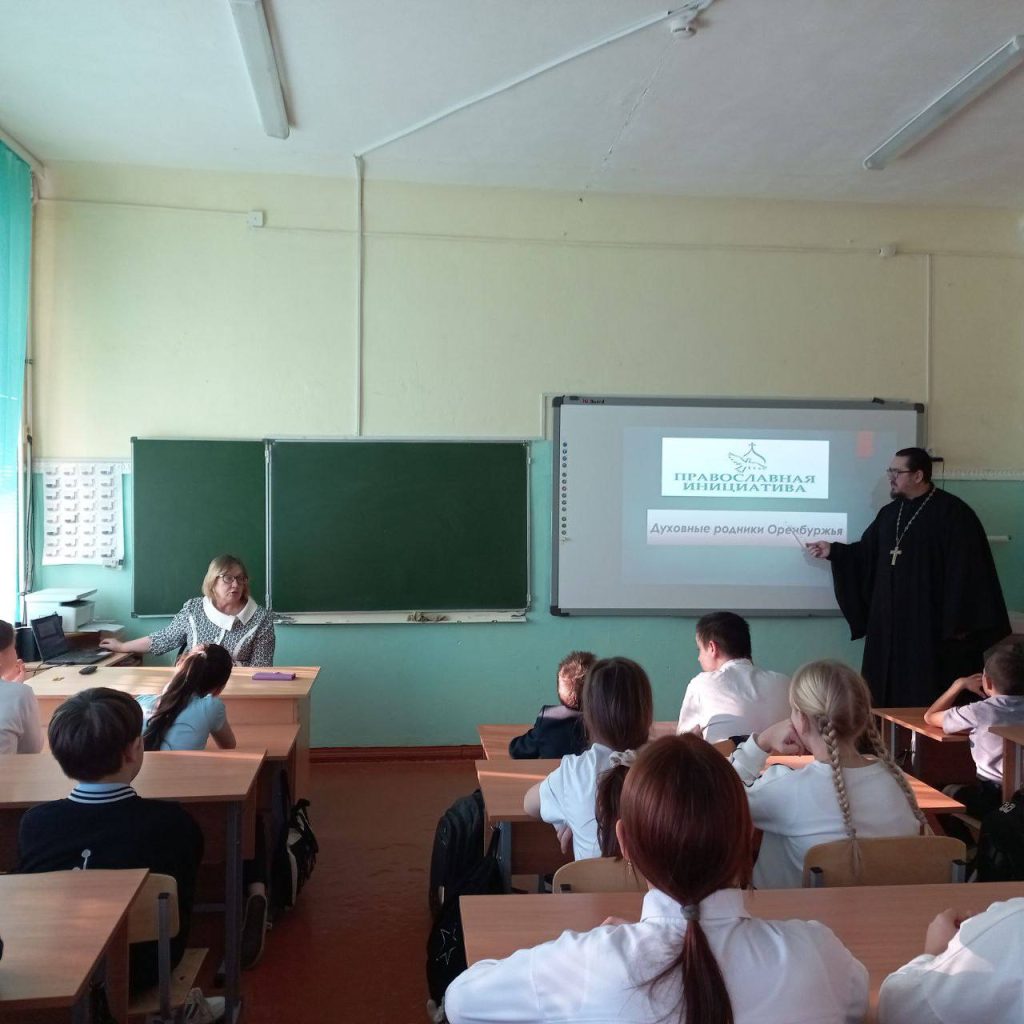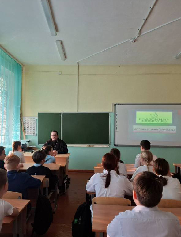 На встрече обсудили вопросы о взаимодействии между церковью и школой, а затем, на открытом уроке, показали ученикам проект – православная инициатива «Духовные родники Оренбуржья» и рассказали детям о святынях Оренбургского края. Священник ответил на все интересующие вопросы.