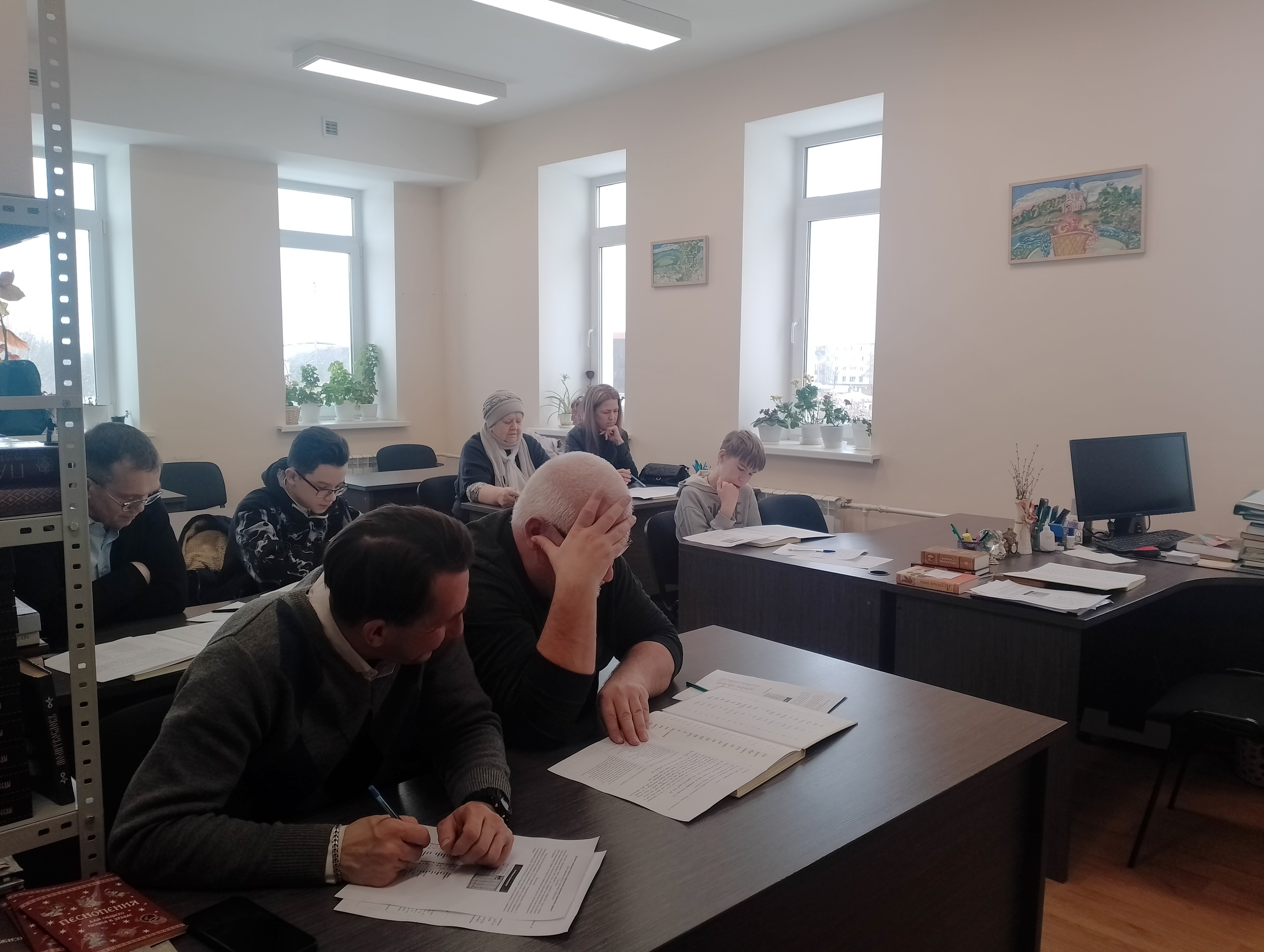 Первое занятие по церковнославянскому языку было посвящено знакомству, изучению буквиц, звуков, кратким историческим сведениям о языке, практическому чтению, разбору, переводу шестопсалмия (3 псалом).