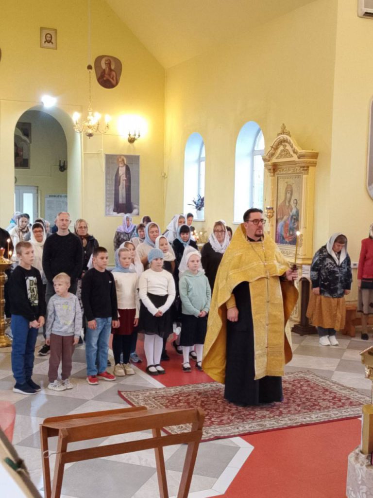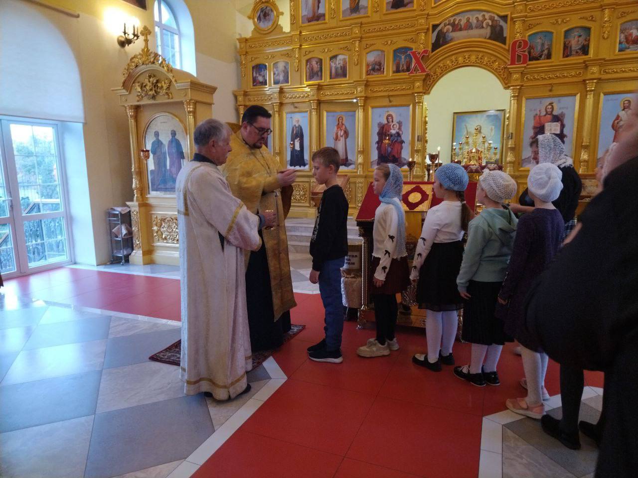 В ответном слове родители поздравили духовника и преподавателей с наступающим Днём учителя, пожелали помощи Божией в работе и творческих успехов! Между занятиями дети помолились на богослужении и помазались святым елеем.