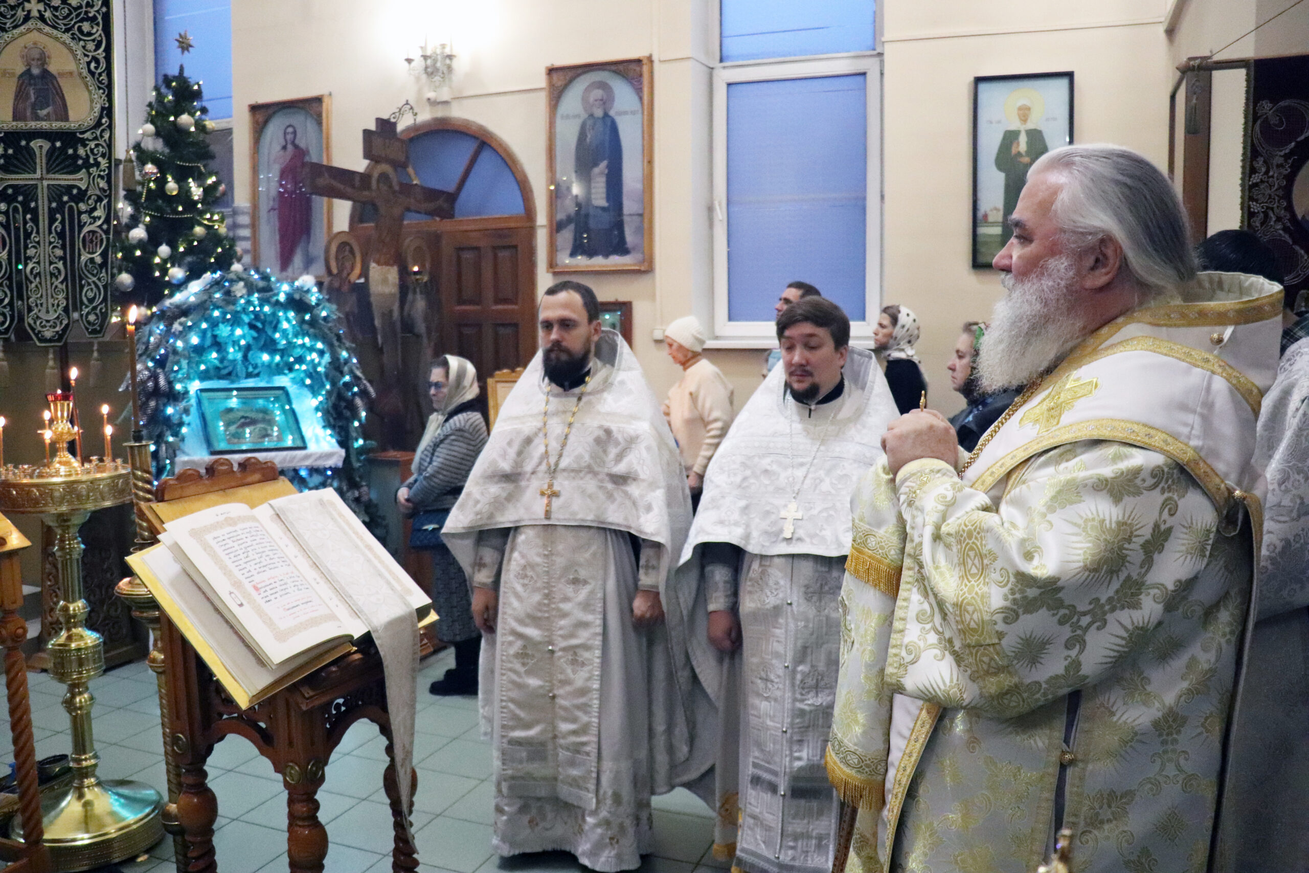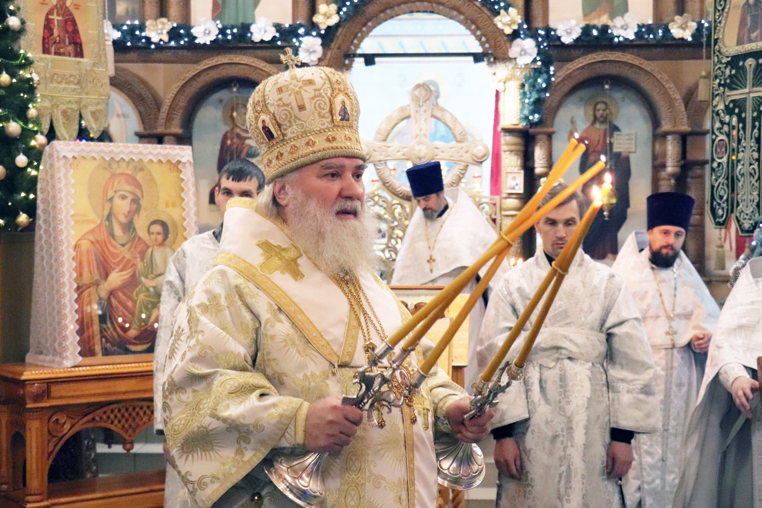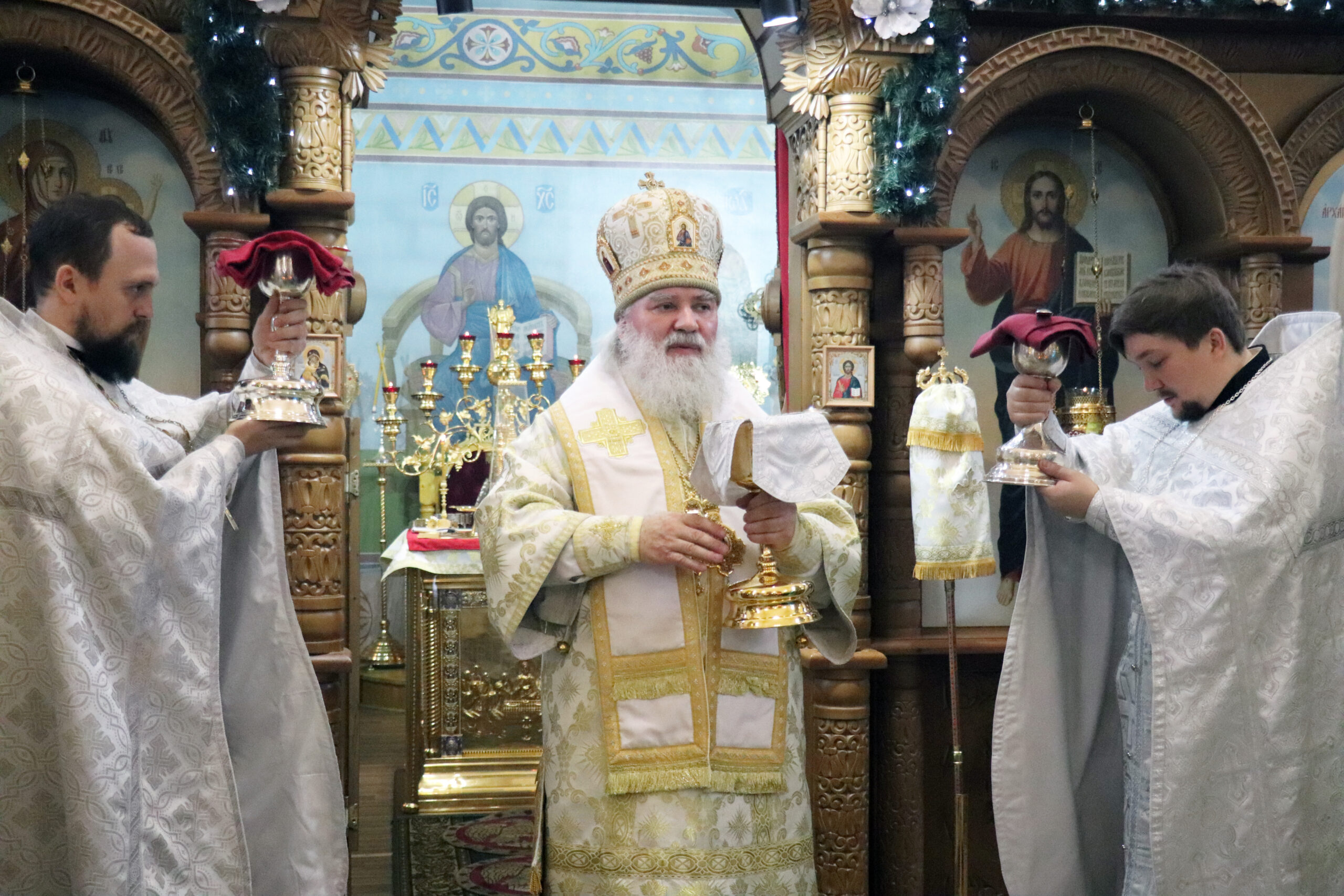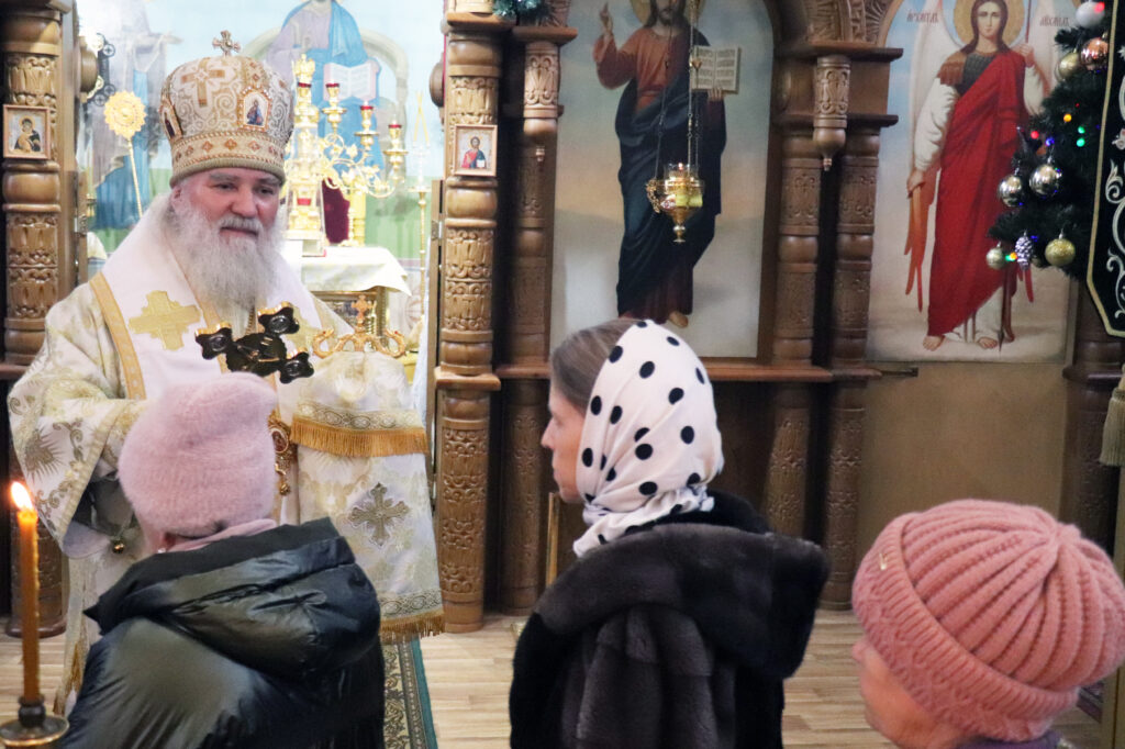 После Божественной литургии Владыка Алексий обратился к прихожанам с проповедью: «Во имя Отца и Сына и Святого Духа. Приветствую вас отцы, братья и сестры, с Рождественским сочельником. Мы уже приблизились к Рождеству Христову. Как видите, в конце службы по уставу пропели перед свечой тропарь и кондак уже в предвкушении Рождества Христова. И вся служба сегодня, которая называется Навечерие, особенная она приводит нас вплотную к празднику Рождества Христова.