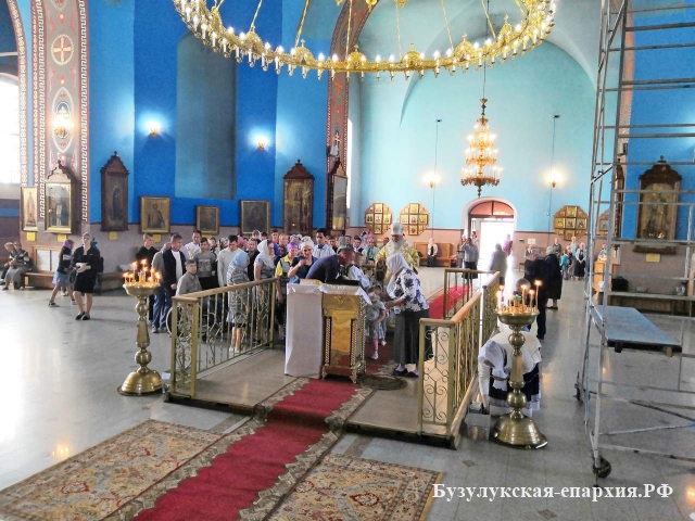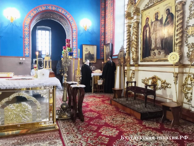 Вечером воскресного дня правящий архиерей совершил вечернее богослужение с чтением Акафиста Успению Пресвятой Богородицы в Преображенском храме Свято-Троицкого кафедрального собора г. Бузулука.