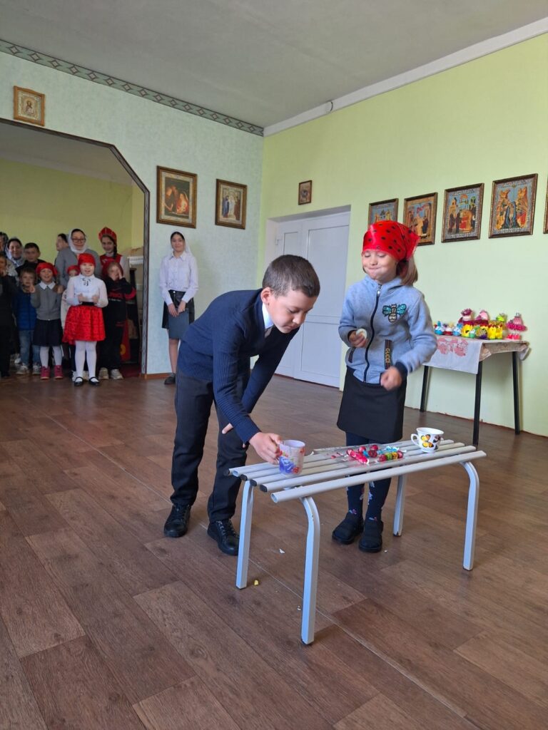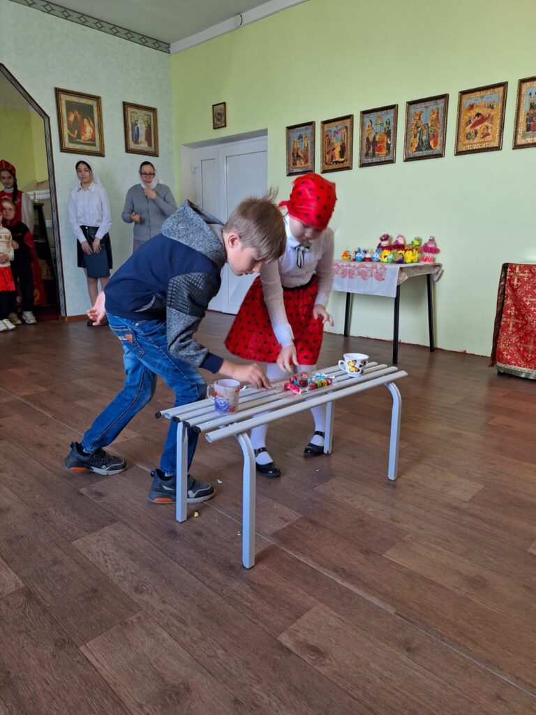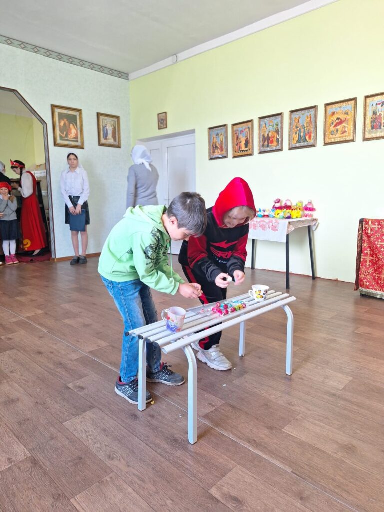 Дети исполняли пасхальные песни, играли в игры, загадывали загадки, разыгрывали небольшие сценки, ну и конечно, не обошлось без ежегодного конкурса – традиционный бой с отцом Антонием крашеными яйцами. Правила просты: у кого не разобьется яйцо – тот и выиграл. И хотя батюшка, в очередной раз, запасся гусиными яйцами, но под напором детской отваги, был вынужден признать поражение.