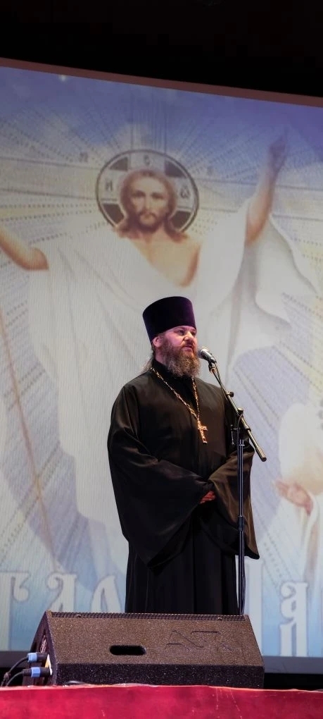 Для благословения концерта и приветствия на сцену приглашается благочинный Бугурусланского и Асекеевского округов, настоятель храма Успения Пресвятой Богородицы иерей Алексий Анисимов. Отец Алексий тепло и сердечно поздравил всех присутствующих с большой радостью – Воскресением Господа нашего Иисуса Христа, с Пасхой Господней.