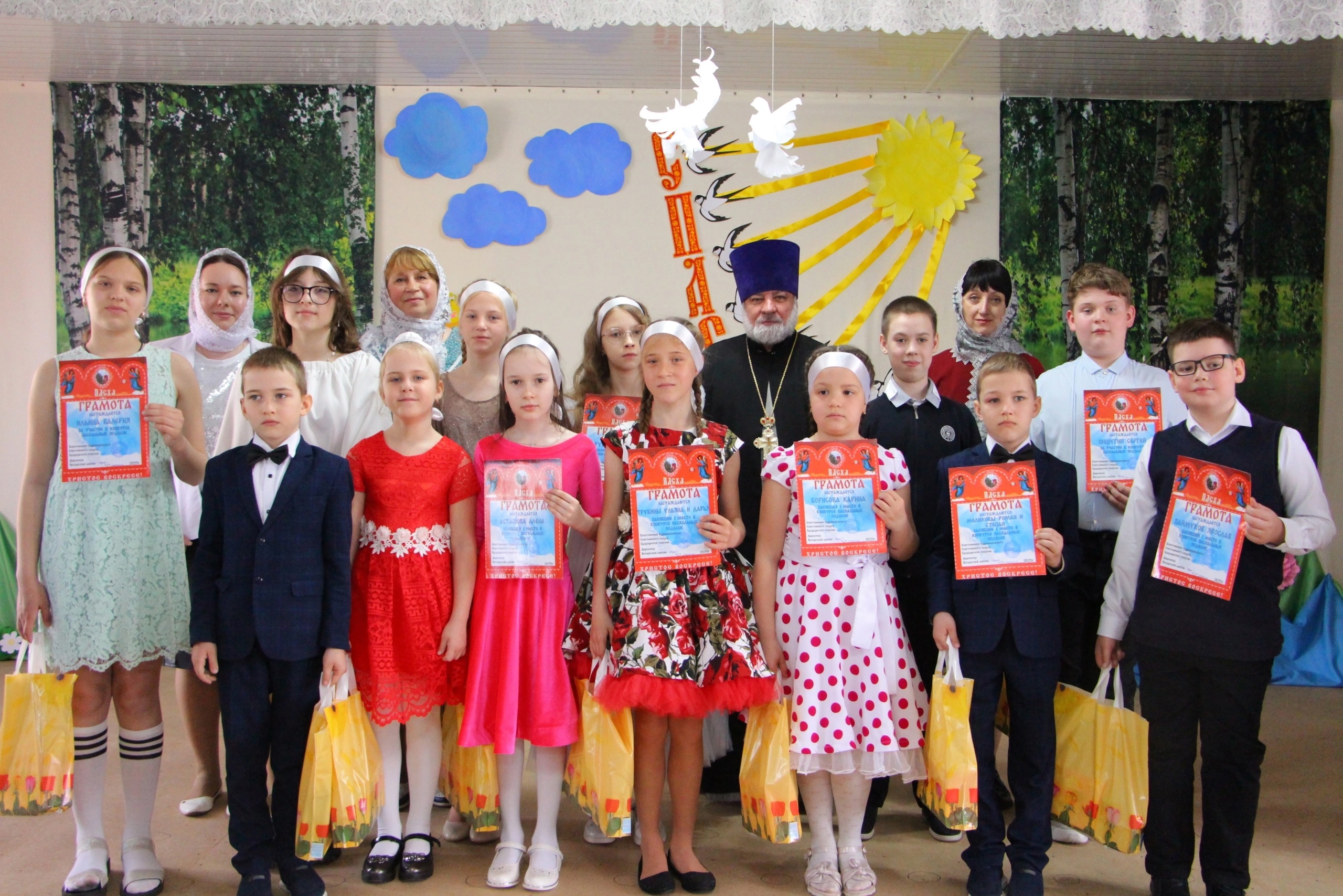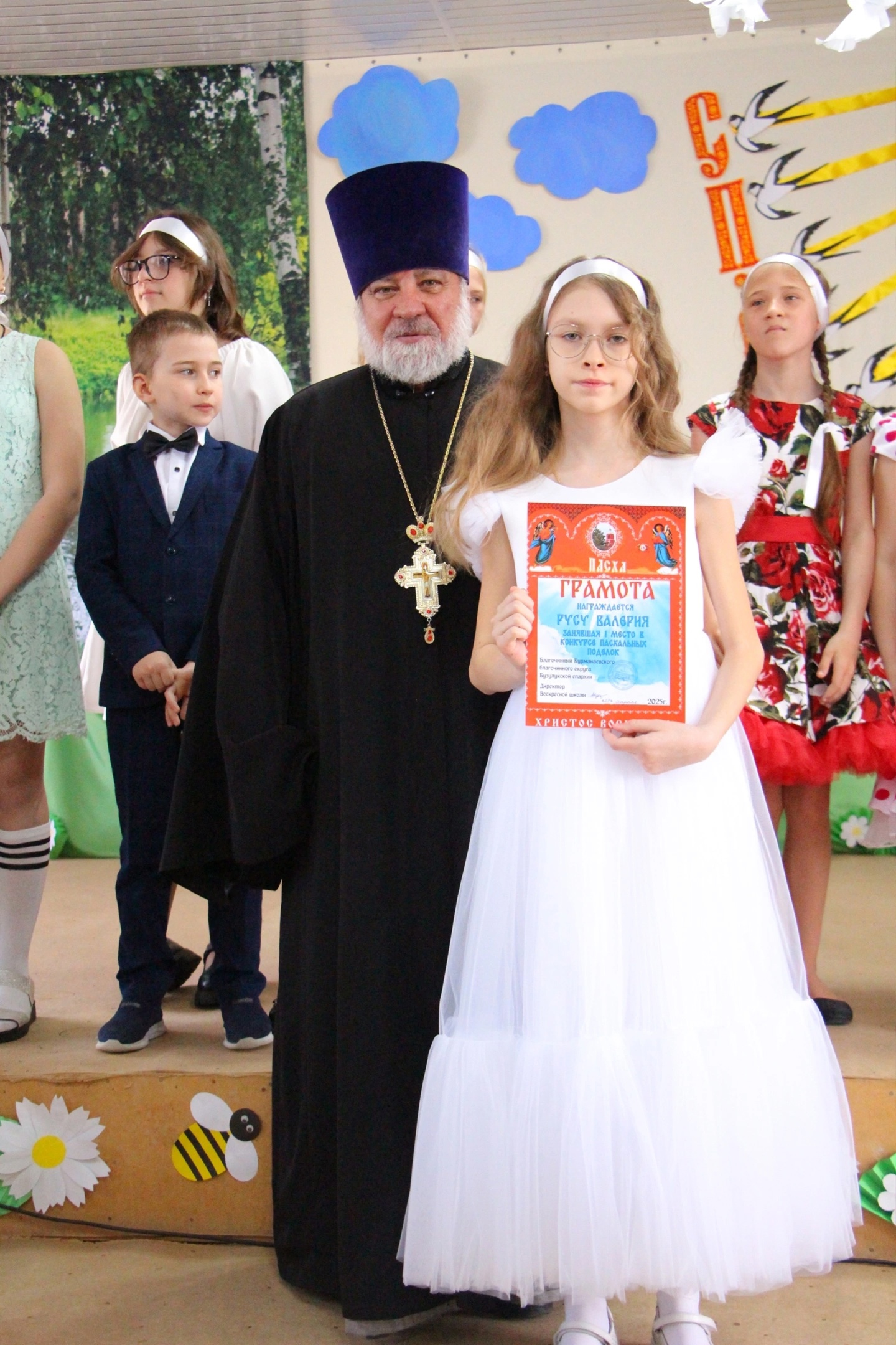 Музыкальными номерами зрителей порадовали Сергей Пищугин, Валерия Ильина, Борисова Карина и другие ребята. Особую атмосферу мероприятию придала конкурсная выставка “Пасхальные поделки”, где были представлены творческие работы воспитанников воскресной школы. Победителям и участникам конкурса отец Георгий вручил грамоты.