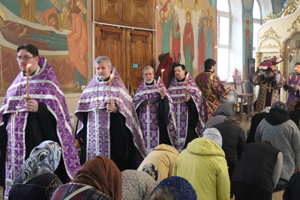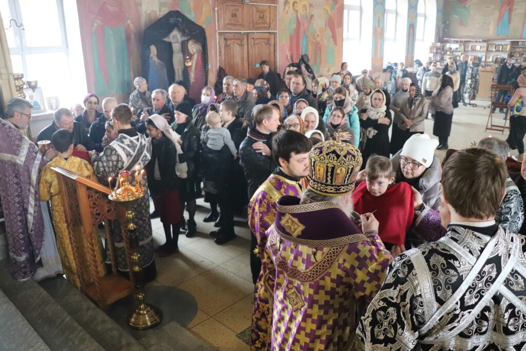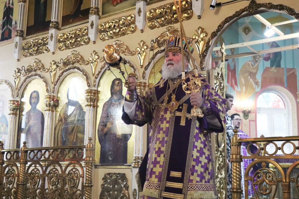 Бузулук. 4 апреля 2021 года, Неделя 3-я Великого поста, Крестопоклонная; память сщмч. Василия, пресвитера Анкирского (362-363); мц. Дросиды, дщери царя Траяна (104-117); прп. Исаакия Далматского (IV), епископ Бузулукский и Сорочинский Алексий совершил Божественную литургию в Никольском кафедральном соборе.
