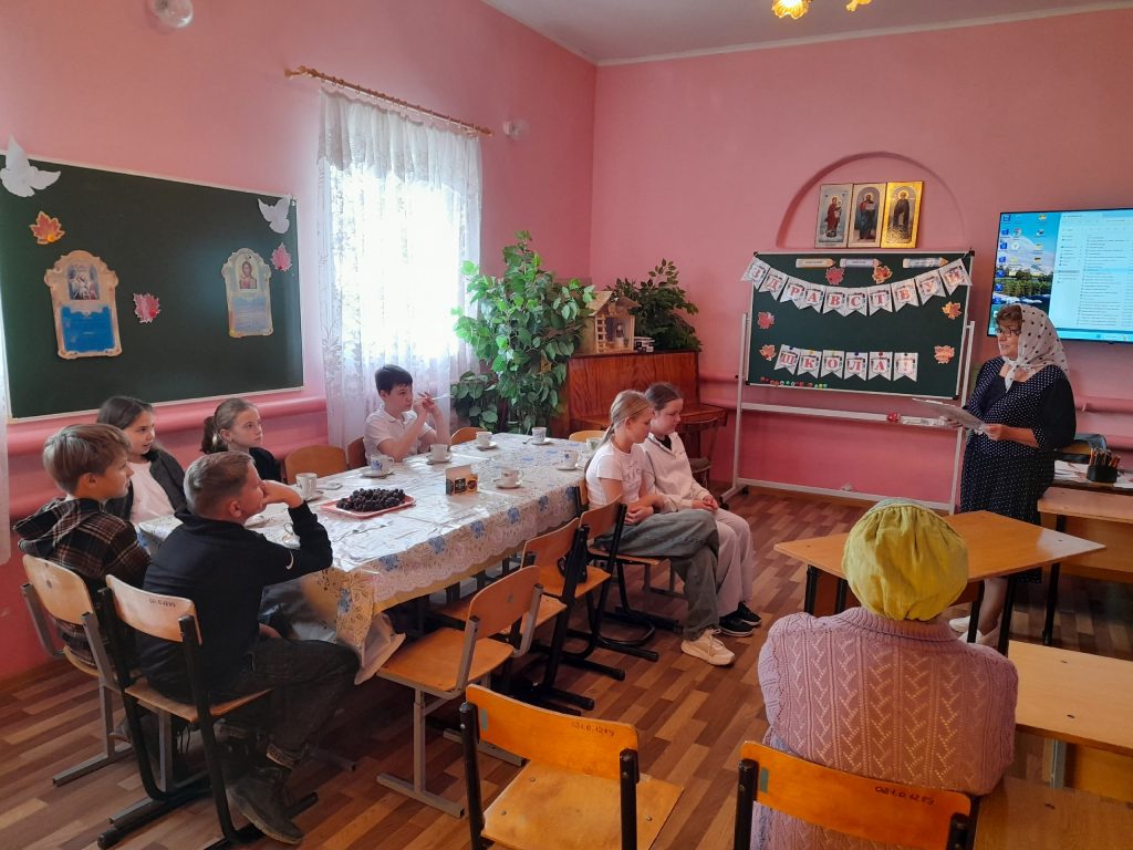 Урок, проходивший в форме праздничного чаепития, начался со слов напутствий педагогов ученикам. Поздравил ребят также и настоятель прихода протоиерей Игорь Формазюк.