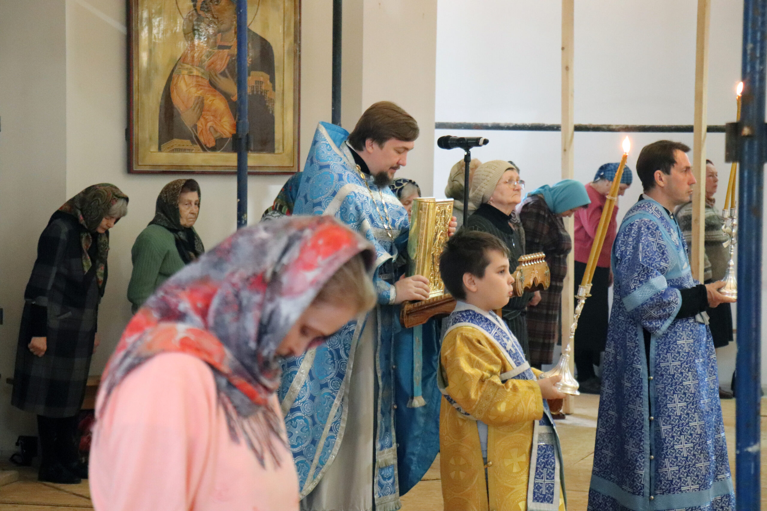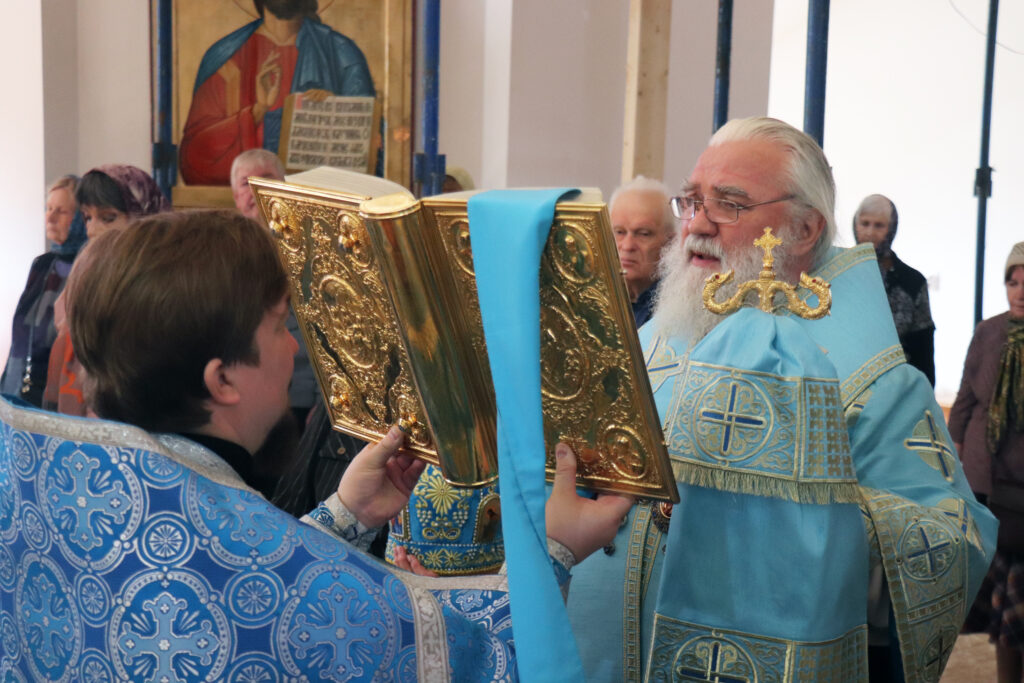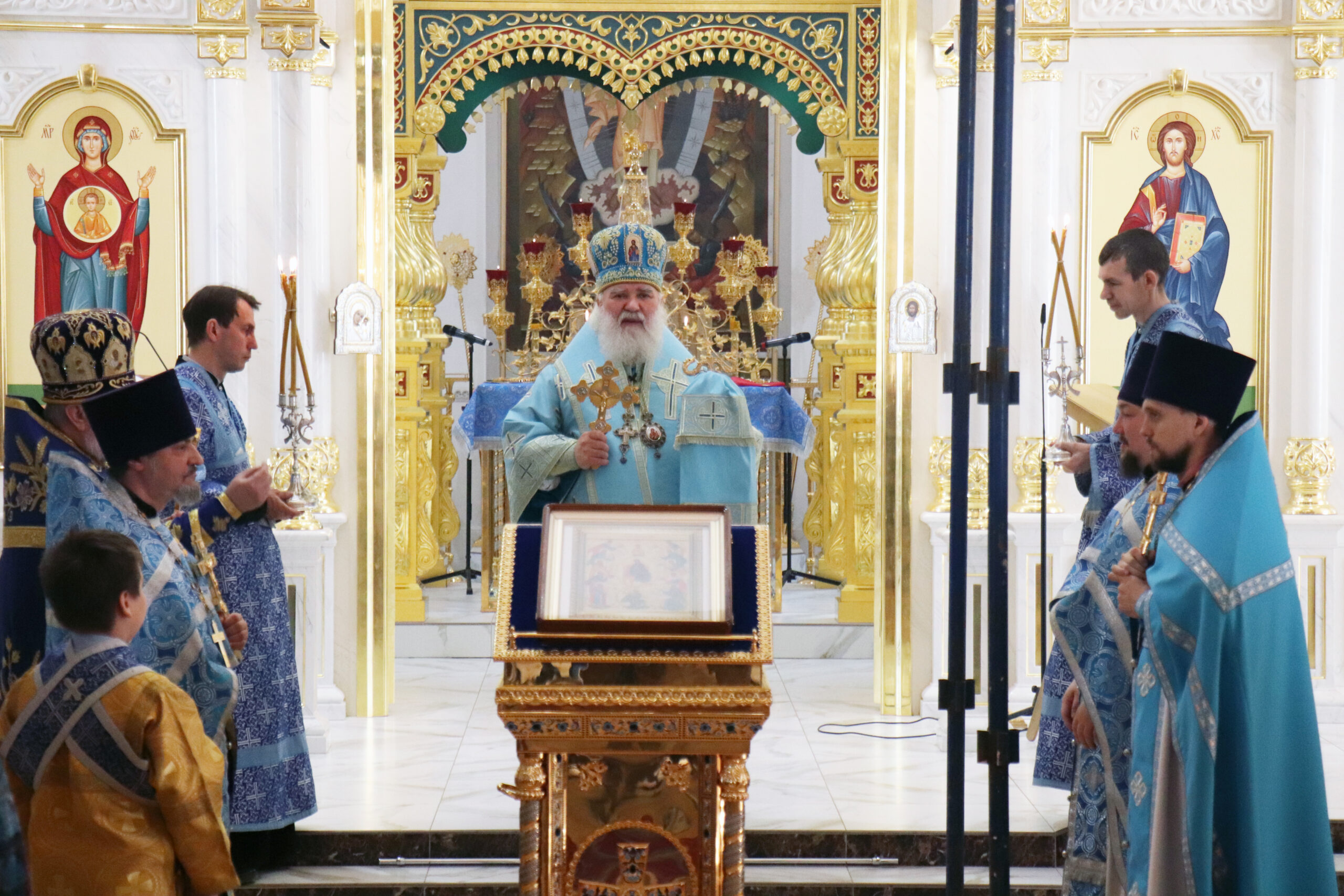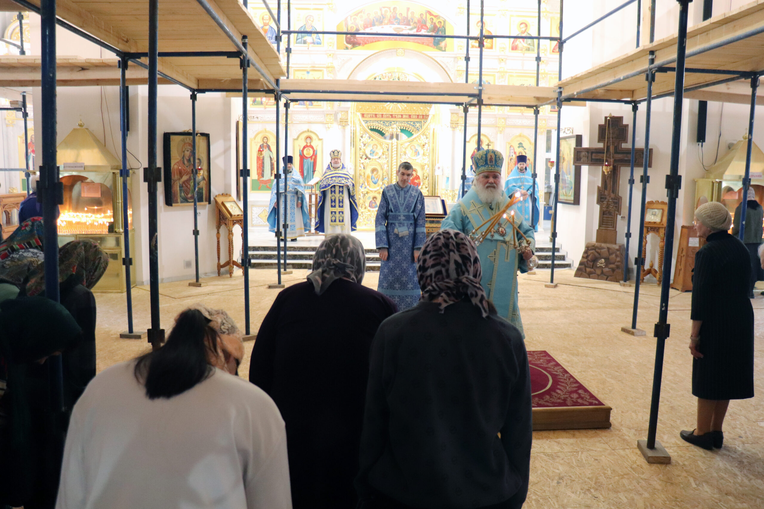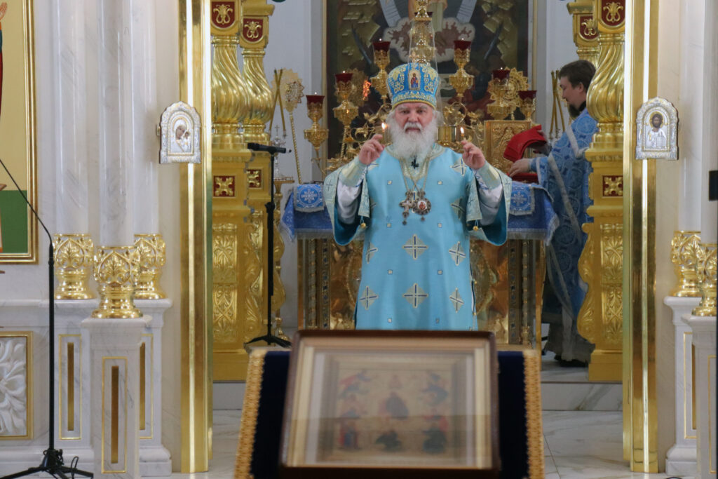 После чтения Евангелия Владыка Алексий обратился к прихожанам с проповедью, поздравив всех с праздником Похвалы Пресвятой Богородицы. Архиерей отметил, что, совершая это празднование, мы вспоминаем все те случаи спасения Святой Руси молитвами и заступничеством Матери Божией. Но нужно помнить, что эта помощь неотвратимая, помощь сильная, против врагов видимых и невидимых, приходит, если у нас будет вера, если у нас будет чистота, ибо в злохудожную душу не войдет эта помощь.