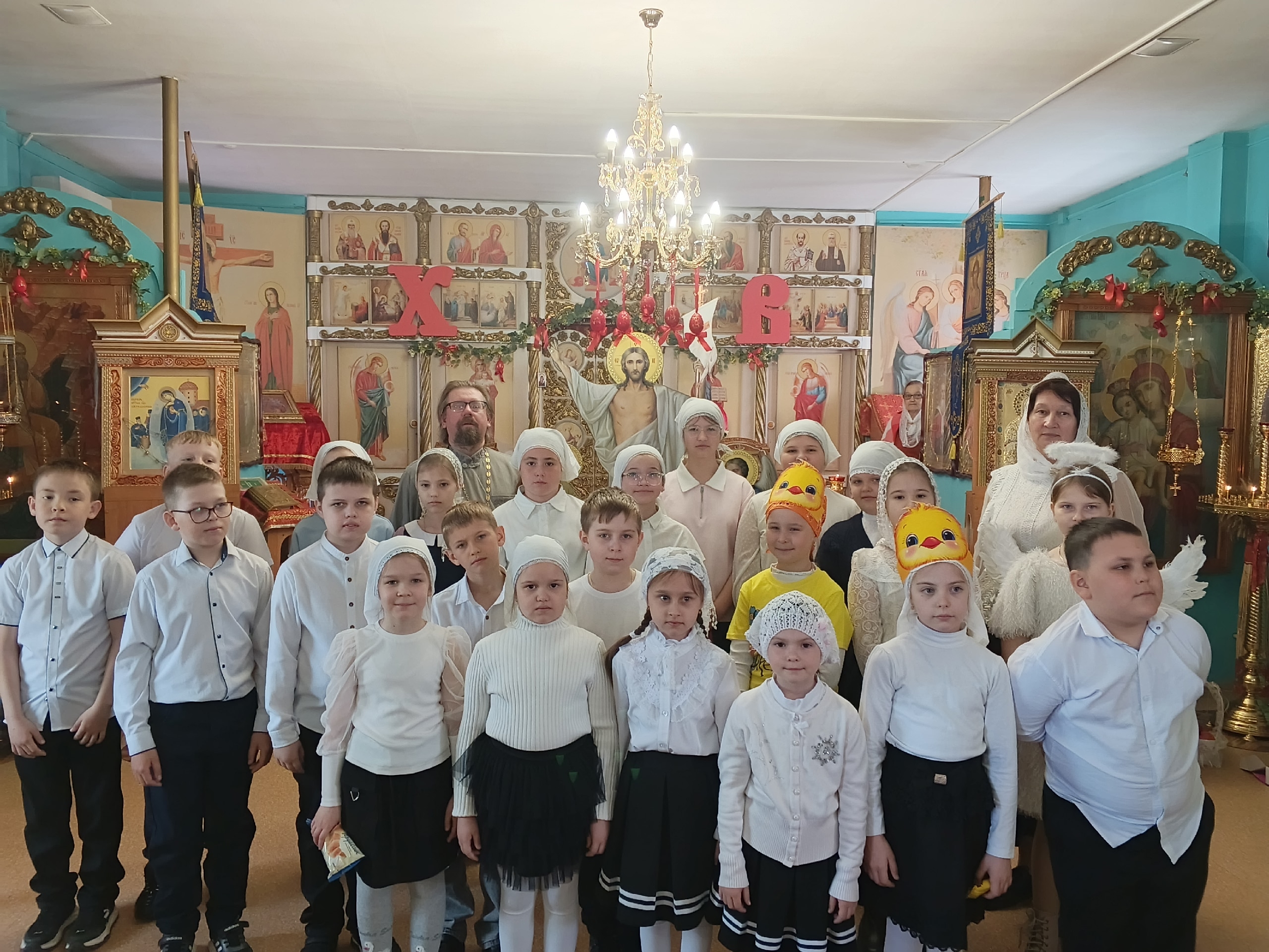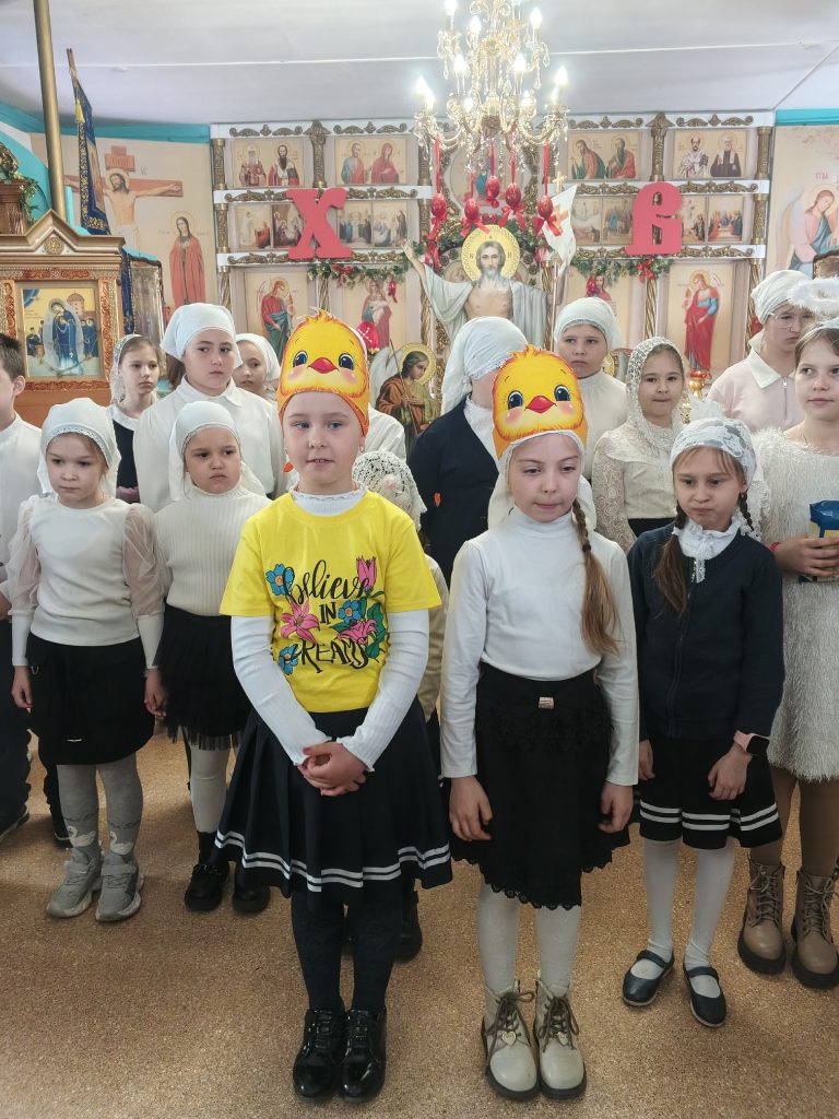 Далее состоялся Пасхальный концерт, который ребята подготовили вместе с педагогом Ларисой Михайловной Аникиной. Дети рассказали стихи и спели песни, славя Христово Воскресение, а прихожане радостно отвечали им — Во истину Воскресе! Разыграли дети сценку, где маленькие цыплята шли на праздник и потеряли корзинку с Пасхальными яйцами, но случилось чудо — явился Ангел с пропавшей корзиночкой!