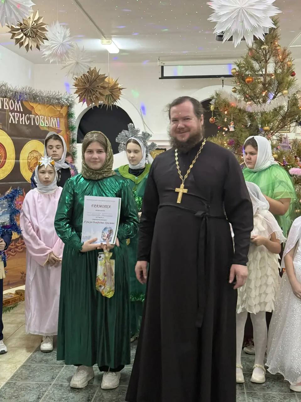 Сразу после литургии, в красивом торжественном зале, настоятель храма иерей Виталий Прилибко поздравил всех присутствующих с великим праздником. В центре стояли украшенный Вертеп и Рождественская елка. Ребята исполнили главное песнопение праздника Рождественский тропарь.