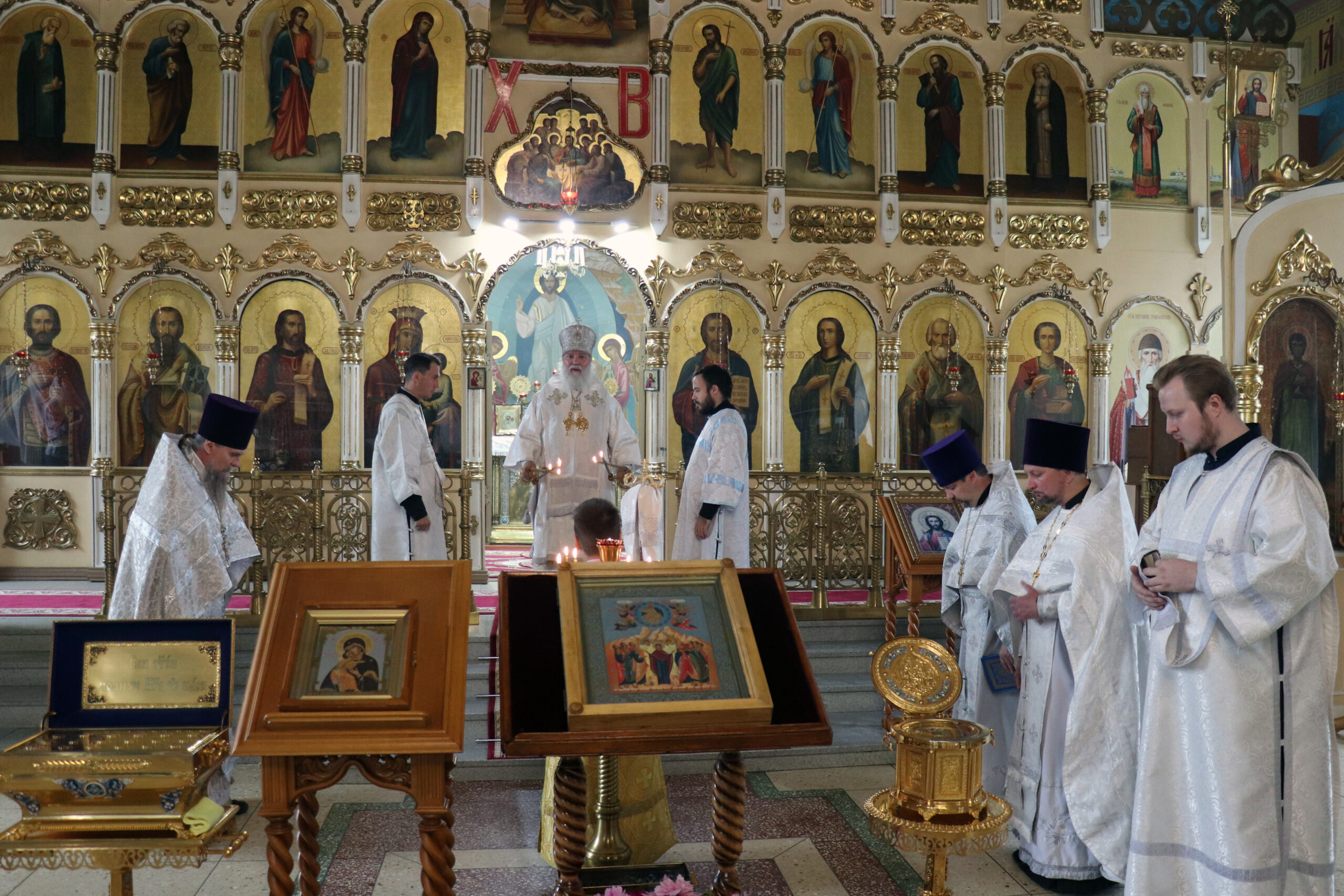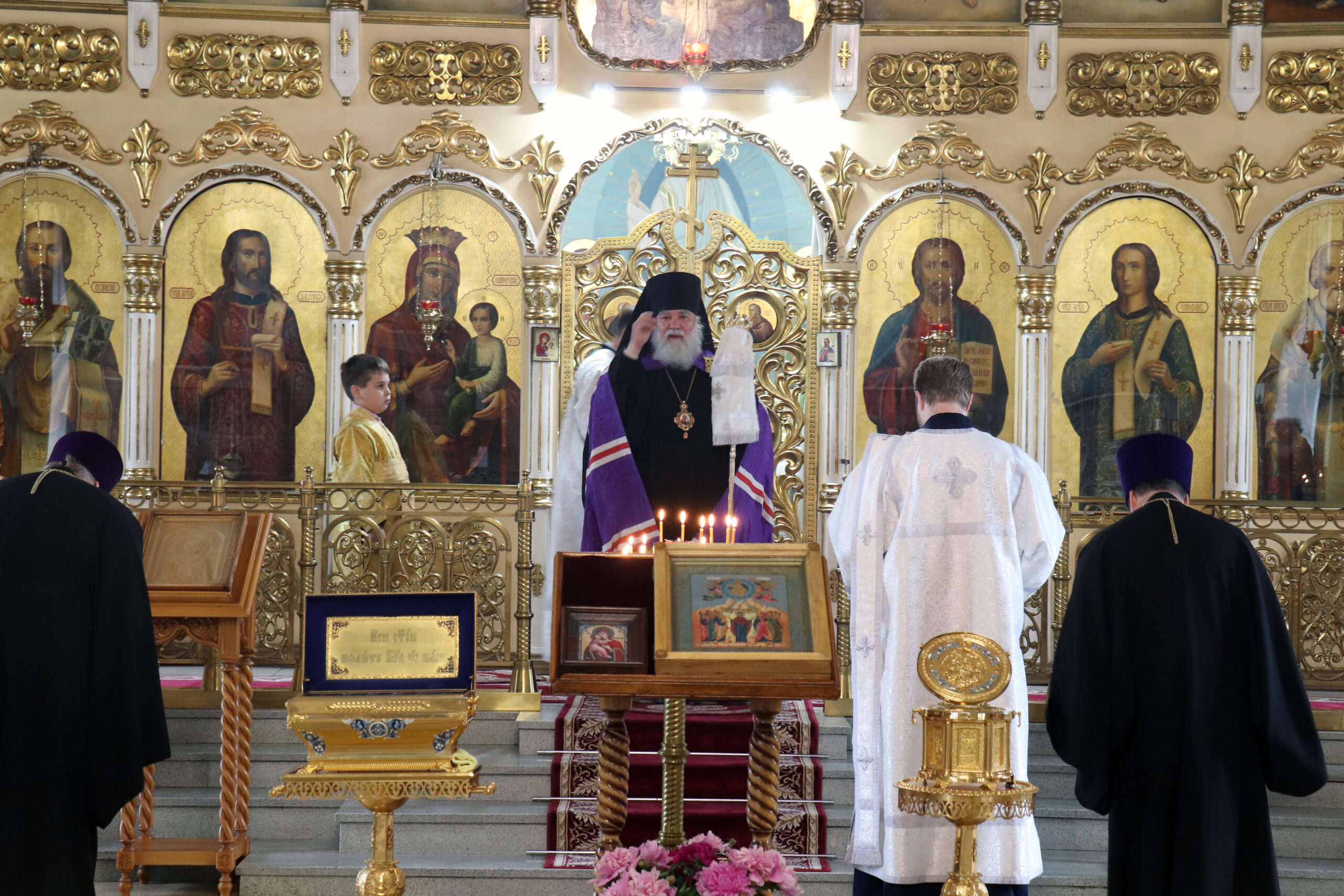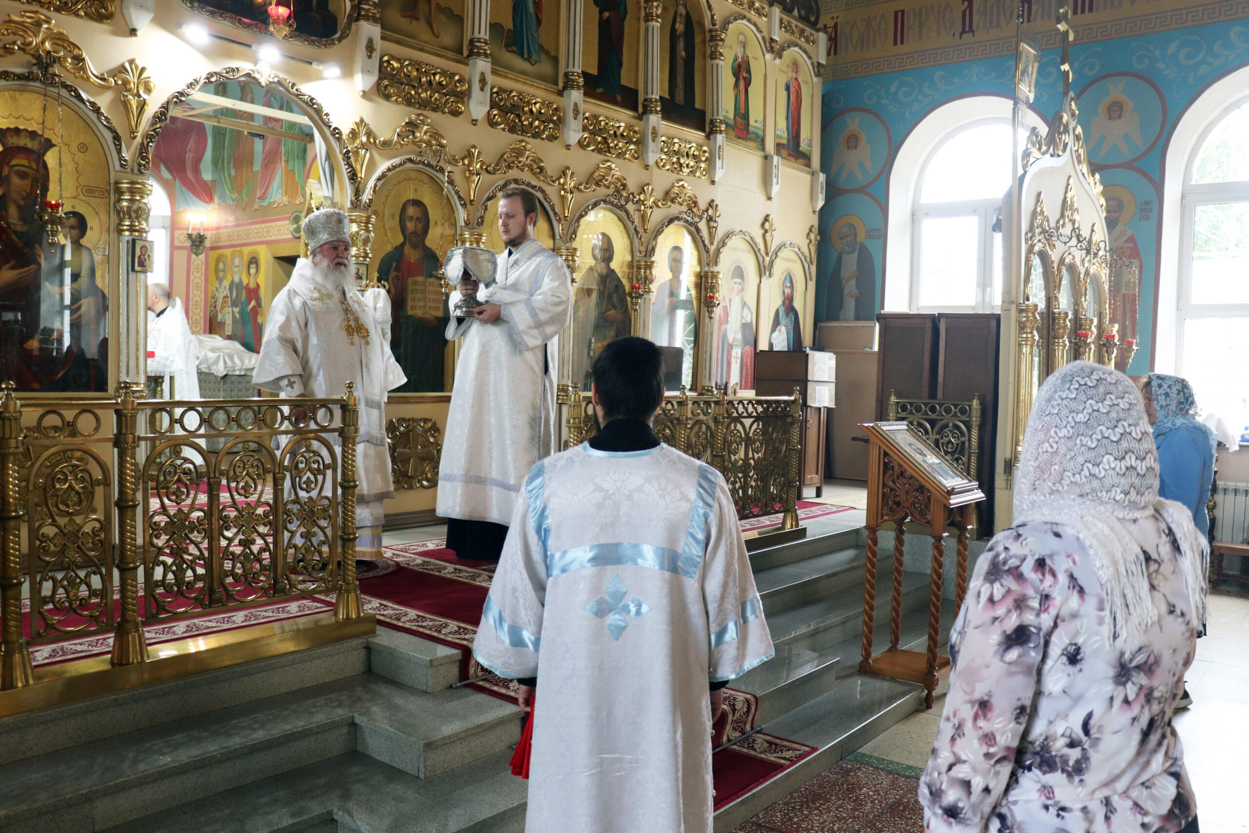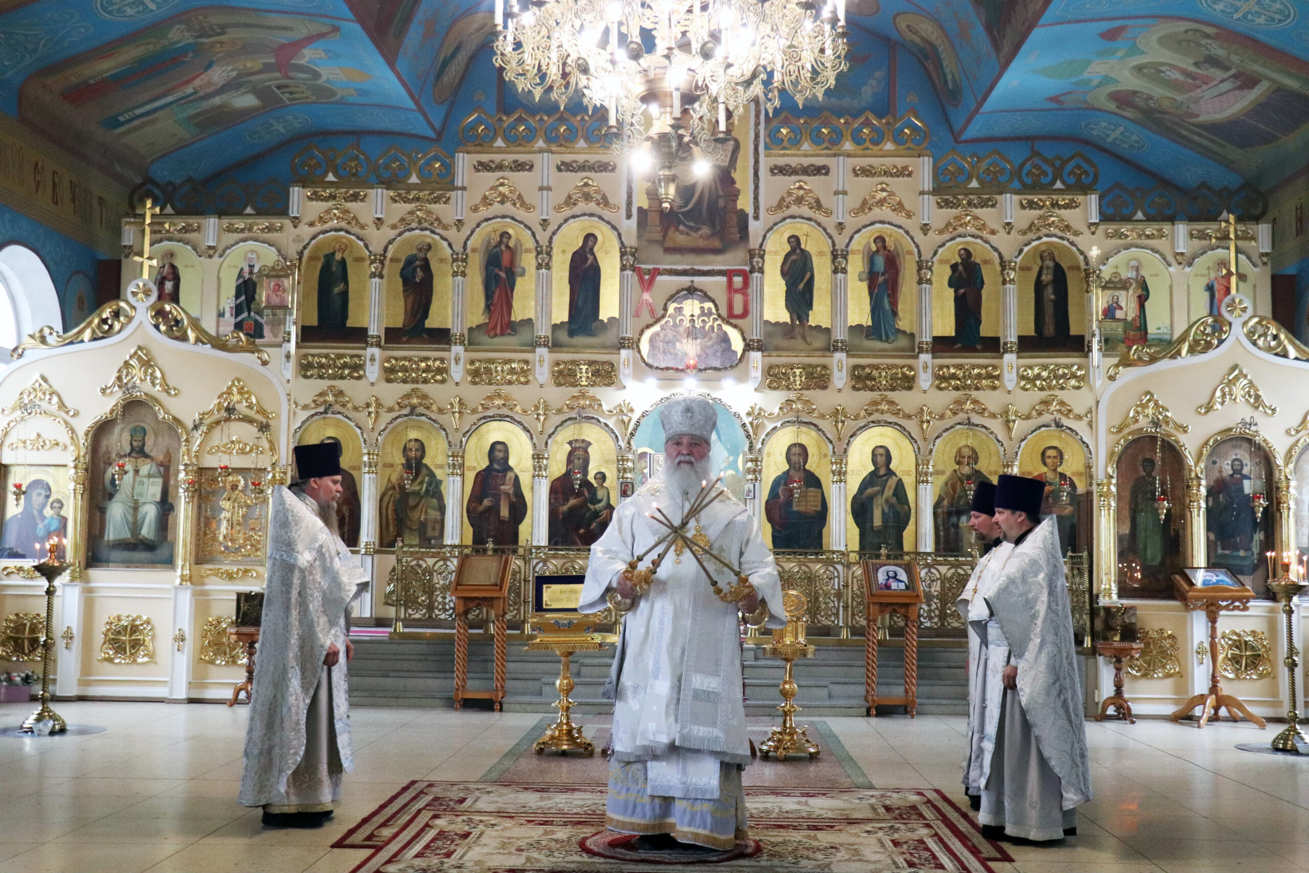 Его Преосвященству сослужили: настоятель собора протоиерей Сергий Корчагин, протоиерей Александр Бузыгин, иерей Павел Шелемин и диакон Иоанн Шумилин.