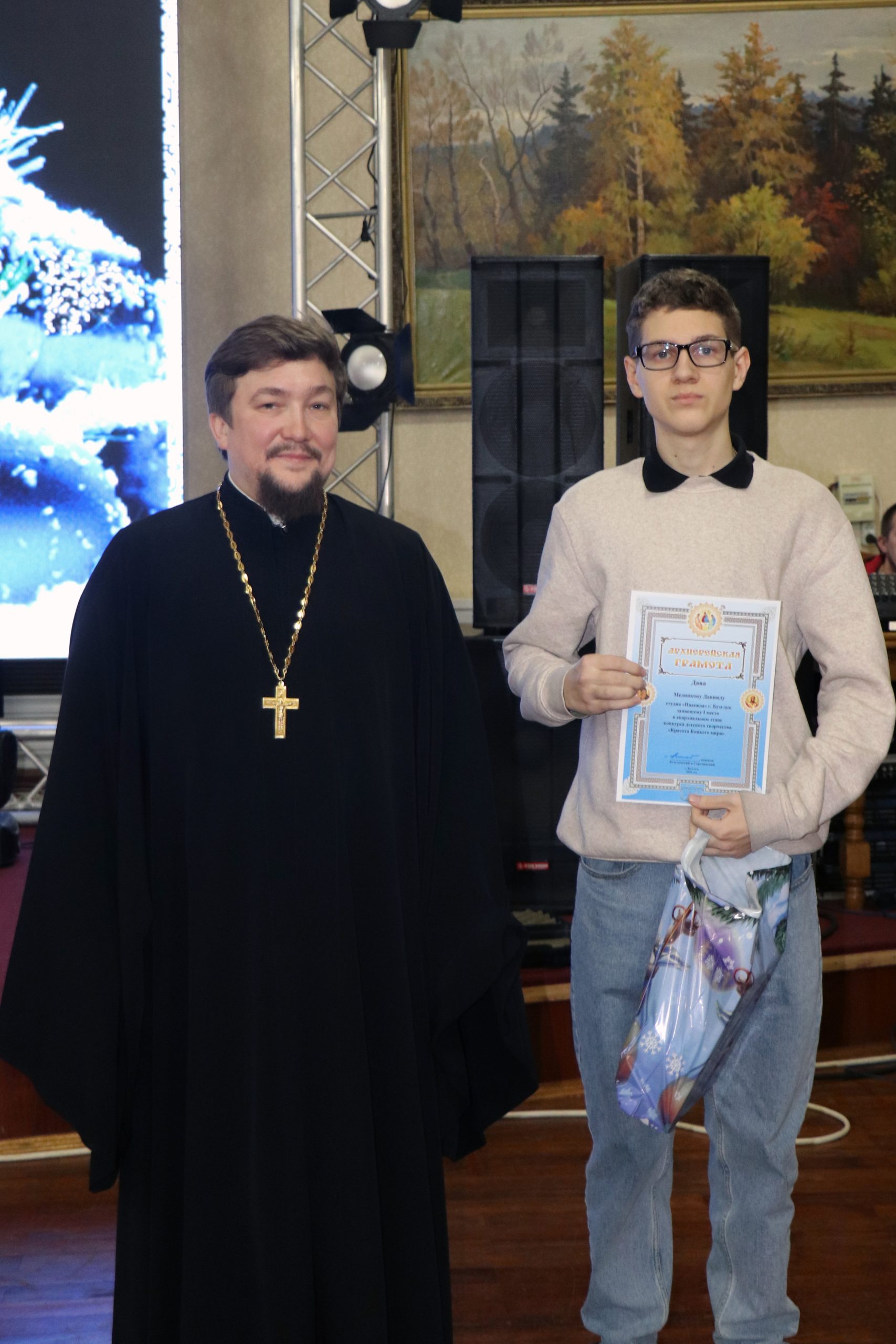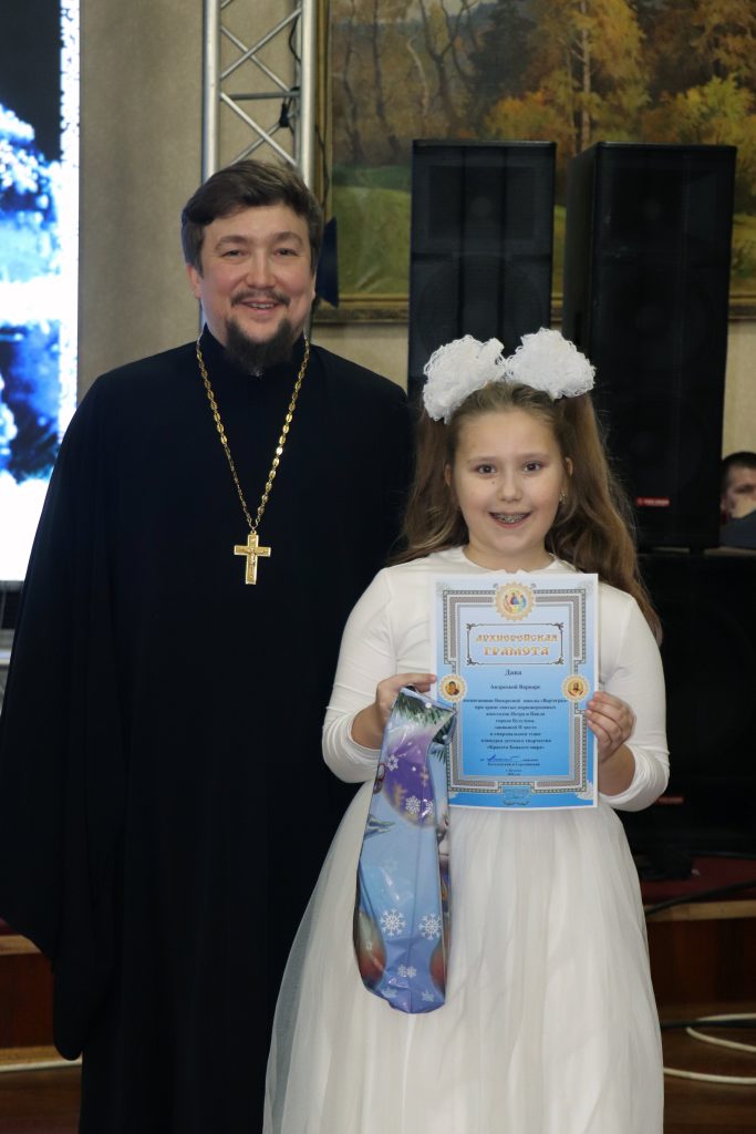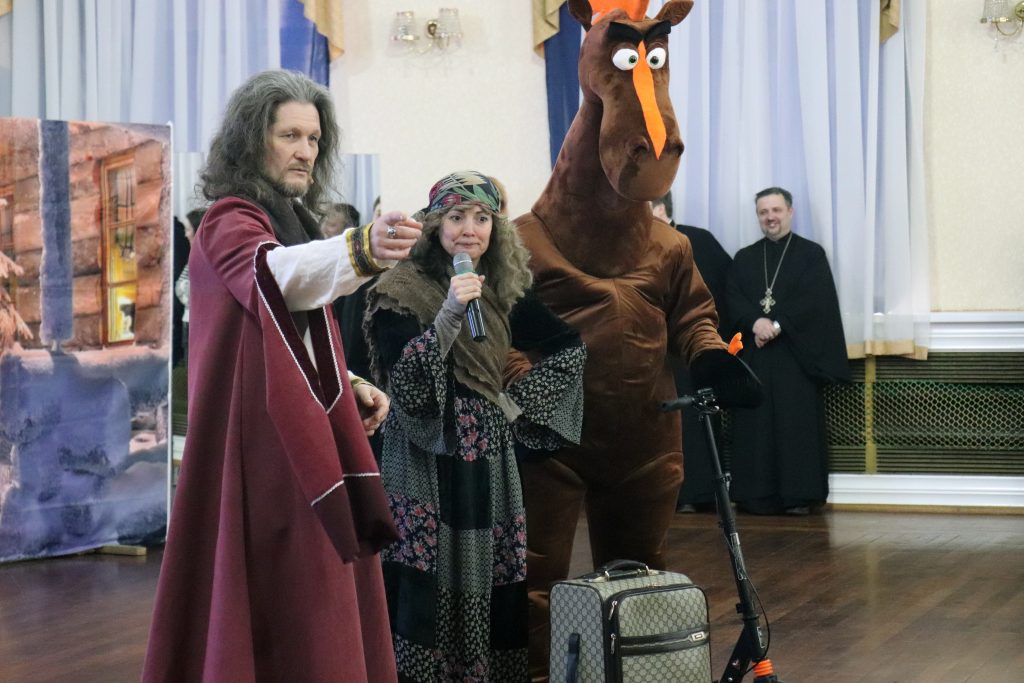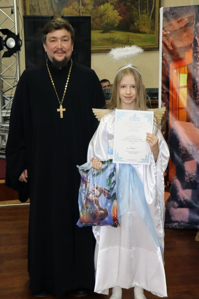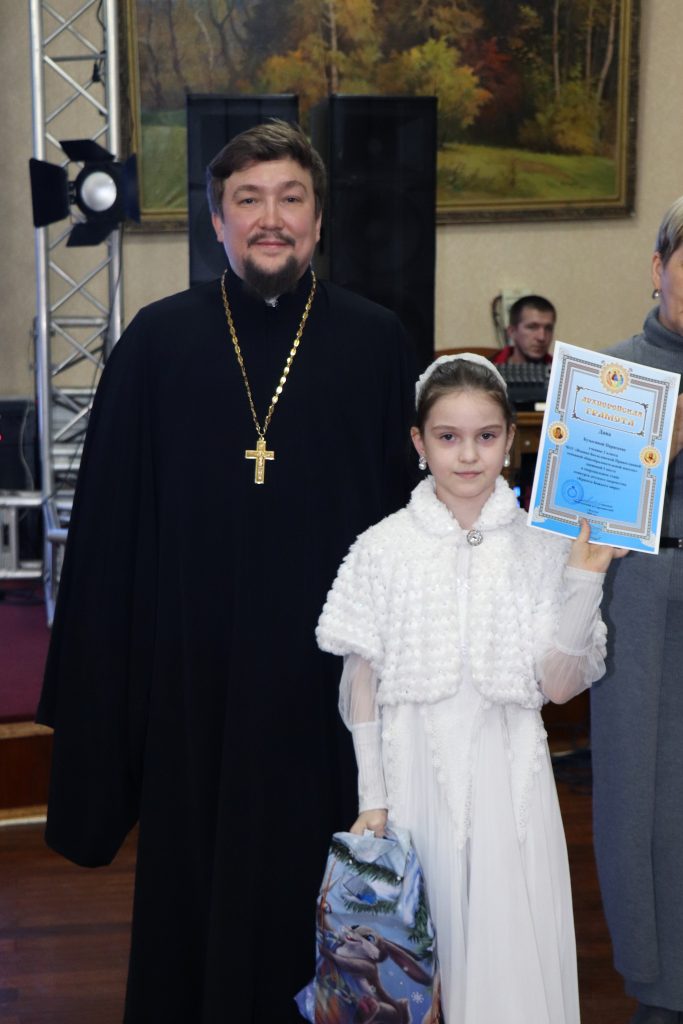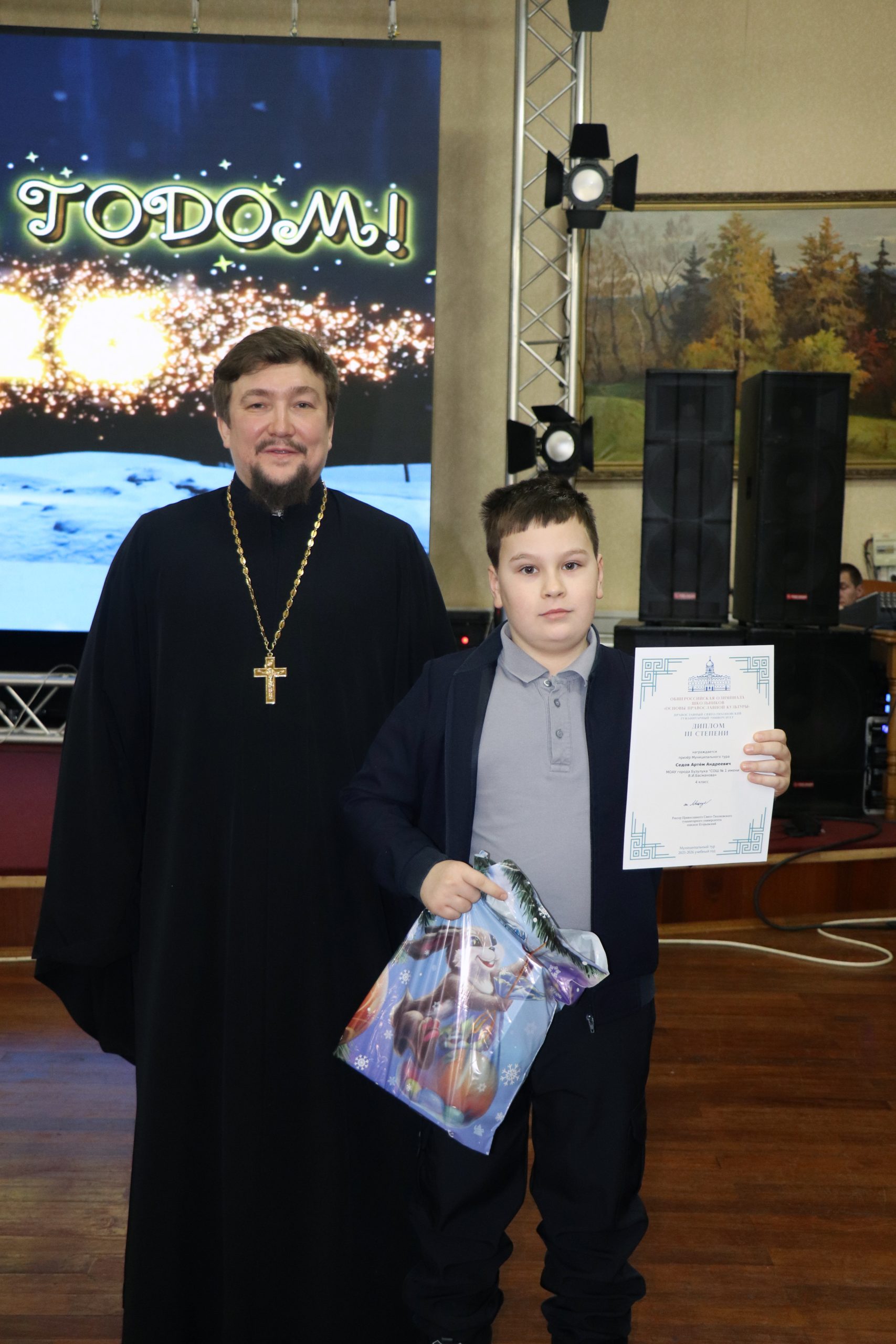 Далее состоялось награждение епархиальными грамотами и благодарственными письмами победителей в детском творческом конкурсе «Красота Божиего мира». После чего началось театрализованное представление, подготовленное творческим коллективом ДК «Юбилейный». По окончании праздника все ребятишки получили сладкие подарки.