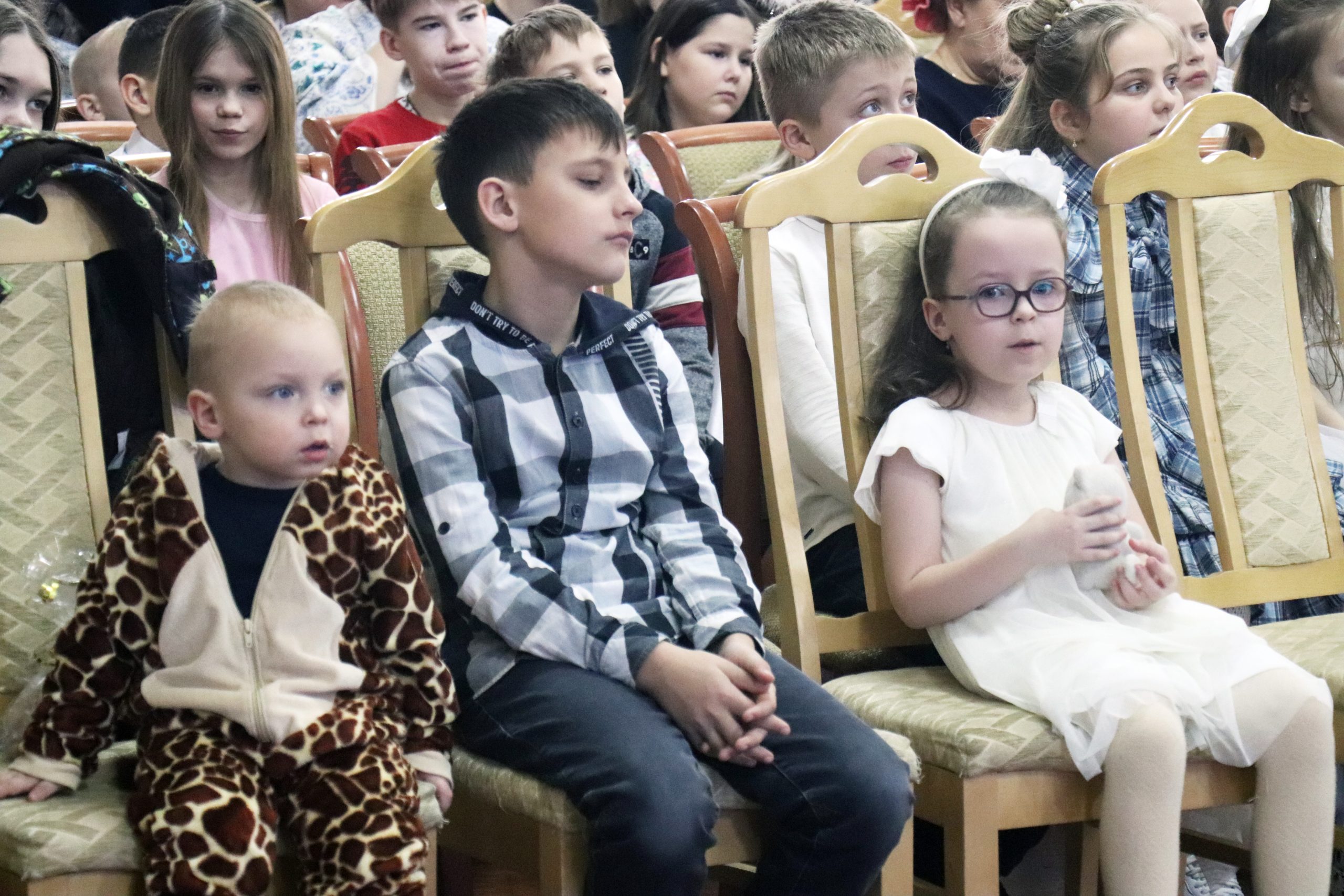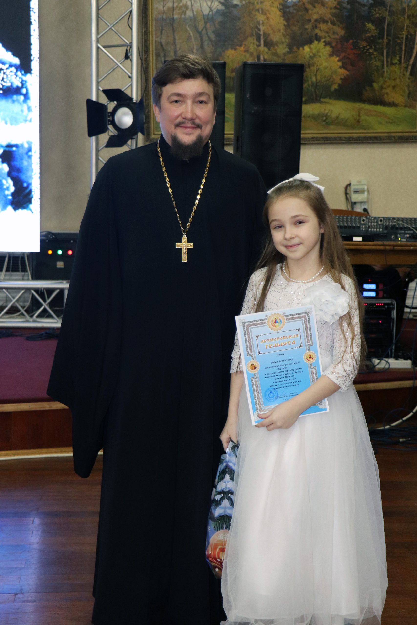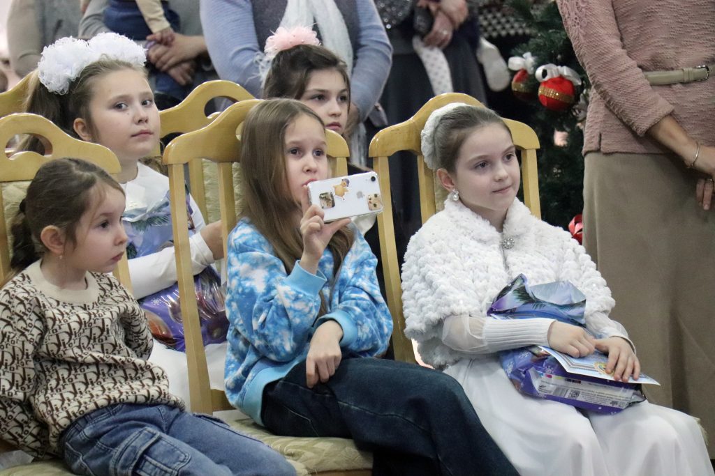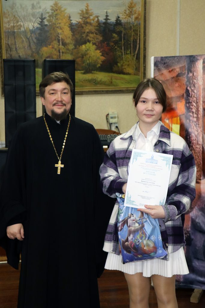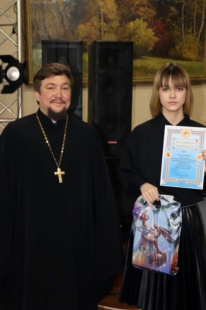 Далее состоялось награждение епархиальными грамотами и благодарственными письмами победителей в детском творческом конкурсе «Красота Божиего мира». После чего началось театрализованное представление, подготовленное творческим коллективом ДК «Юбилейный». По окончании праздника все ребятишки получили сладкие подарки.