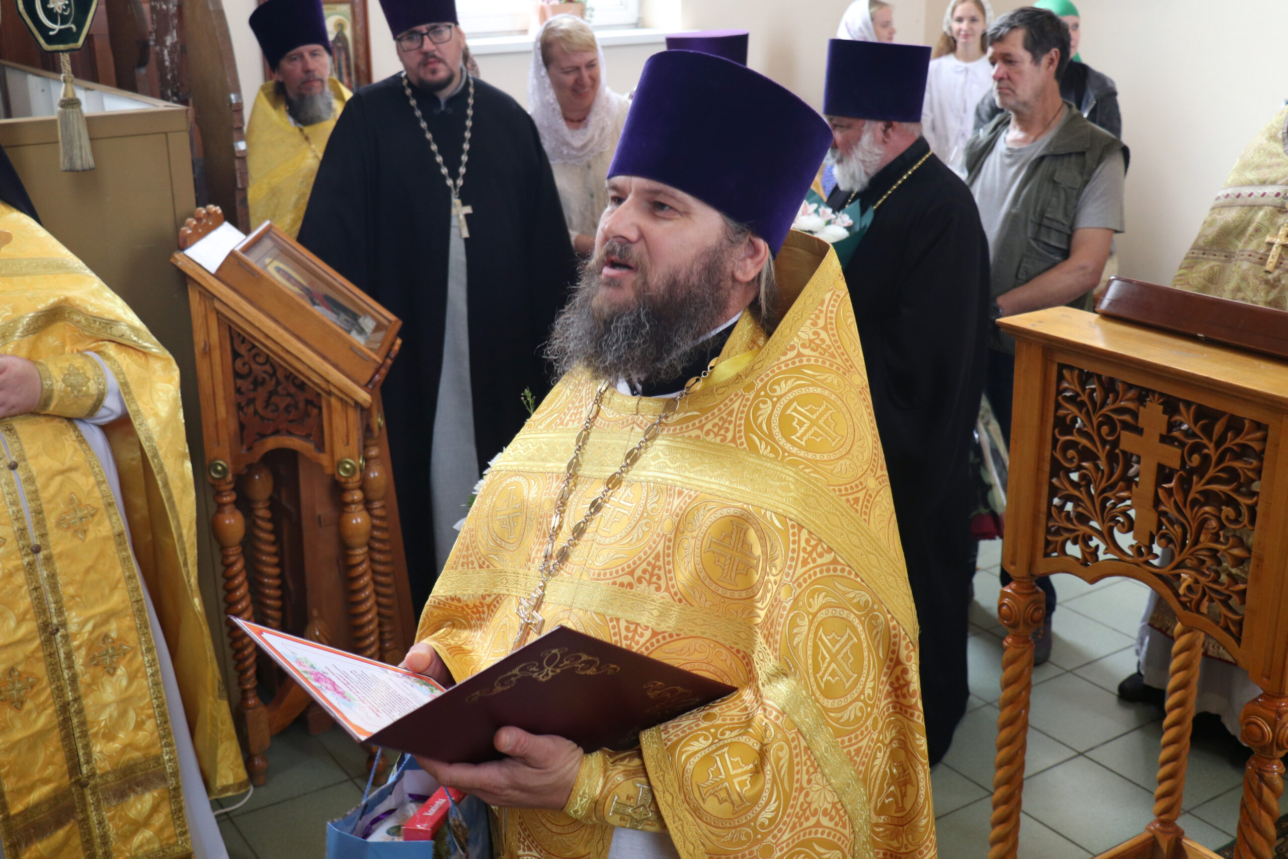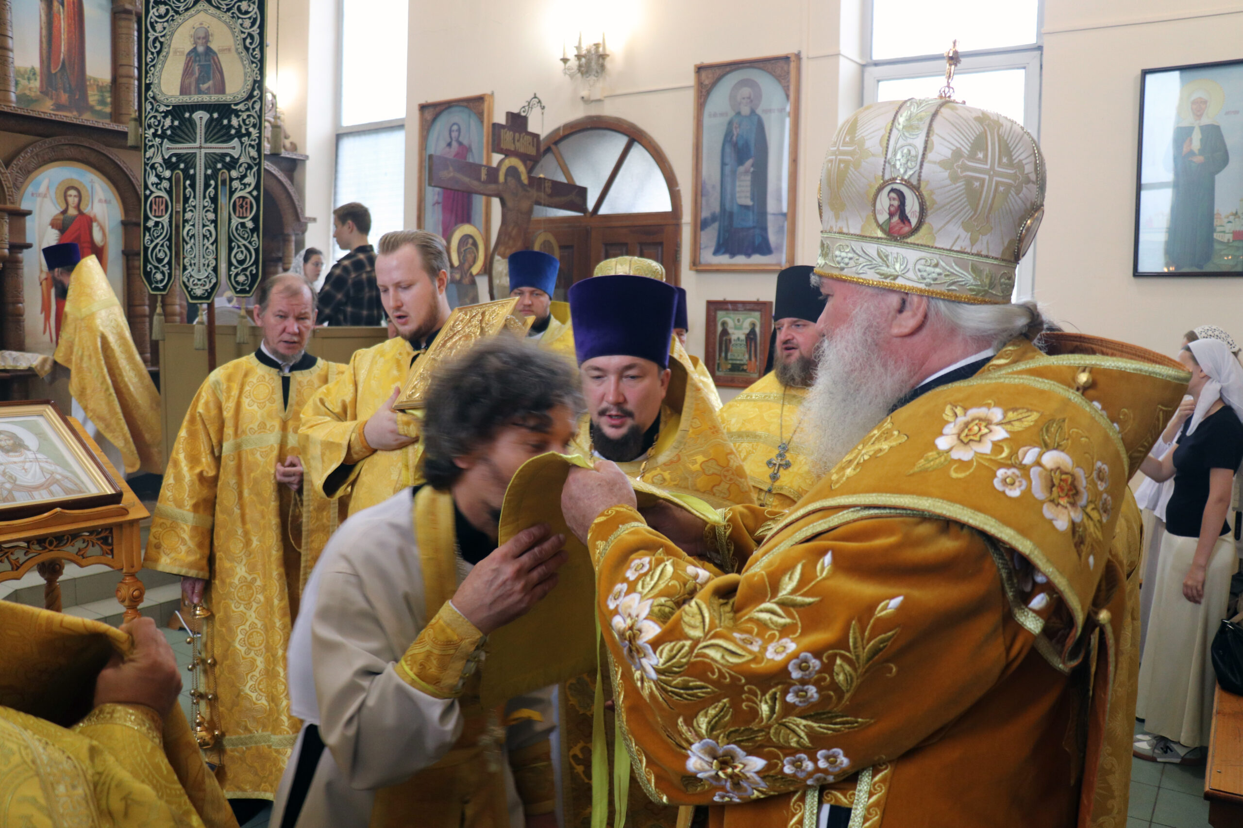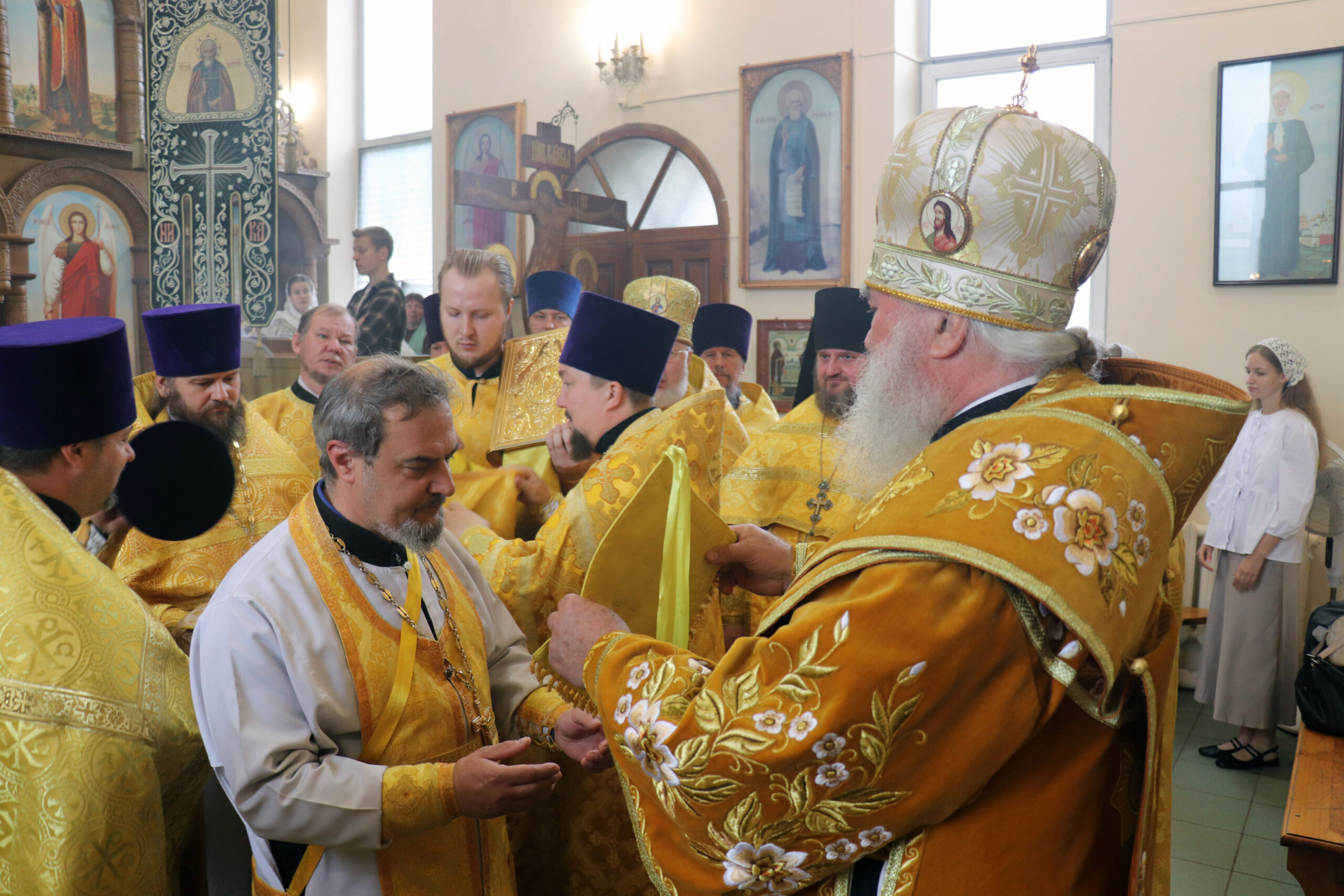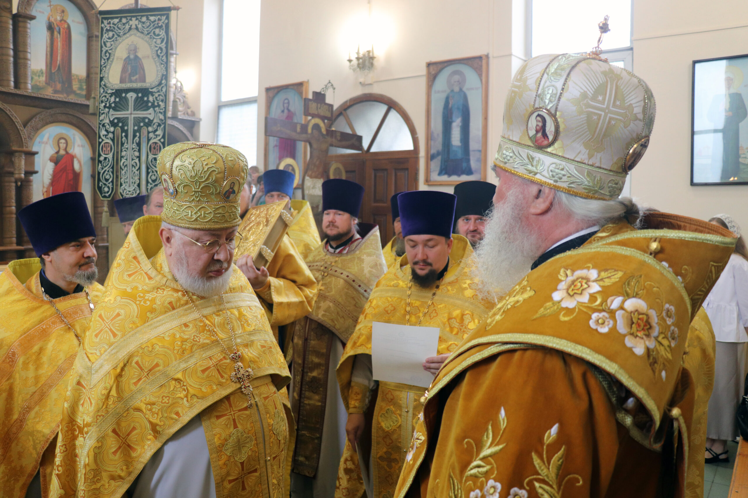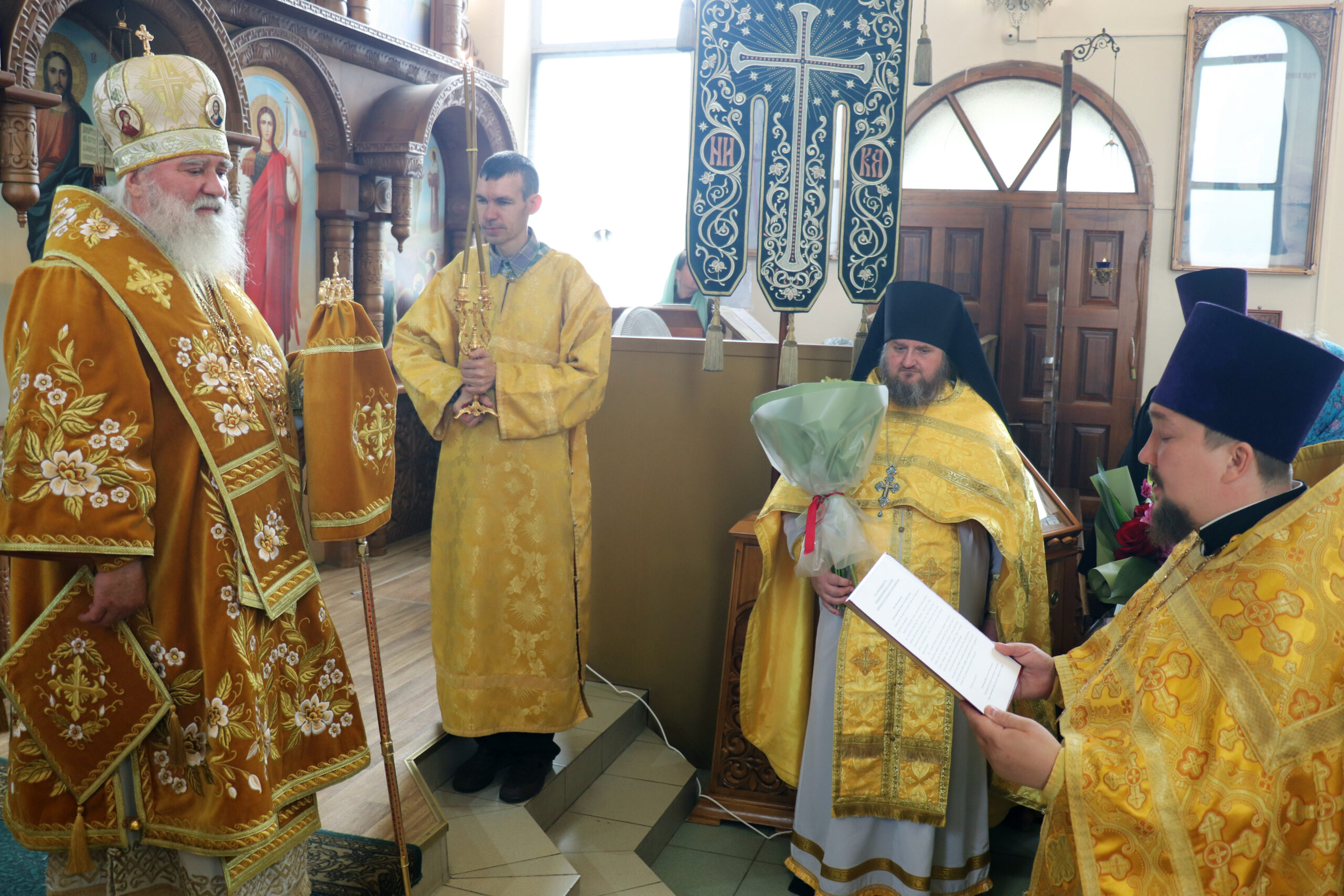 На малом входе Литургии Владыка Алексий наградил архимандрита Ефрема (Матынцева), согласно Указу Святейшего Патриарха Московского и всея Руси Кирилла за усердное служение Церкви Божией, правом служения Божественной Литургии с отверстыми Царскими Вратами по «Иже херувимы…». Также согласно Указу Святейшего Патриарха Московского и всея Руси Кирилла за усердное служение Церкви Божией и в связи с 50-летним юбилеем, наградил иерея Анатолия Марченкова правом ношения палицы, а иерея Игоря Ивашкова, за усердное служение Церкви Божией, правом ношения набедренника.