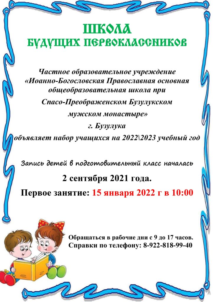 Бузулук. Частное образовательное учреждение «Иоанно-Богословская православная основная общеобразовательная школа при Спасо-Преображенском Бузулукском мужском монастыре» объявляет набор учащихся на 2022/2023 учебный год.