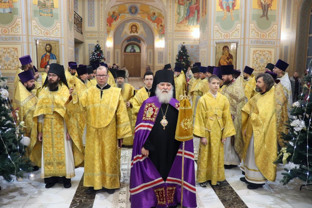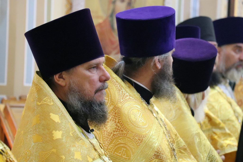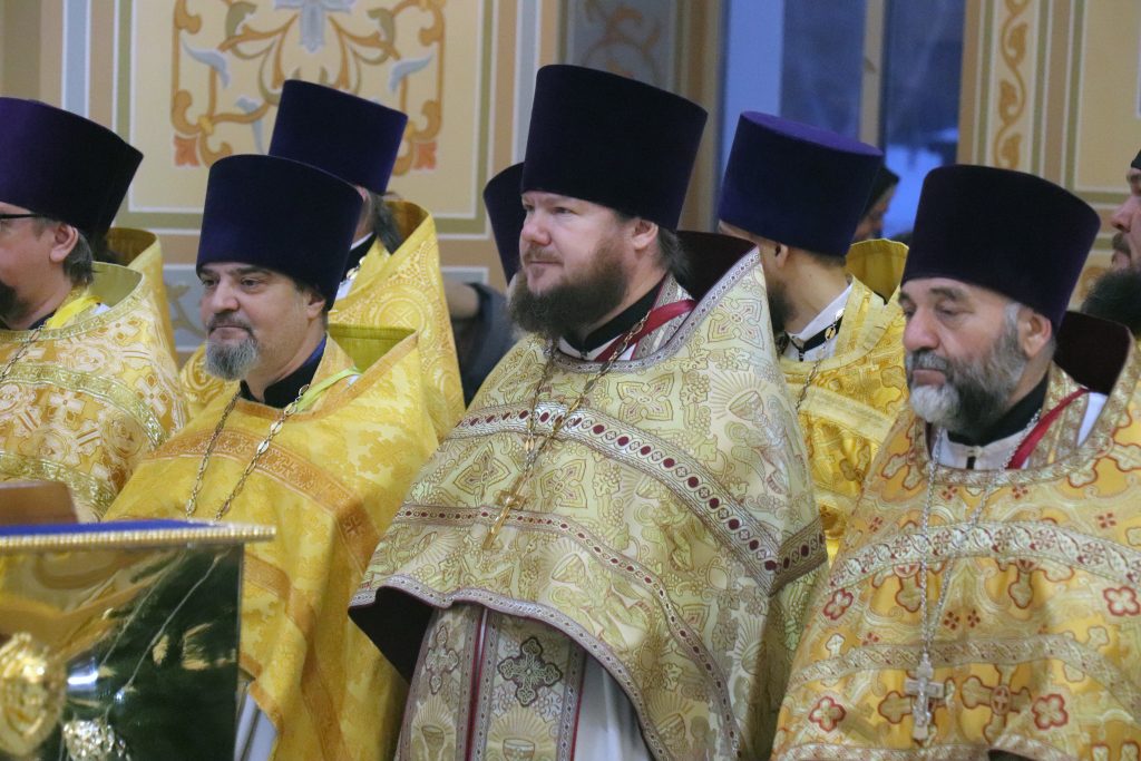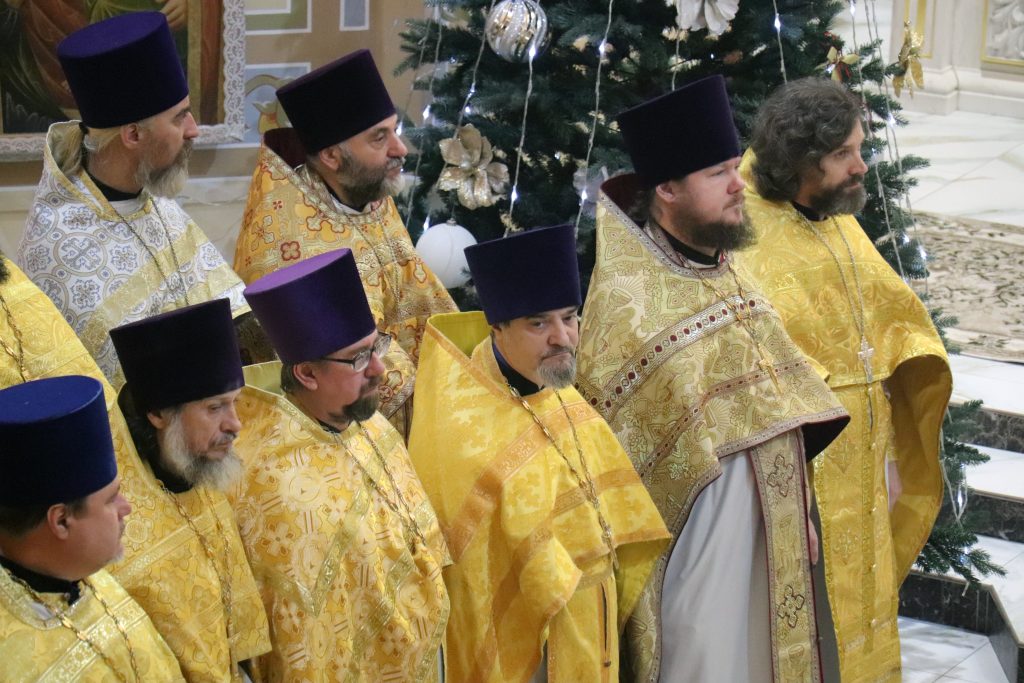 По отпусте Литургии Владыка Алексий обратился с проповедью, в которой поприветствовал всех с соборным служением и поблагодарил духовенство Епархии за совместную молитву, за труды по содействию СВО, а также за помощь в строительстве Свято-Троицкого кафедрального собора.