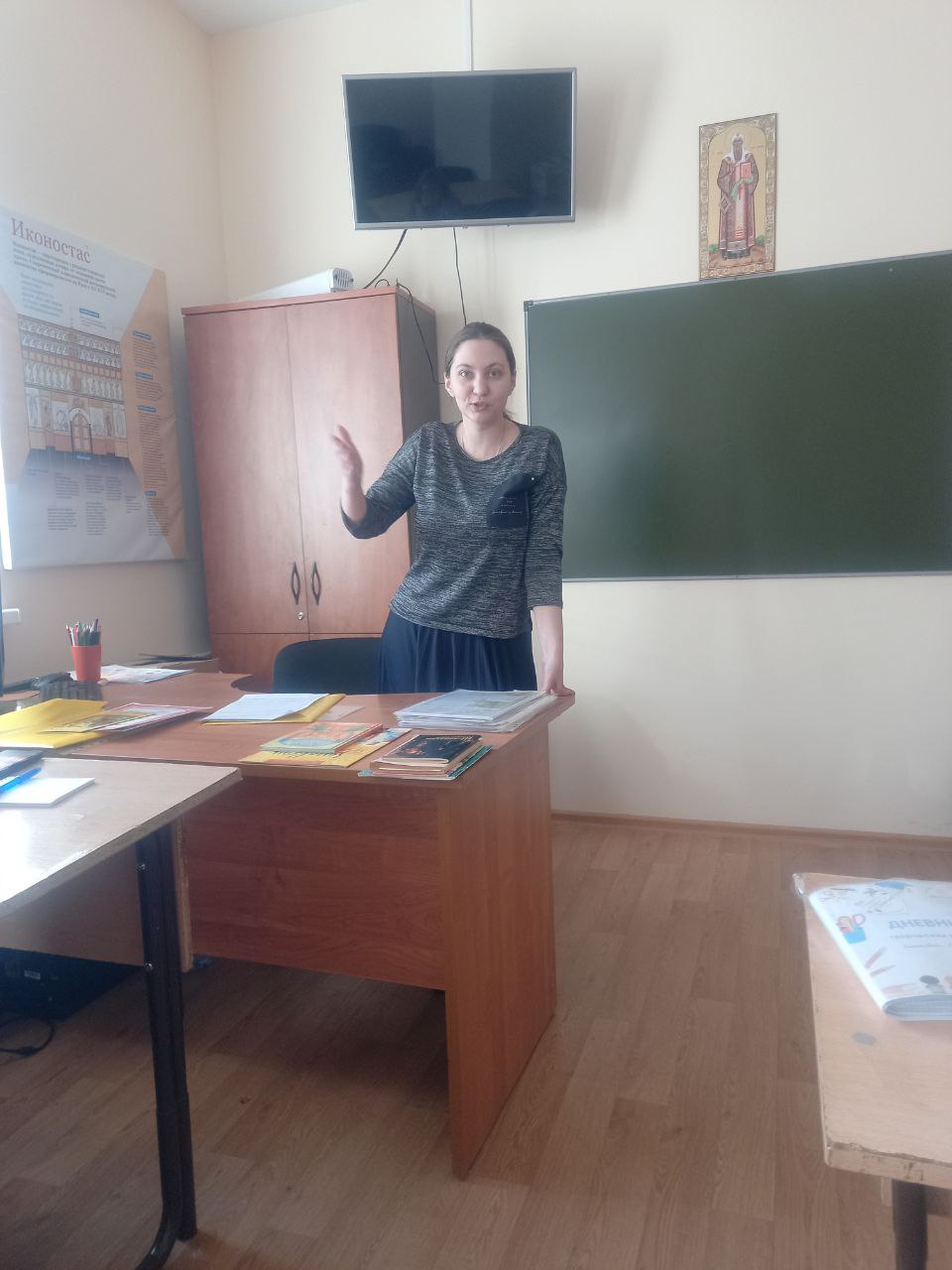 Анастасия Горбунова, преподаватель храмоведения воскресной школы «Благовест» показала учителям пособия по преподаваемому курсу.