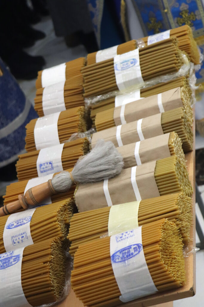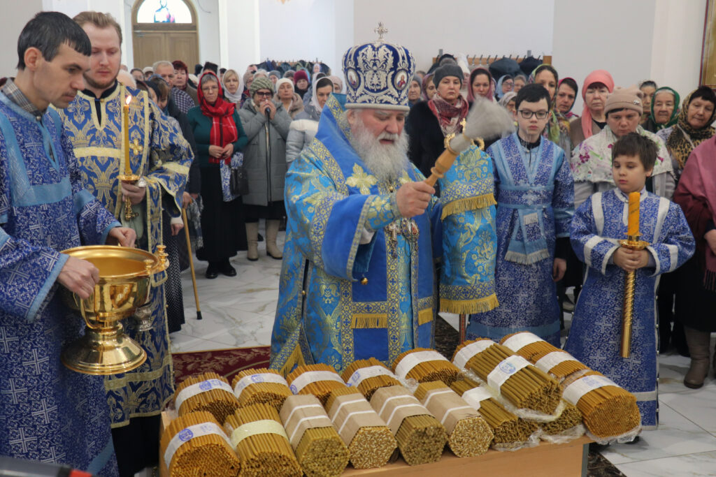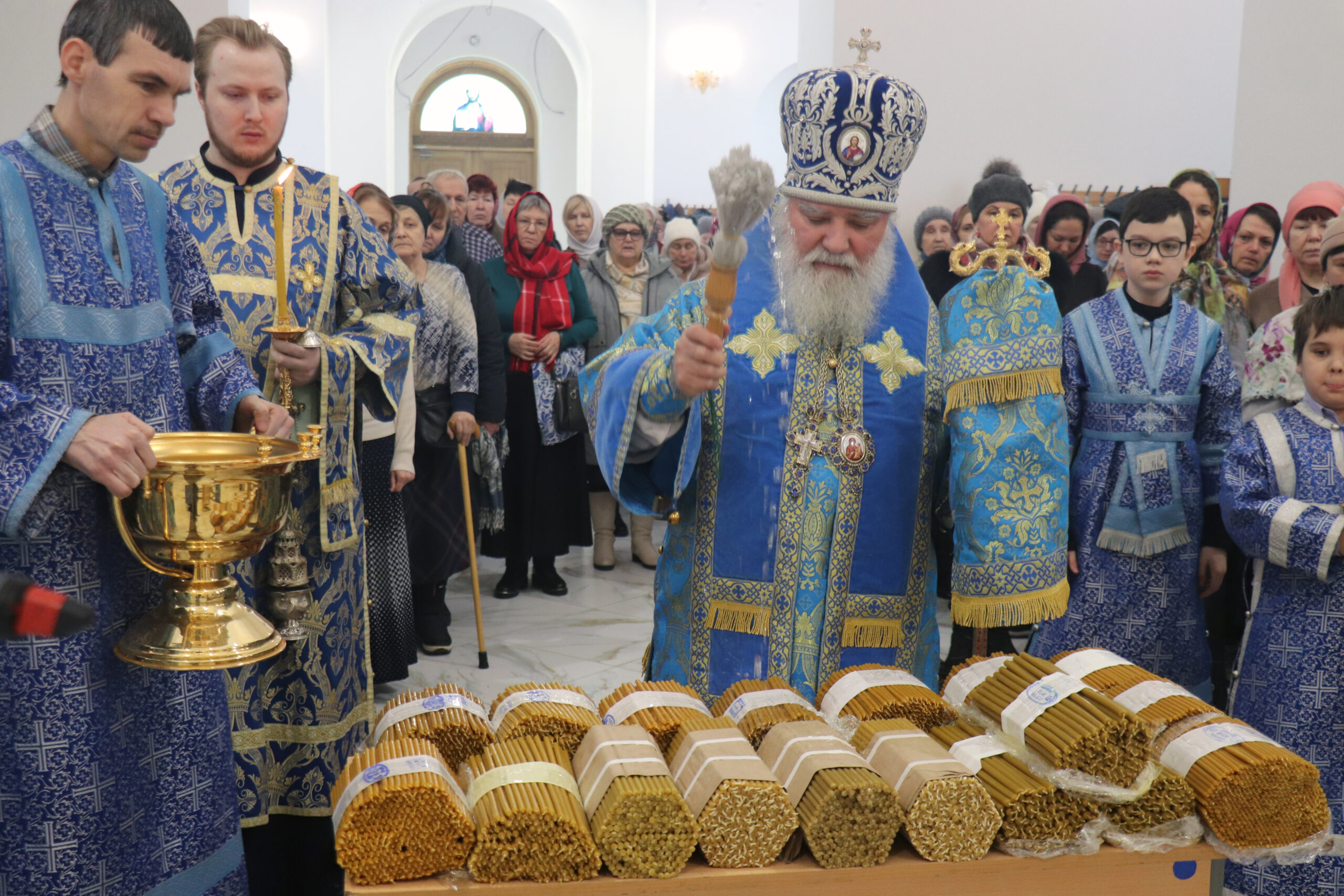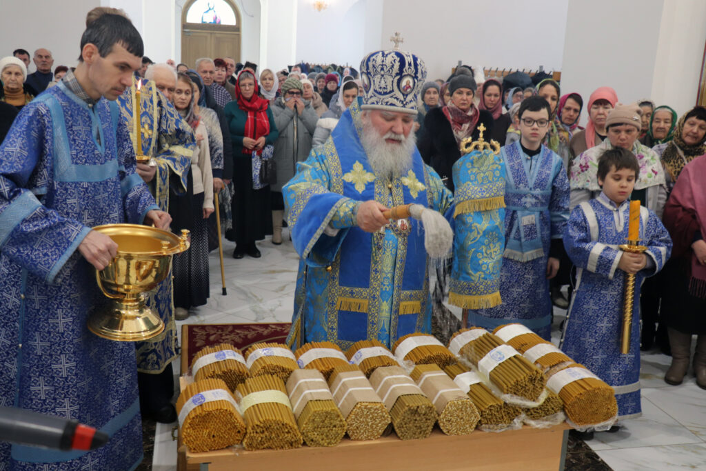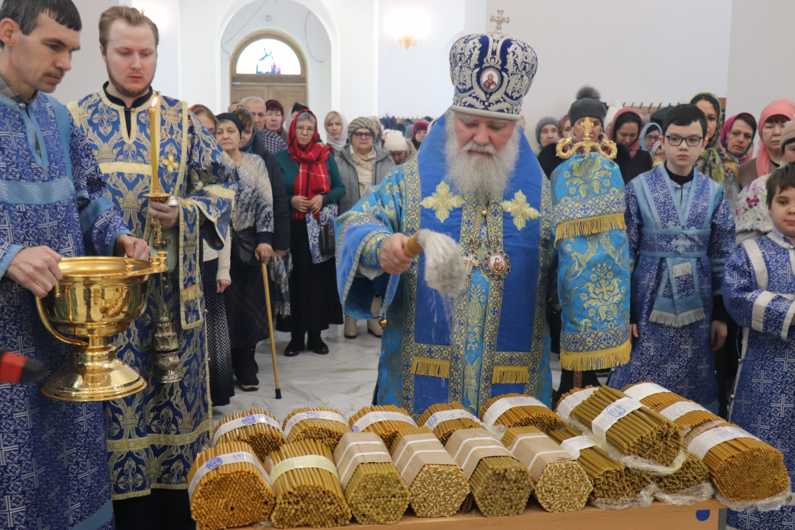 По заамвонной молитве Владыка Алексий освятил свечи. Было совершено славление празднику Сретения Господня.