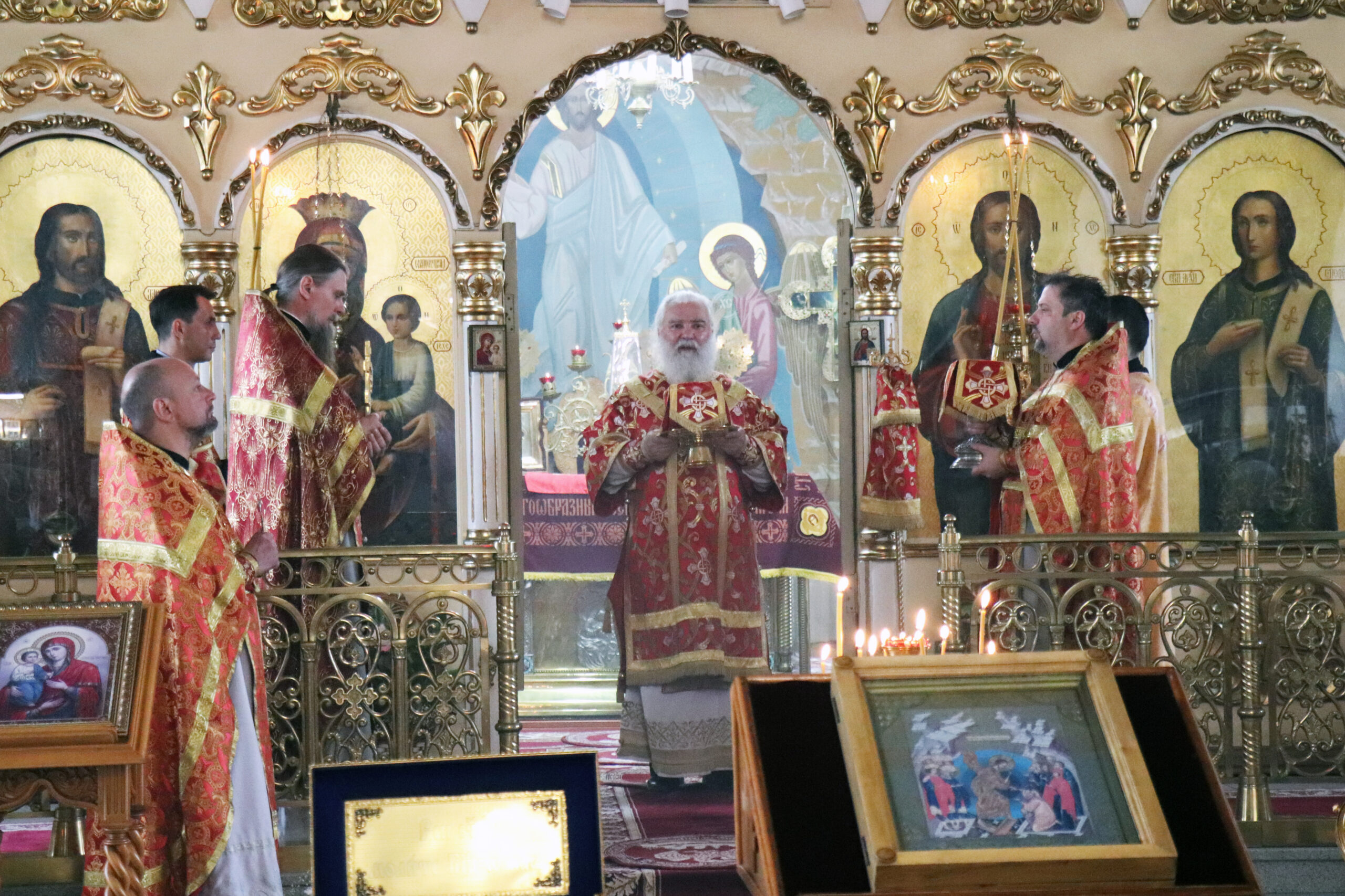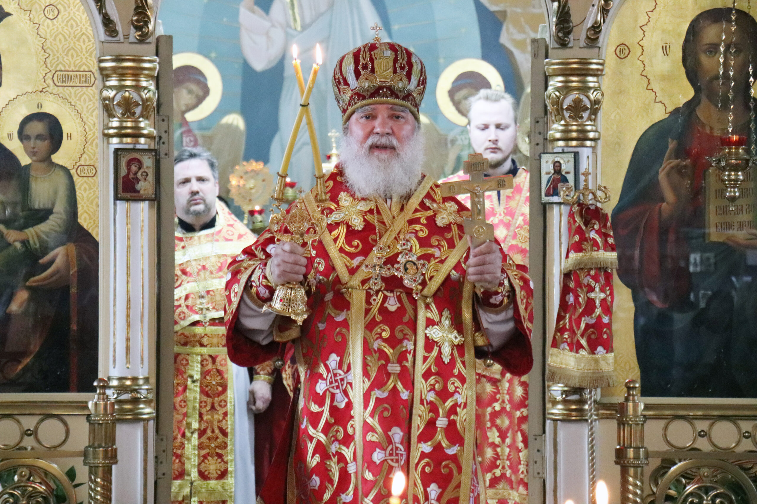Его Преосвященству сослужили: настоятель собора протоиерей Сергий Корчагин, протоиерей Александр Бузыгин, иерей Павел Шелемин и диакон Иоанн Шумилин.