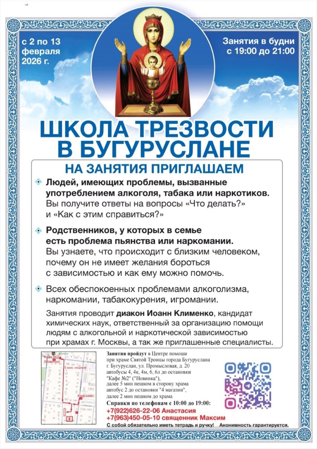 «Школа трезвости» представляет собой лекционно-практическую программу для зависимых и их близких, рассчитанную на десять занятий. Встречи проходят на платформе «Zoom». Главный лектор – диакон Иоанн Клименко, кандидат химических наук, ответственный за организацию трезвенной работы при храмах Москвы.