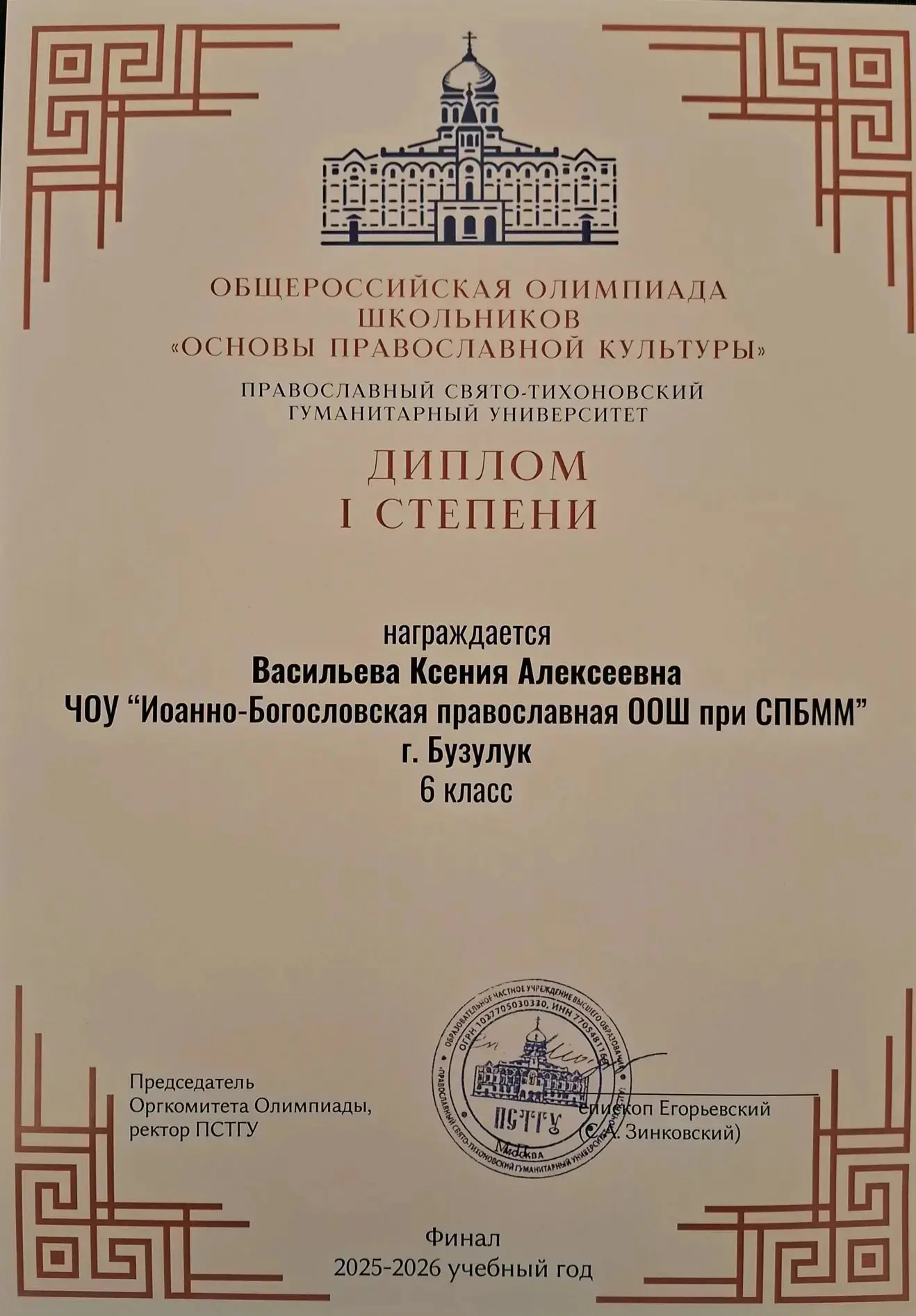 В числе награжденных ученица 6 класса Иоанно-Богословской Православной общеобразовательной школы г. Бузулука Ксения Васильева, победитель финального этапа олимпиады!