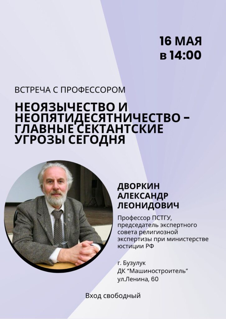По благословению епископа Бузулукского и Сорочинского Алексия , 16 мая пройдет встреча известного историка-религиоведа, профессора Александра Дворкина с духовенством и мирянами Бузулукской епархии. Начало встречи 14:00. ДК «Машиностроитель» ( ул. Ленина, 60). Тема встречи: «Неоязычество и неопятидесятничество — главные сектантские угрозы сегодня», а также ответы на вопросы.