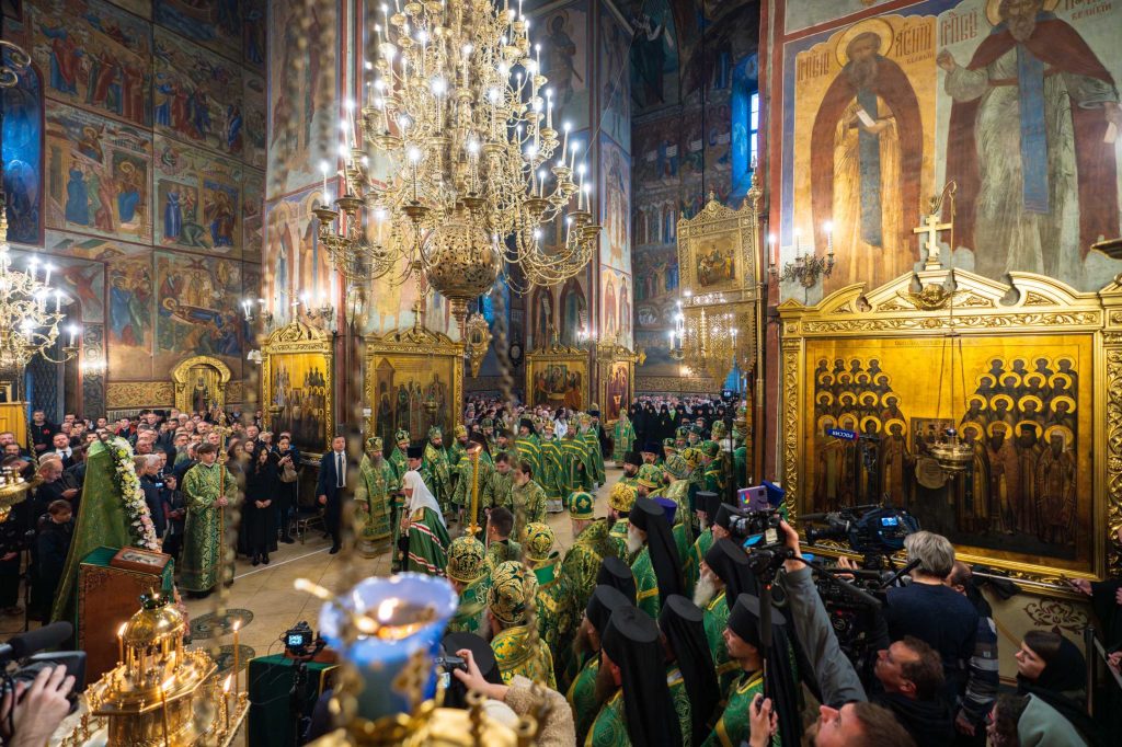В соборе молились архиереи, настоятельницы женских монастырей, священнослужители, монашествующие и паломники, прибывшие на торжества в Троице-Сергиеву лавру.