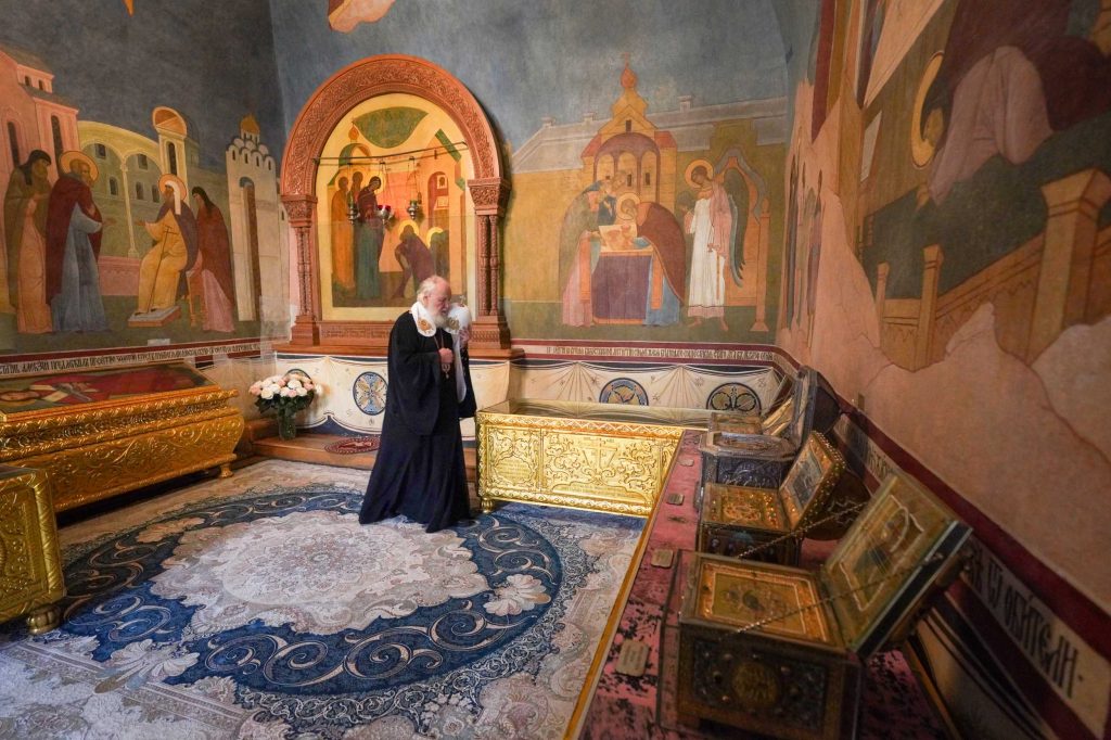 Далее Святейший Патриарх Кирилл проследовал в Троицкий собор, где совершил славление перед мощами преподобного Сергия Радонежского.