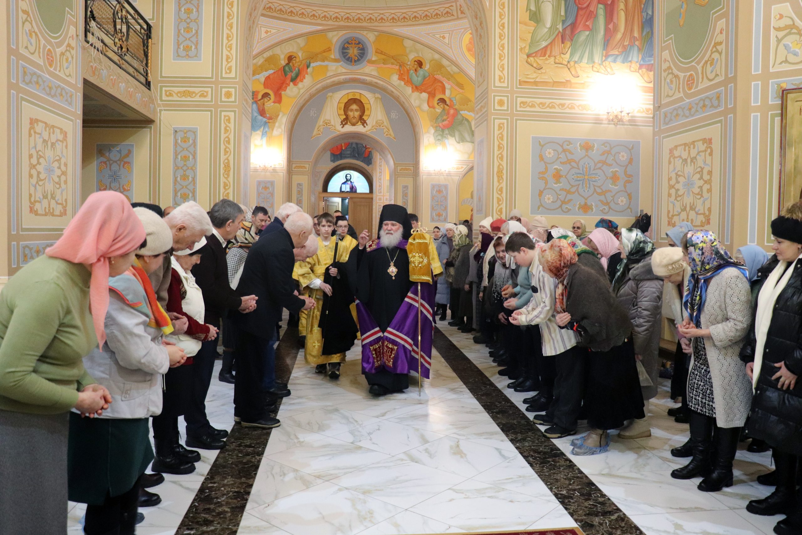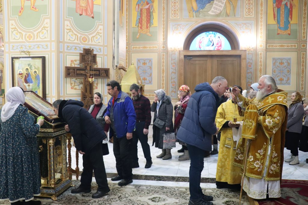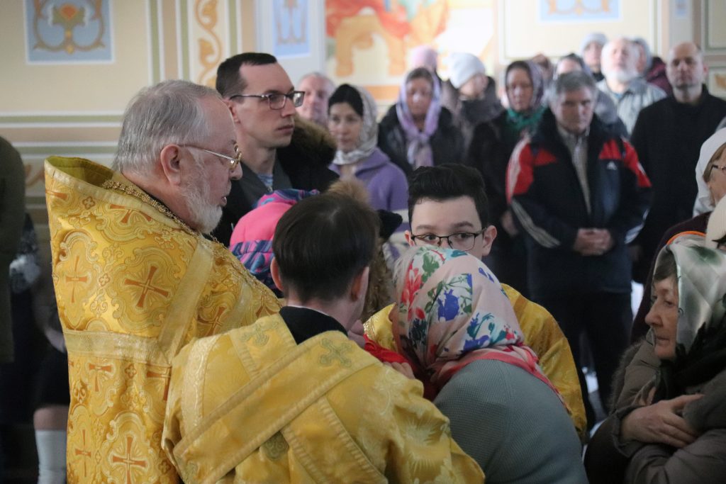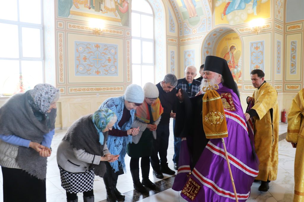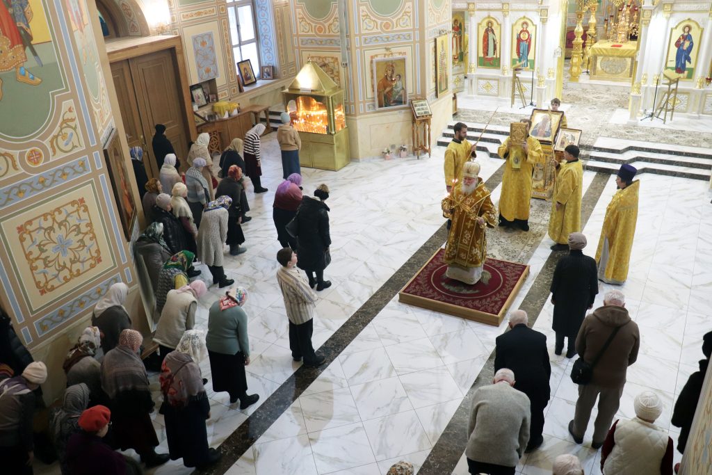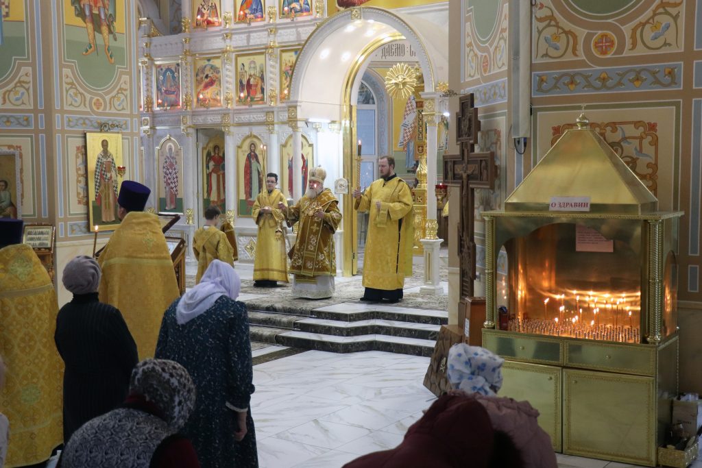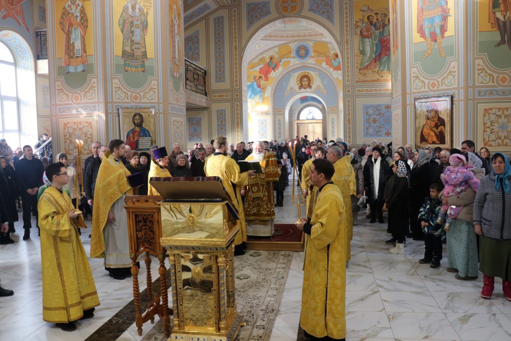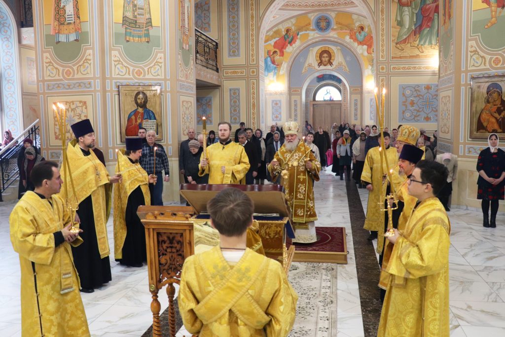 Бузулук. 22 февраля 2026 года, вНеделю сыропустную, Воспоминание Адамова изгнания, Прощеное воскресенье, Обретение мощей свт. Тихона (Беллавина), патриарха Московского и всея Руси (1992), епископ Бузулукский и Сорочинский Алексий совершил Божественную литургию и накануне всенощное бдение в Свято-Троицком кафедральном соборе.