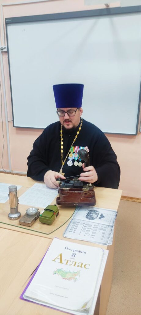 Отец Александр рассказал ребятам о своей службе в рядах Российской Армии, о быте солдат, показал свой армейский альбом, вещи, которые бережно хранит с тех дней.