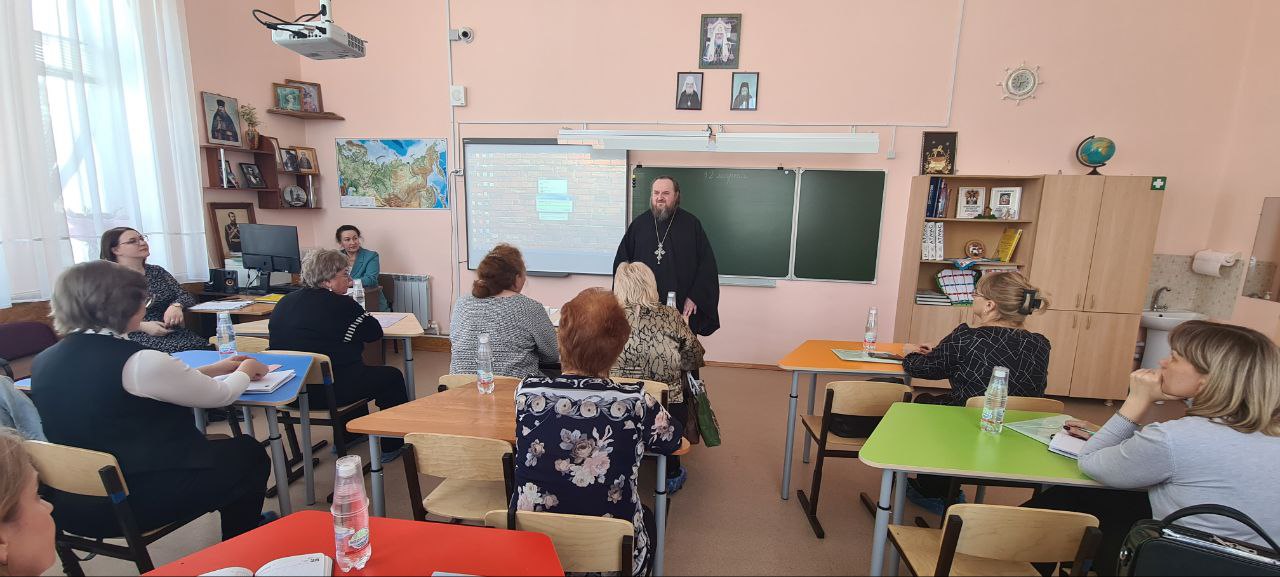 Затем перед учителями выступил иерей Артемий Шарипов, клирик Петропавловского храма. Он рассказал о роли учителя в преподавании этого важного курса, о культурообразующей роли православия в истории нашей страны.