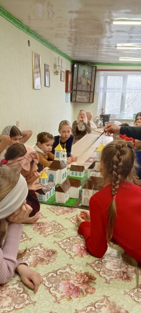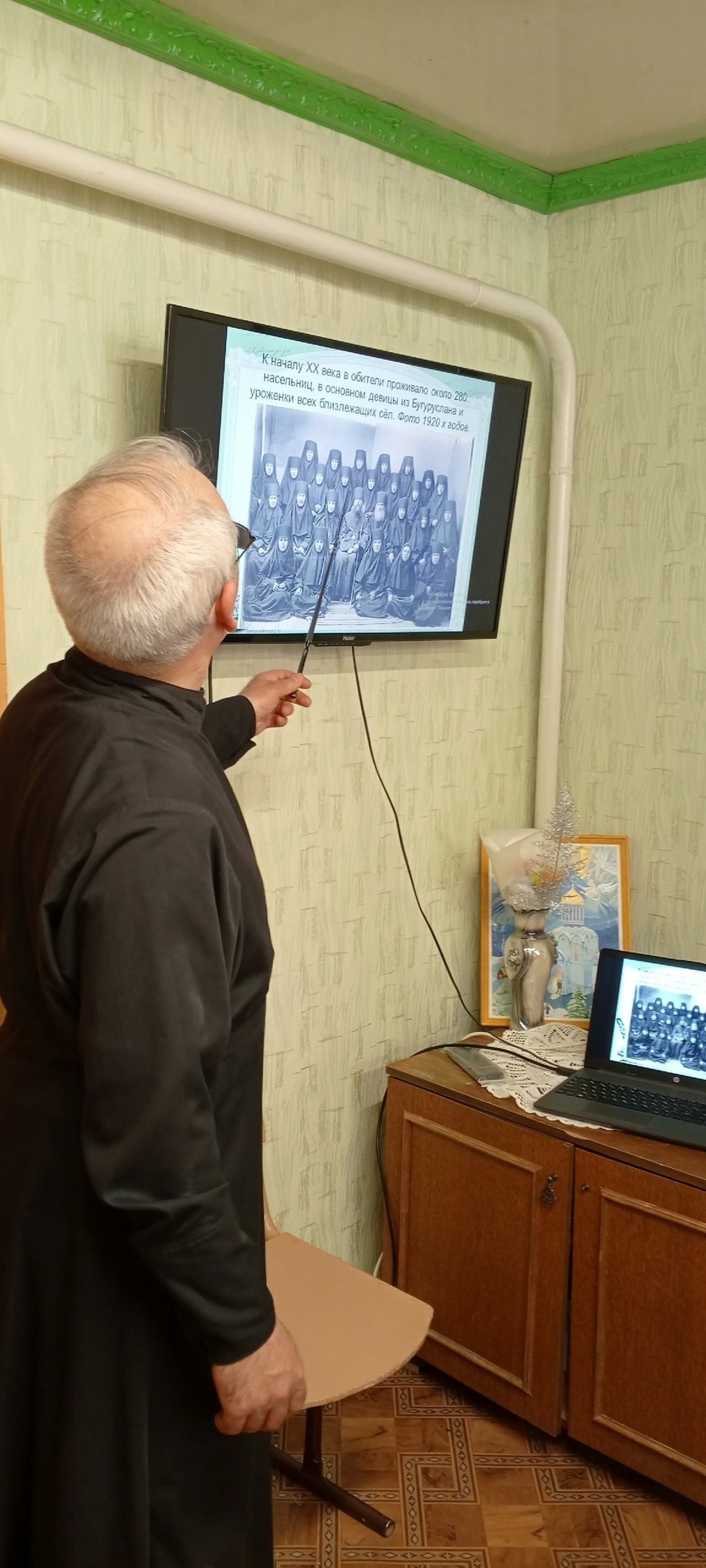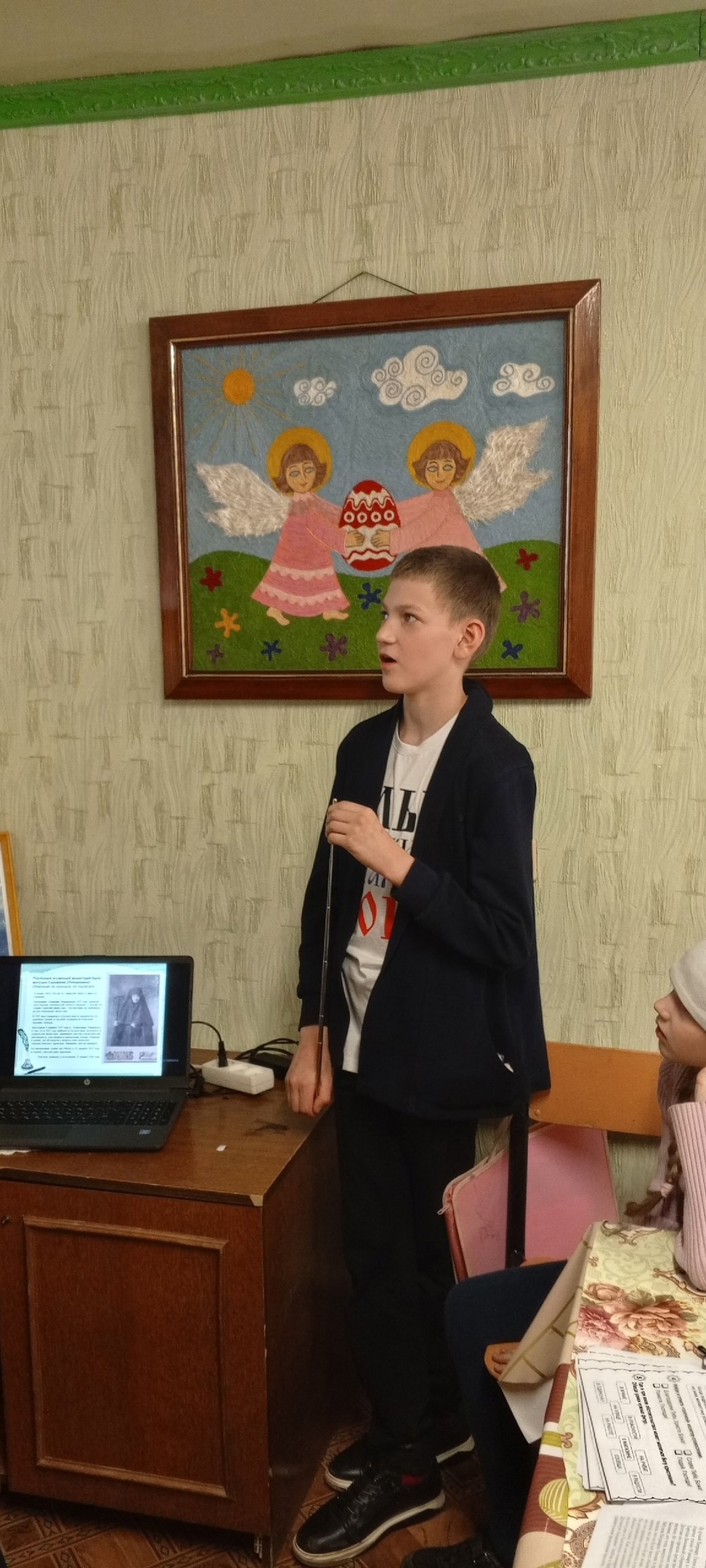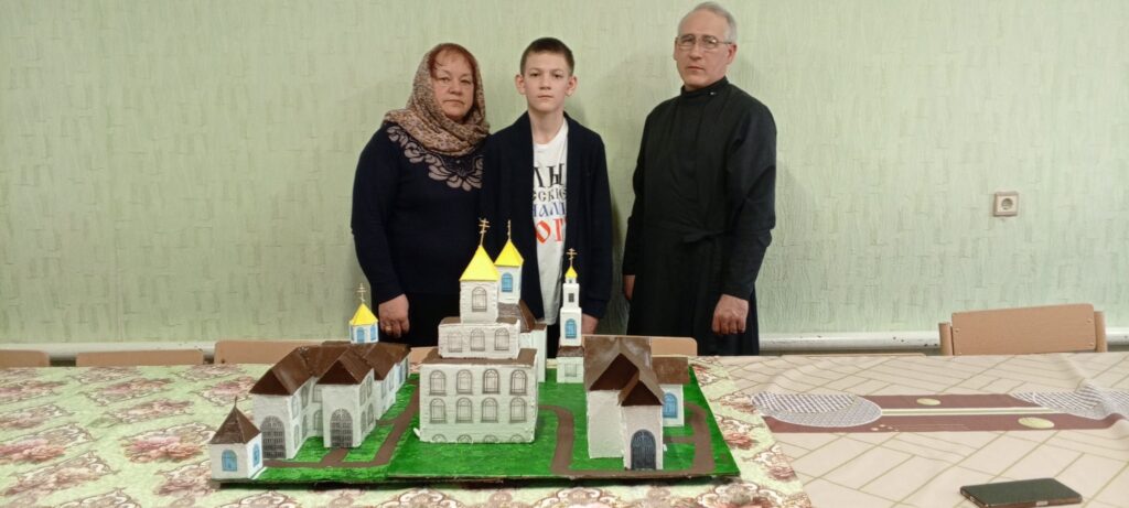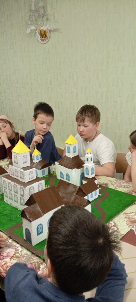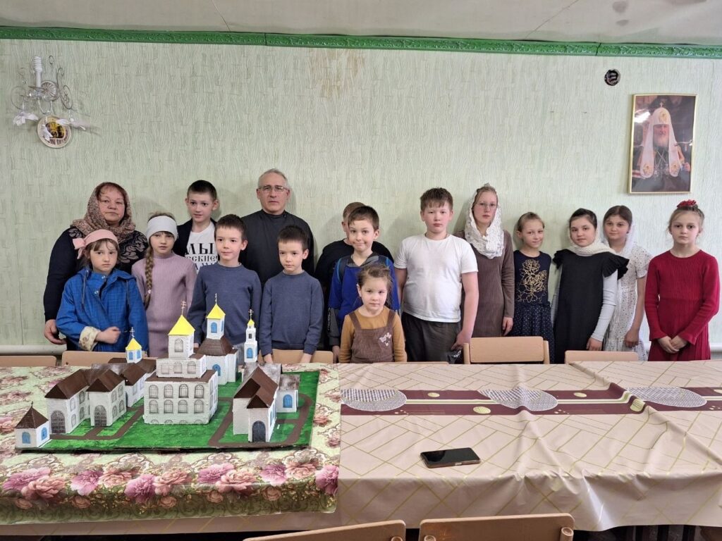 Вторая часть урока была посвящена разрушенному Покровскому женскому монастырю г. Бугуруслана, который является памятником культуры и архитектуры XIX в. Исследовательский проект на основе архивных и современных документов подготовлен воспитанником воскресной школы Сергеем Худайбердиевым. Проект выполнен в виде презентации и поделки макета монастыря. Ребята с интересом слушали выступление Сергея и Евгения Рудольфовича об истории Покровского женского монастыря, о судьбах монахинь монастыря, рассматривали его макет.