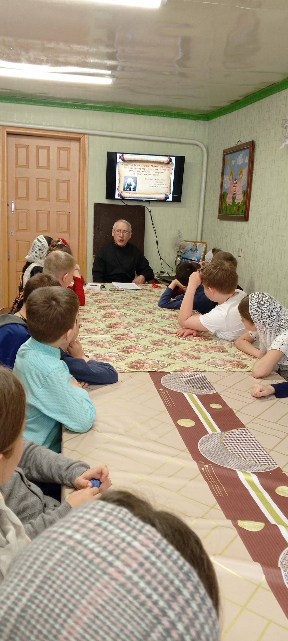 Евгений Рудольфович подготовил презентацию о святителе, рассказал детям о его житии. Будущий Патриарх Тихон в миру носил имя Василий Иванович Белавин. Он родился в 1865 году в маленьком селе Клин близ города Торопца Псковской губернии, в семье приходского священника Спасо-Преображенской церкви. Детство его прошло среди простого народа, он видел крестьянский труд и жил простой народной жизнью. Как сын священника, он учился в Торопецком духовном училище. Затем он поступил в Псковскую семинарию, и, блестяще ее окончив, — в Санкт-Петербургскую Духовную Академию. Любовь к Церкви, кротость, смирение, сердечная чистота, целомудрие, удивительная врожденная простота, постоянная доброжелательность ко всем, особенный дар рассудительности – все это сделало Василия Белавина любимцем товарищей-студентов, которые шутя называли его Патриархом. В те времена не могло и в голову прийти, что это шуточное прозвище окажется пророческим, потому что патриаршества тогда в России не существовало.