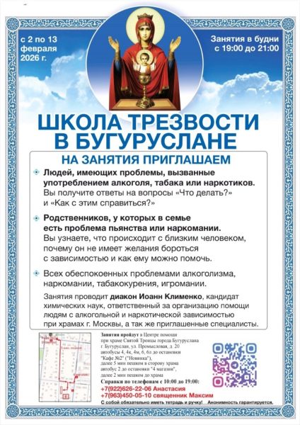 «Трезвость – это естественное состояние ясности сознания человека, данное ему от рождения». Высказывание диакона Иоанна Клименко наводит на мысль, что жизнь без заблуждений и зависимостей начинается, когда взрослый человек сознательно выбирает внутреннюю свободу и ясное мышление. Трезвость – основа человеческого потенциала. Программа, реализующаяся в Свято-Троицком соборе г. Бугуруслан, стартовавшая в минувший понедельник, даёт жителям Бугуруслана […]